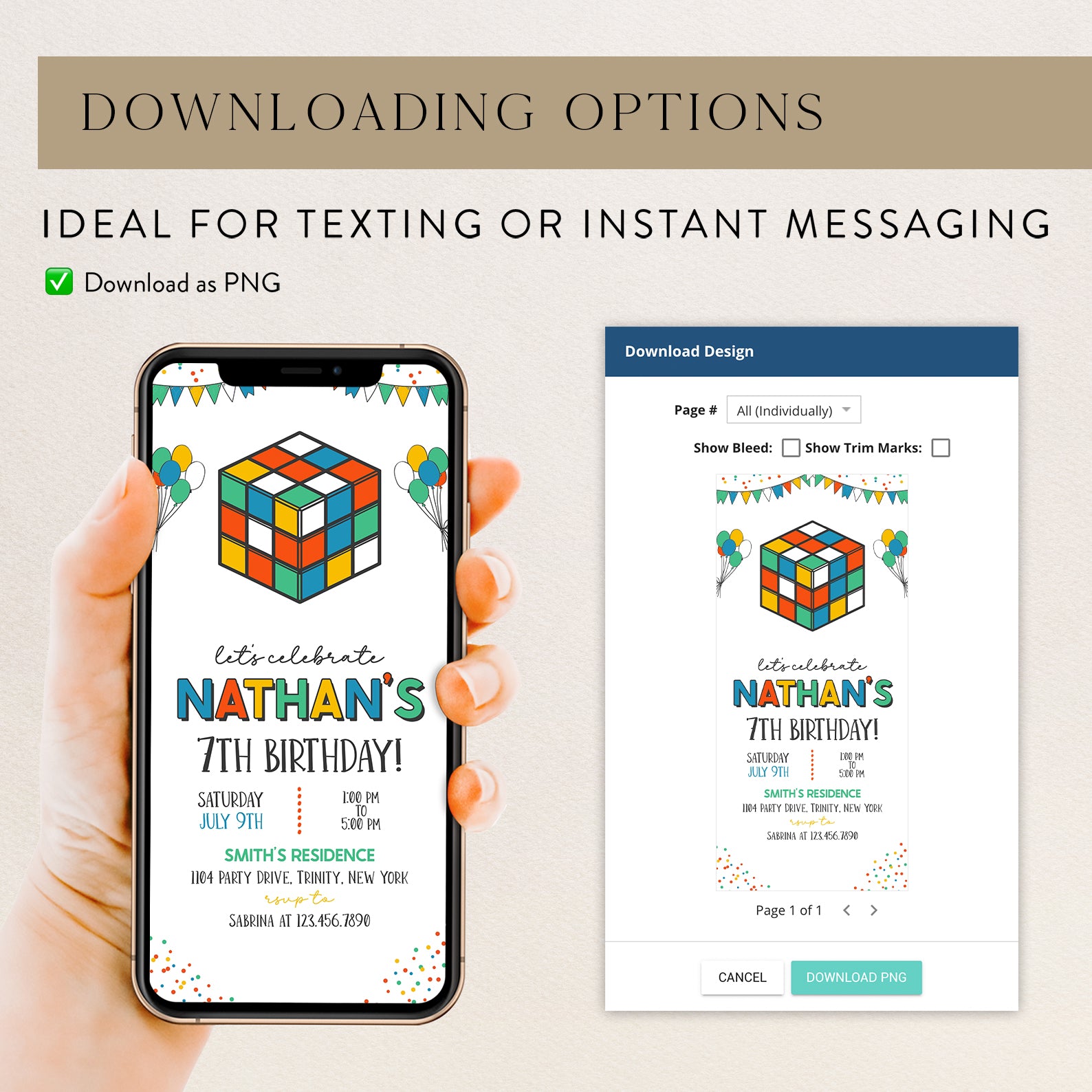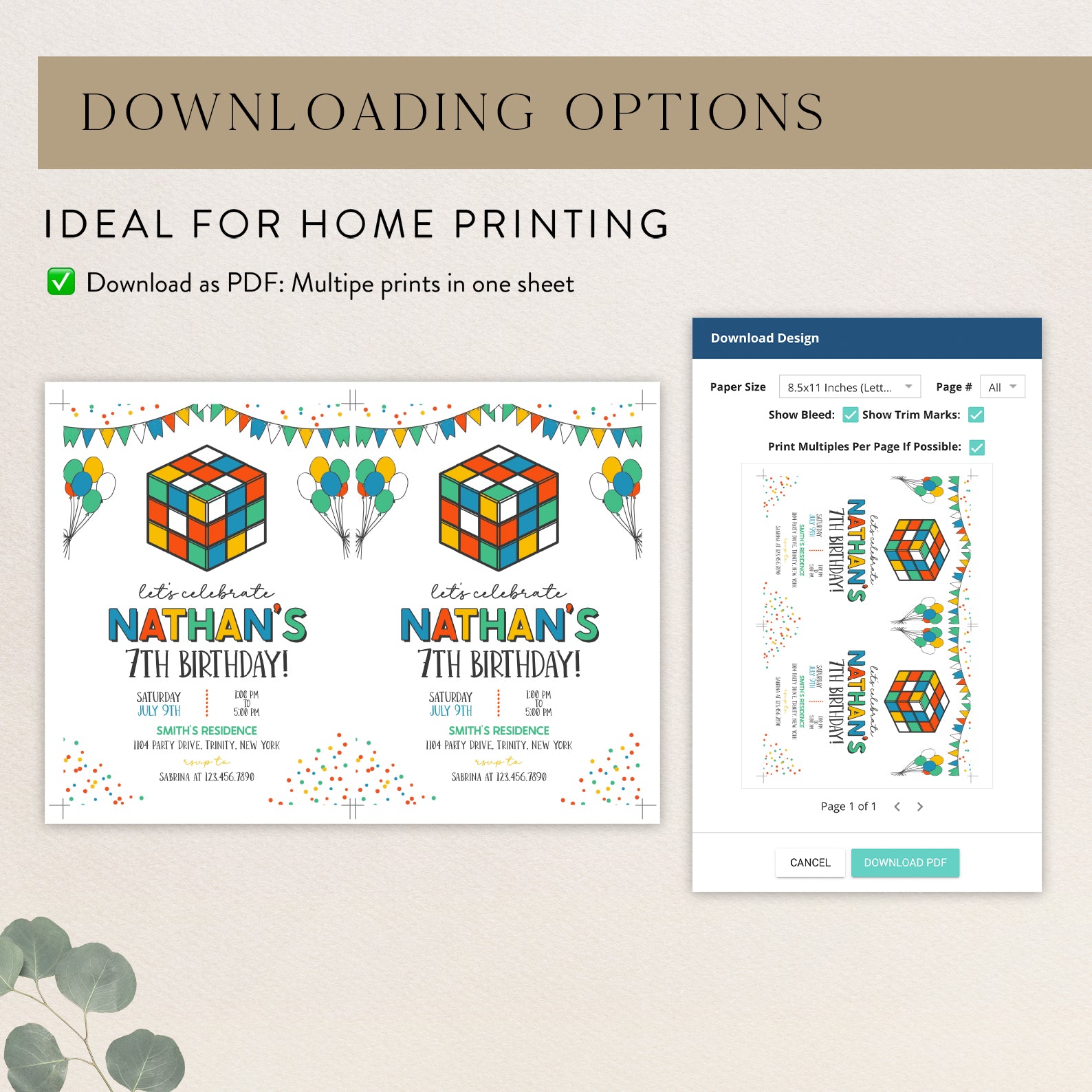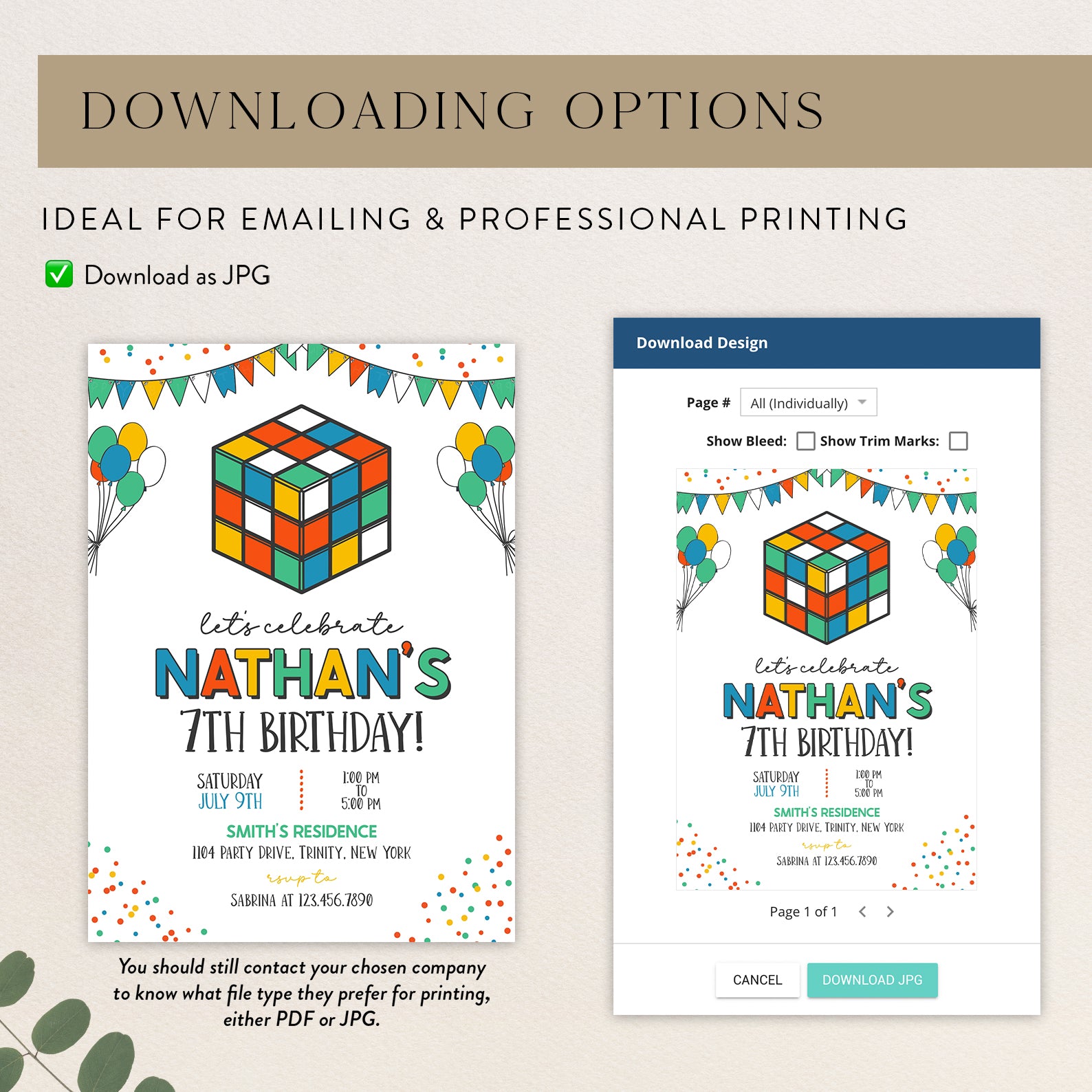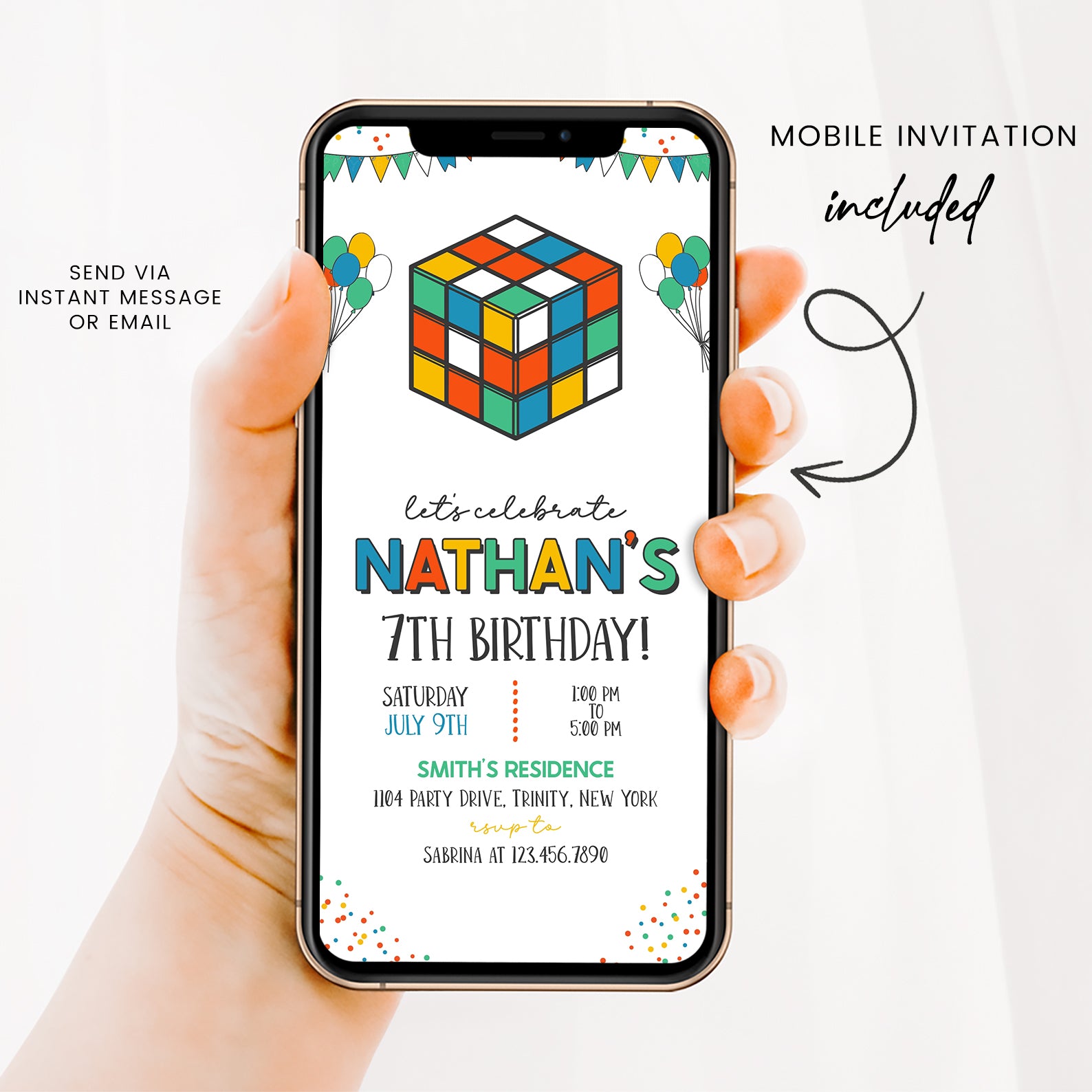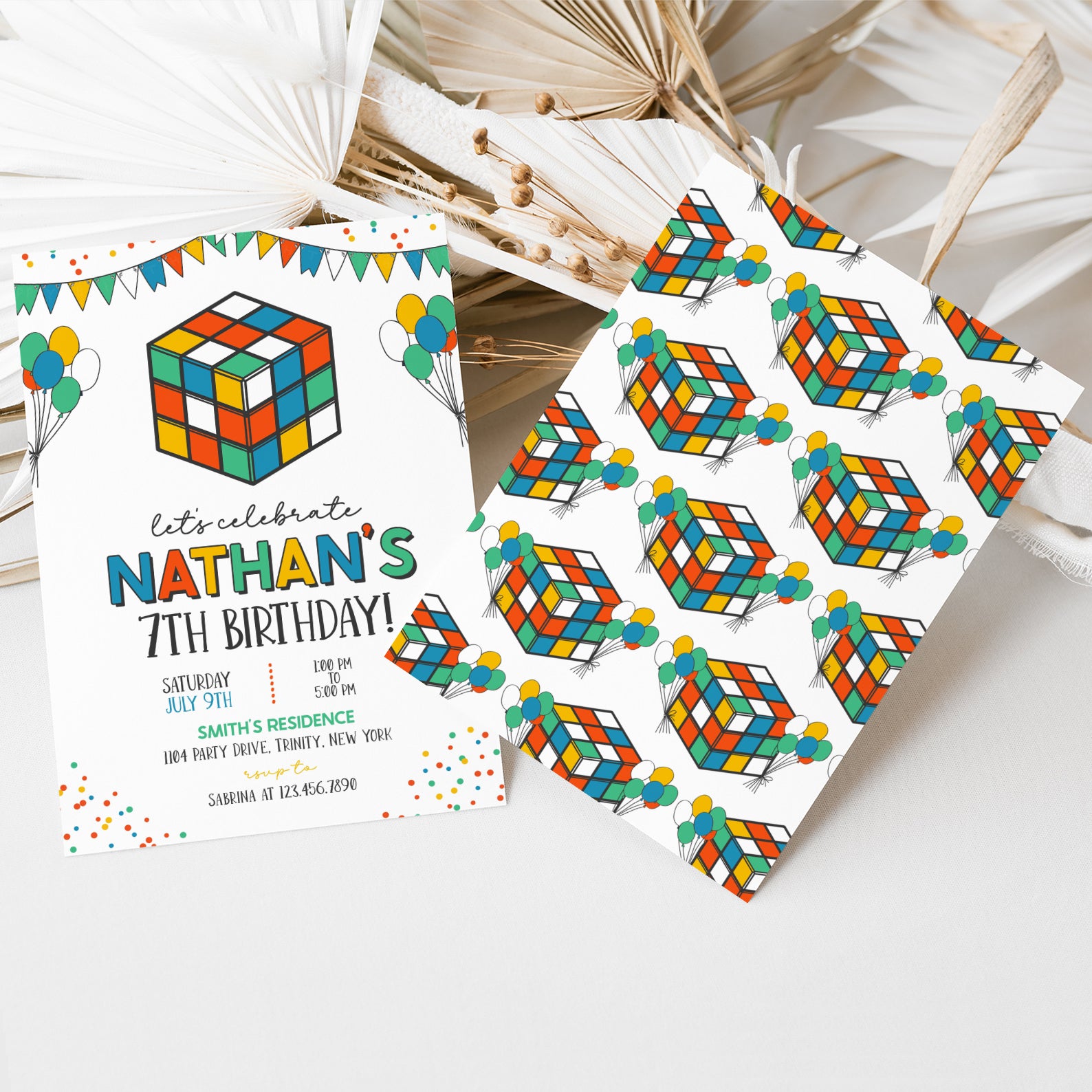 - Purchase this 7th Birthday Party Invite: Rubik’s Cube & Balloons template