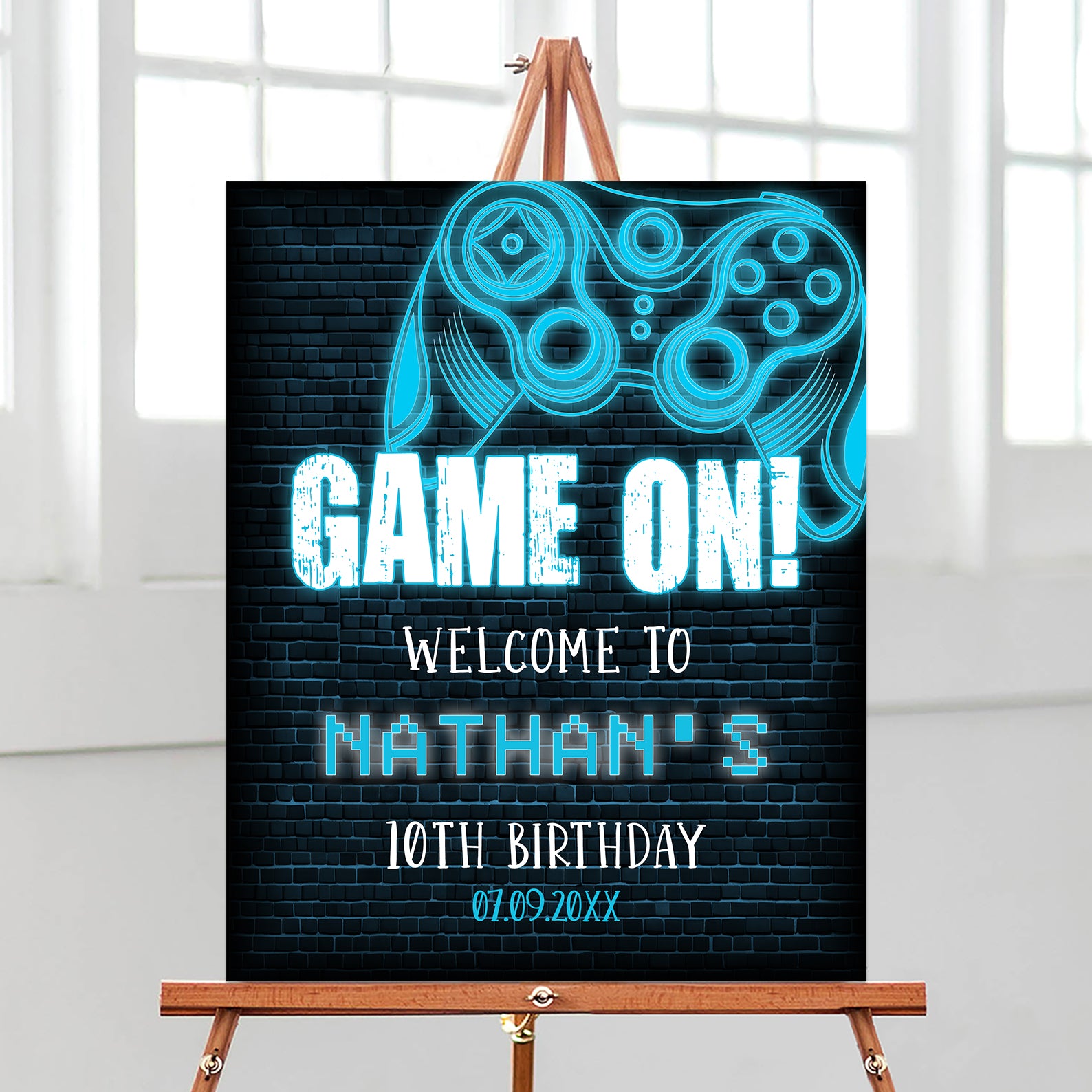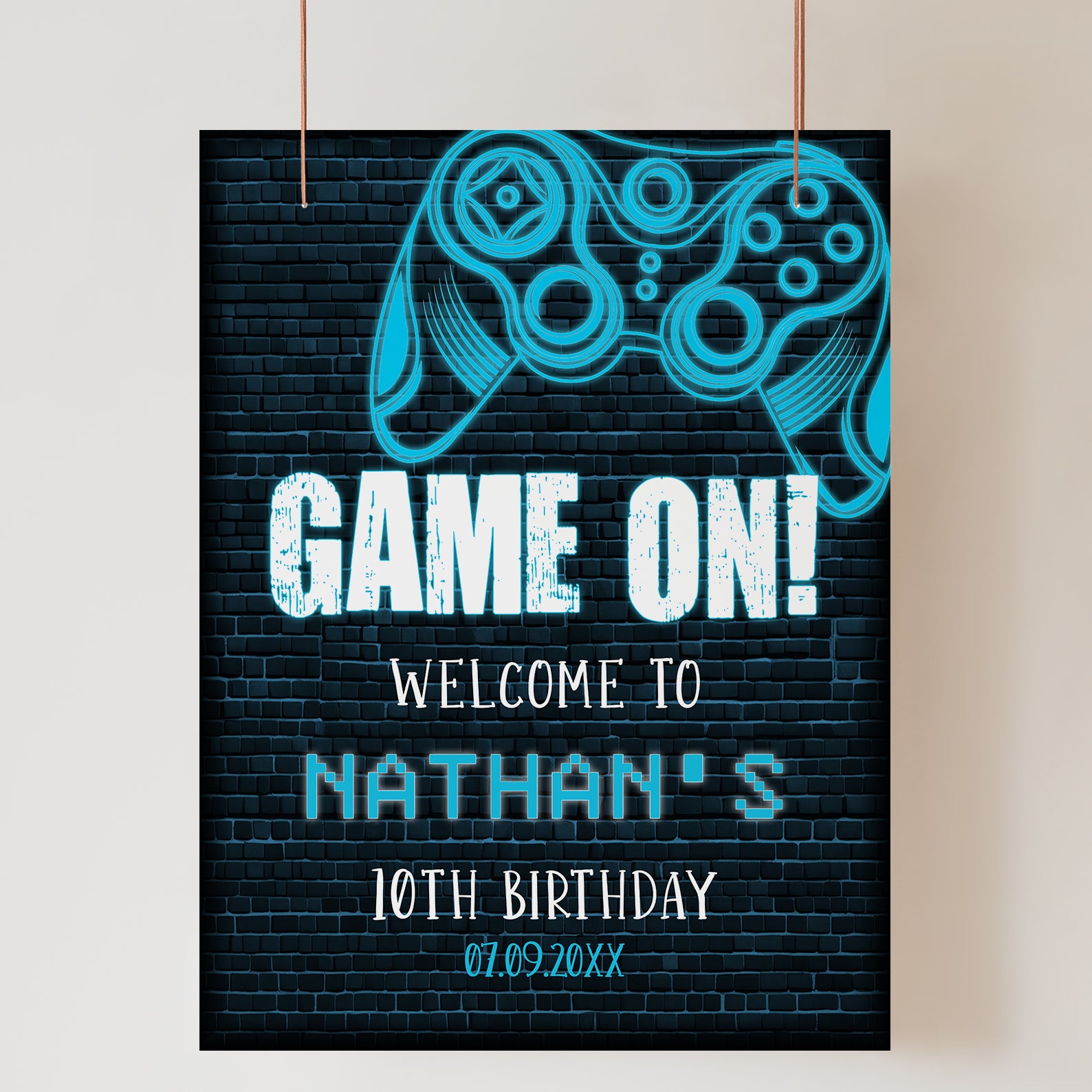 Power up the party with our "Game On!" digital welcome sign—perfect for greeting guests at your gamer’s 10th birthday celebration! Featuring a bold blue neon gaming controller set against a sleek brick wall background, this design brings all the energy of an epic gaming session right to your party entrance. Whether you're hosting at home or at a venue, this vibrant sign sets the stage for a fun-filled day of virtual adventures and real-life memories. A must-have for any gaming fan turning double digits!