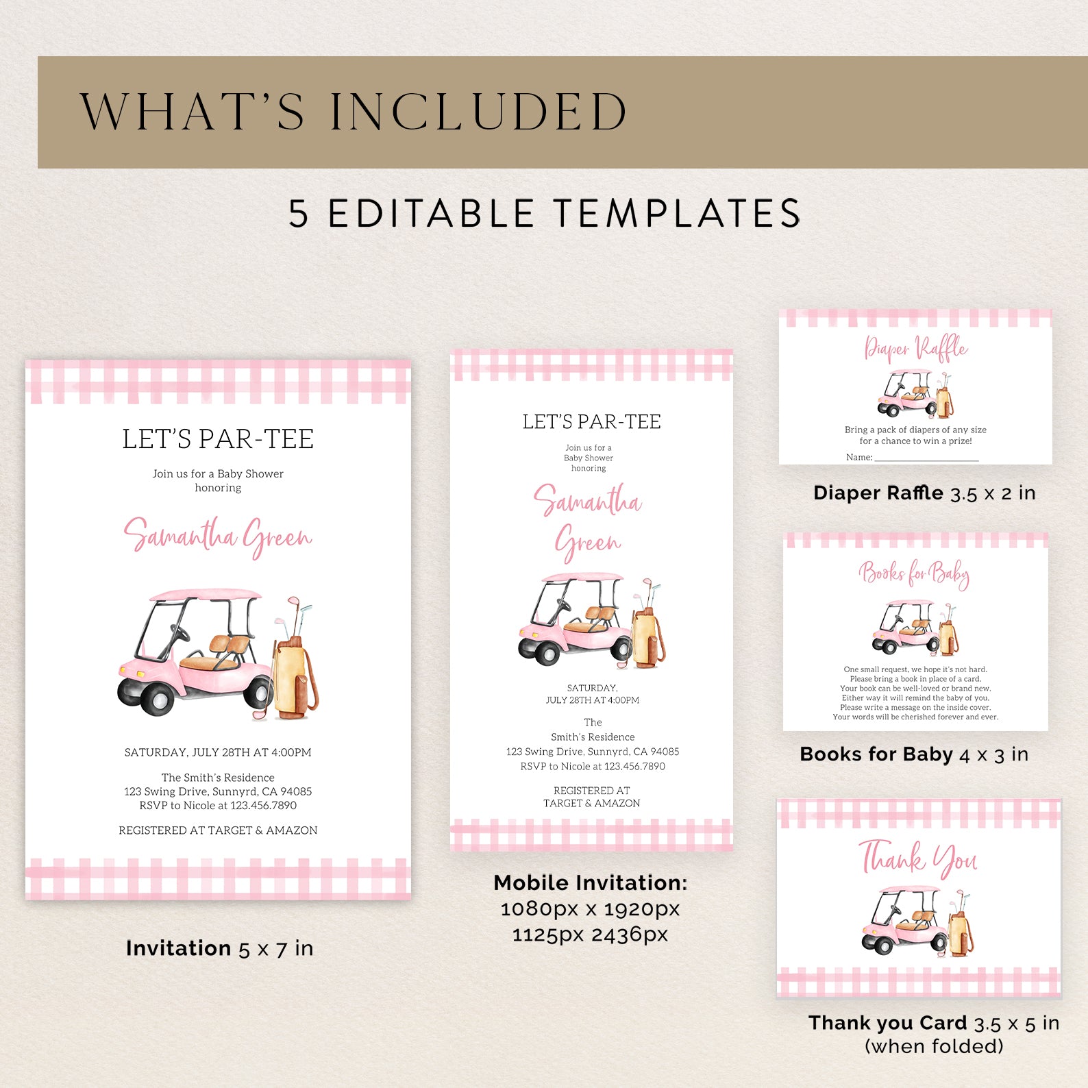 - Purchase this Let's Par-Tee Summer Baby Shower Invitation Bundle with Golf Cart template