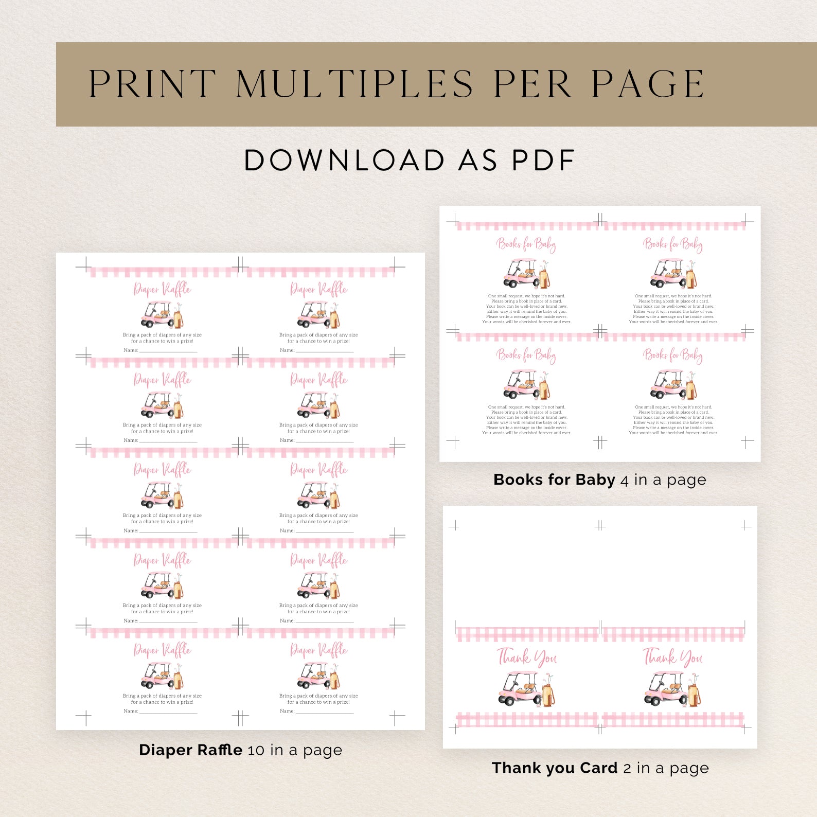 Introducing our summer baby shower invitation bundle, perfect for golf-loving families! This set includes an invitation, mobile invitation, diaper raffle, books for baby, and thank you card, all featuring a fun golf cart and club design. Choose from vibrant pink, green, or blue themes, and enjoy the playful checkered plaid borders. Easy to customize, this bundle will set the tone for a memorable celebration full of joy and excitement!