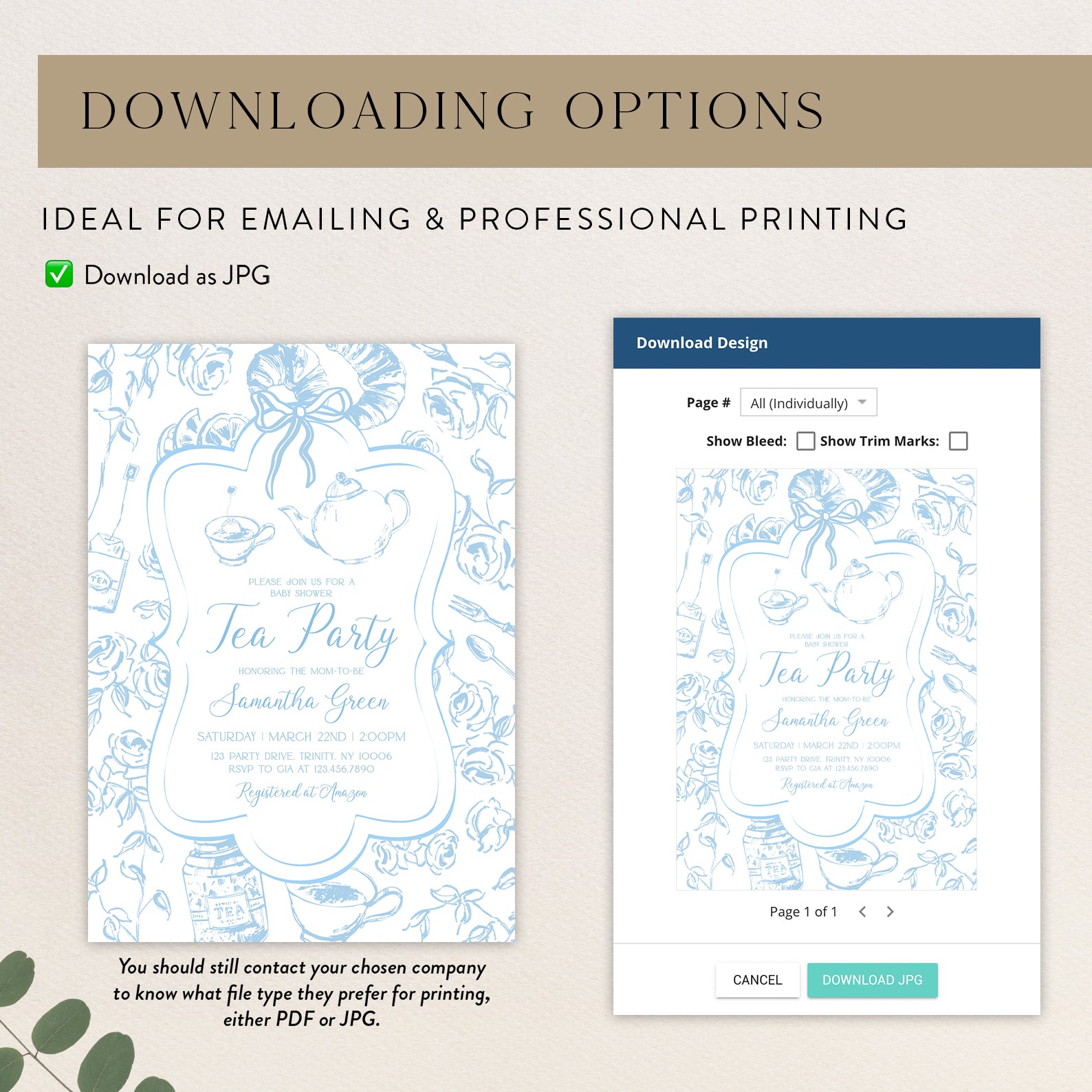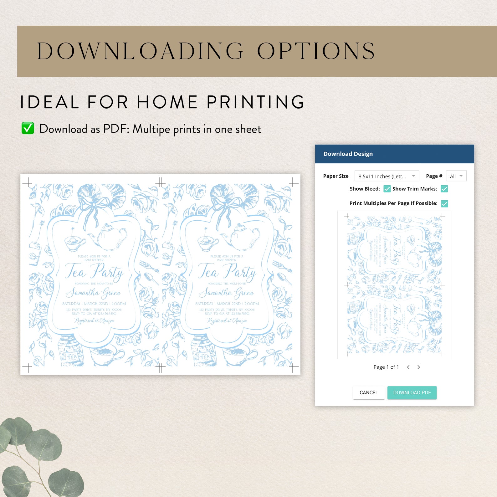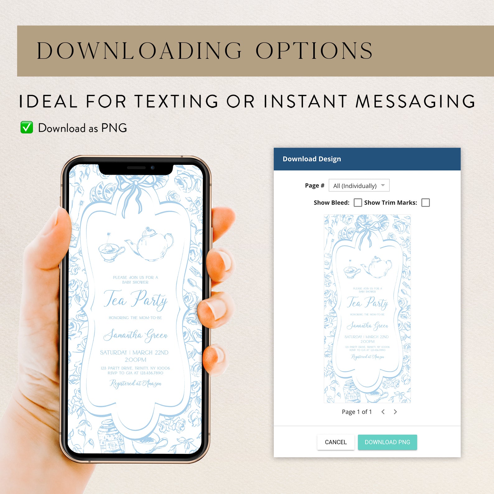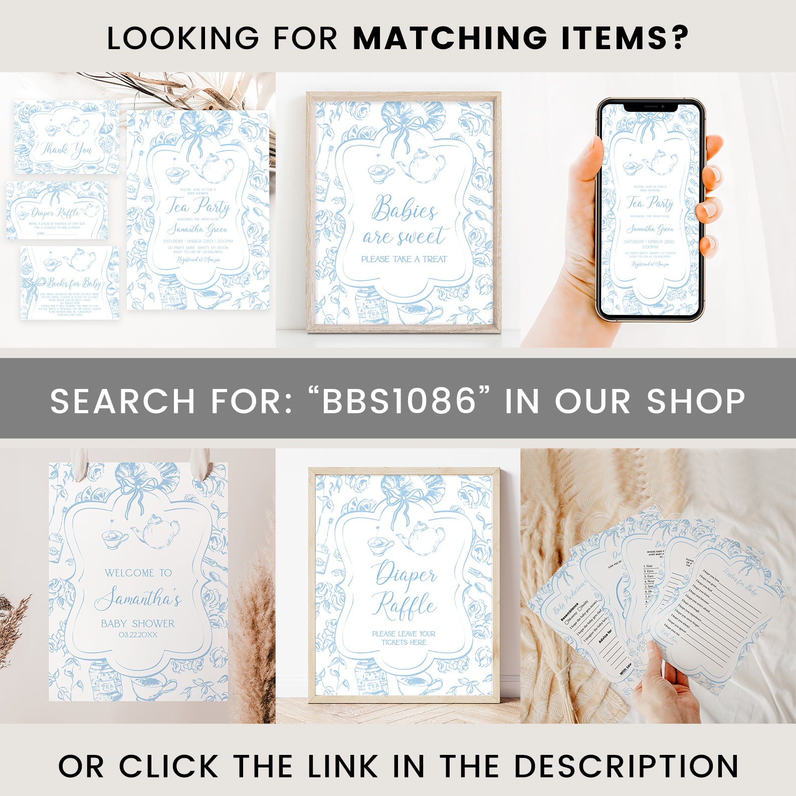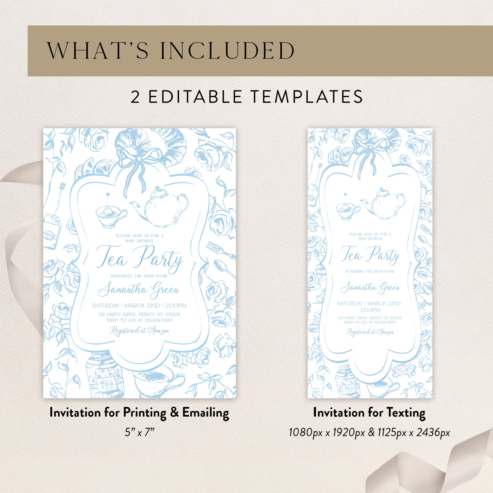 1. Purchase this Blue Tea Party Baby Shower Invitation Bundle with Floral Accents template