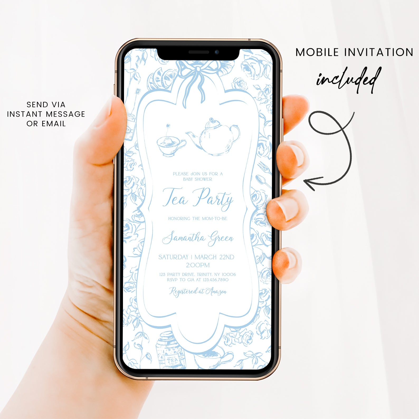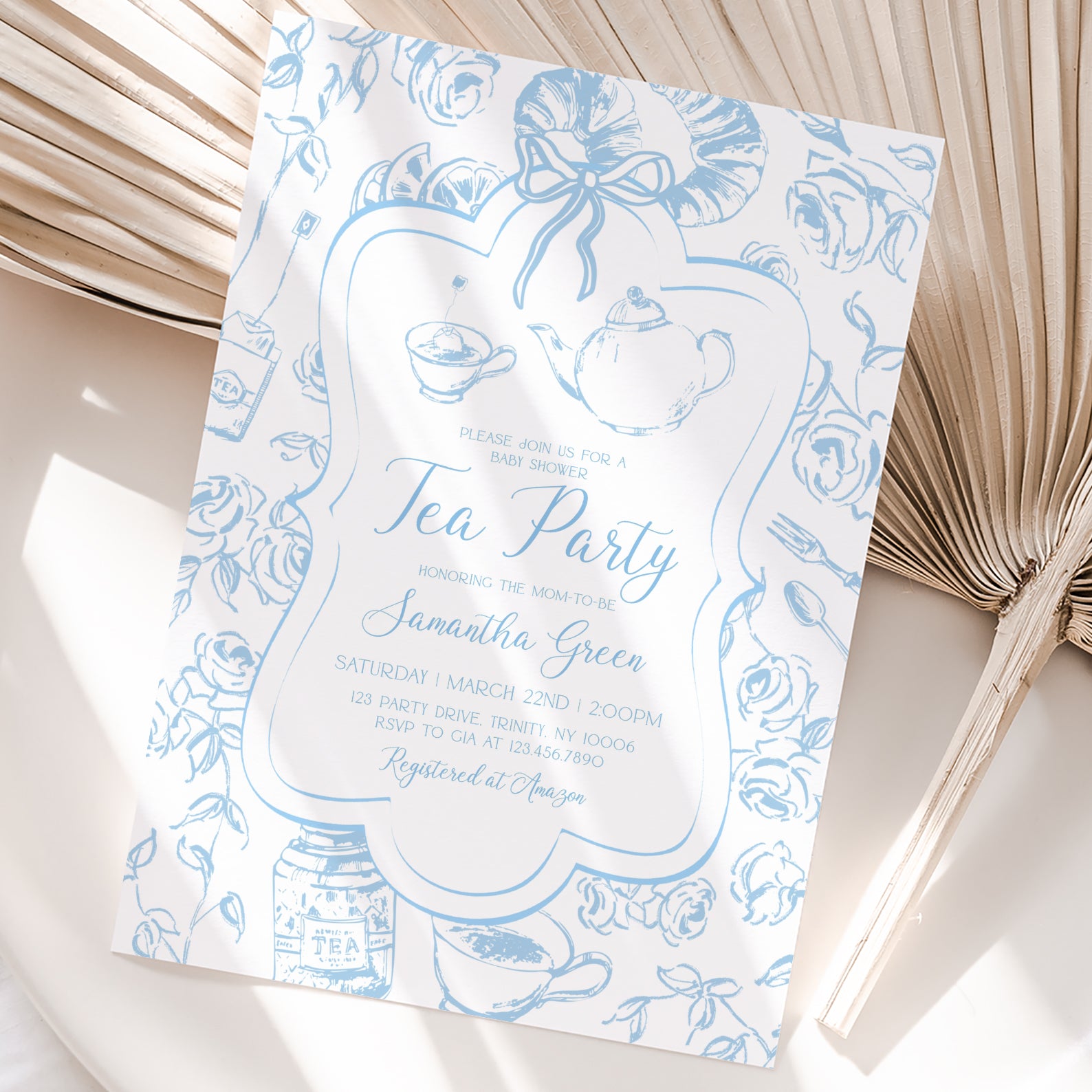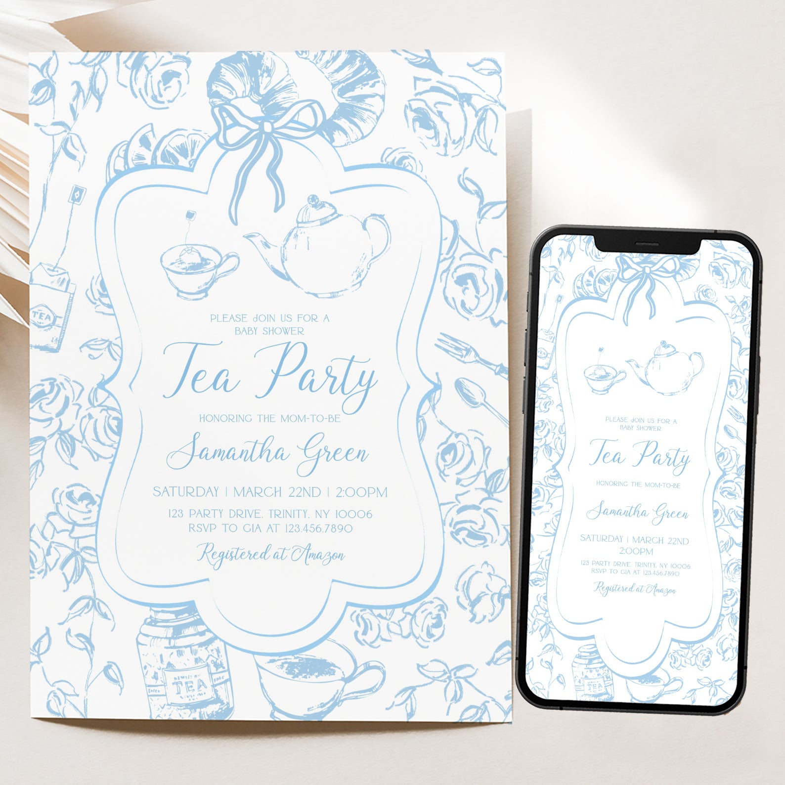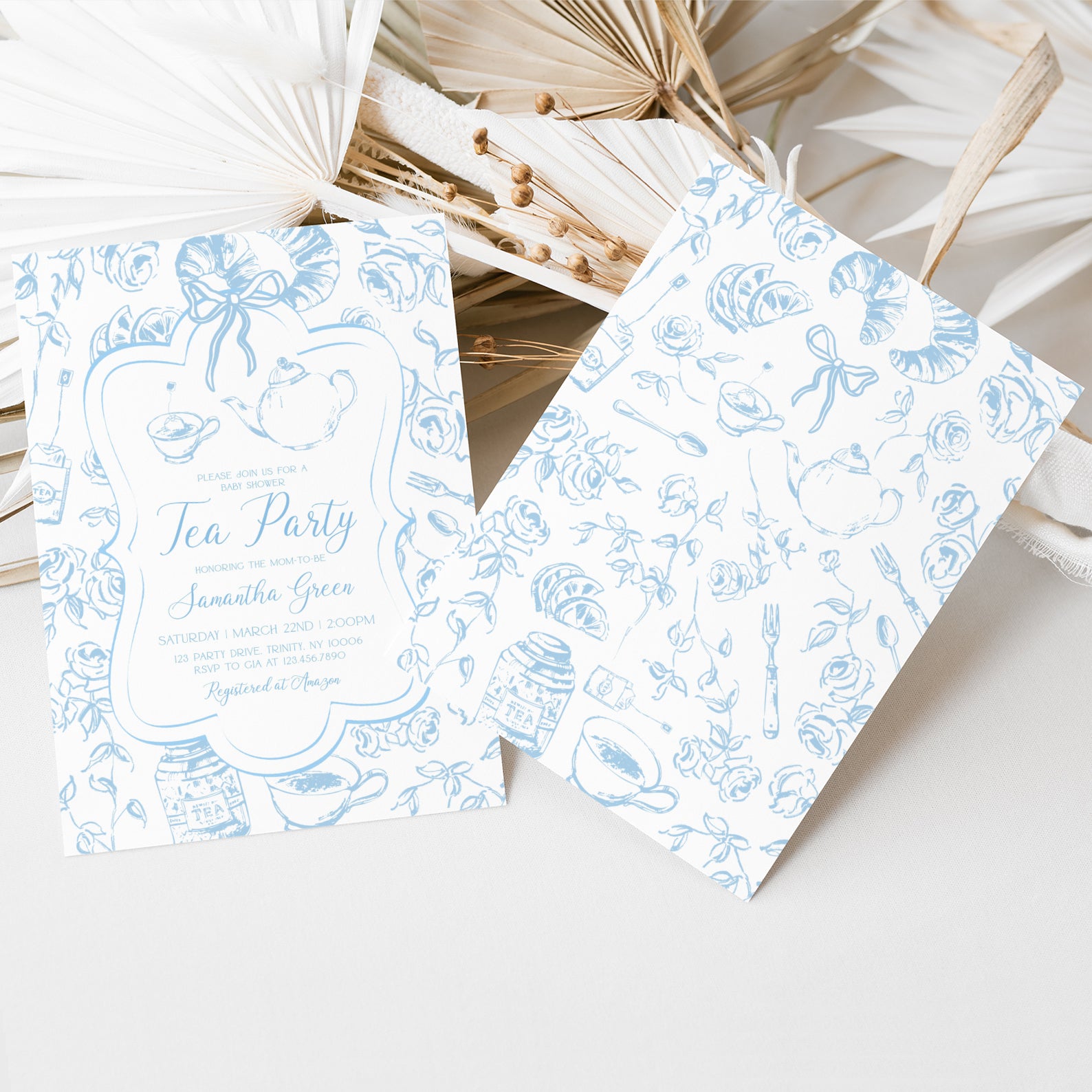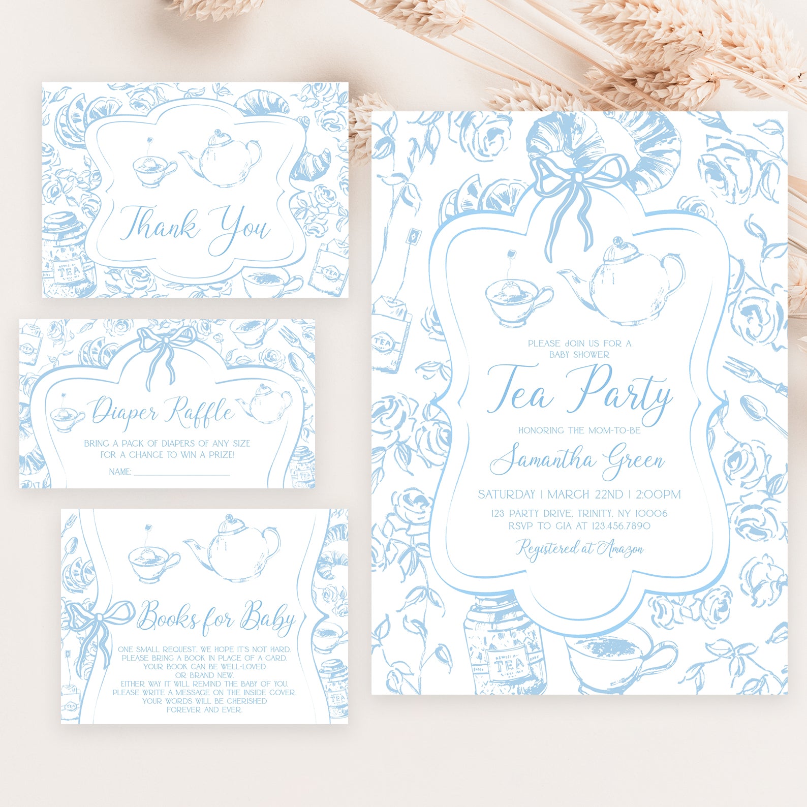 Blue Tea Party Baby Shower Invitation Bundle with Floral Accents