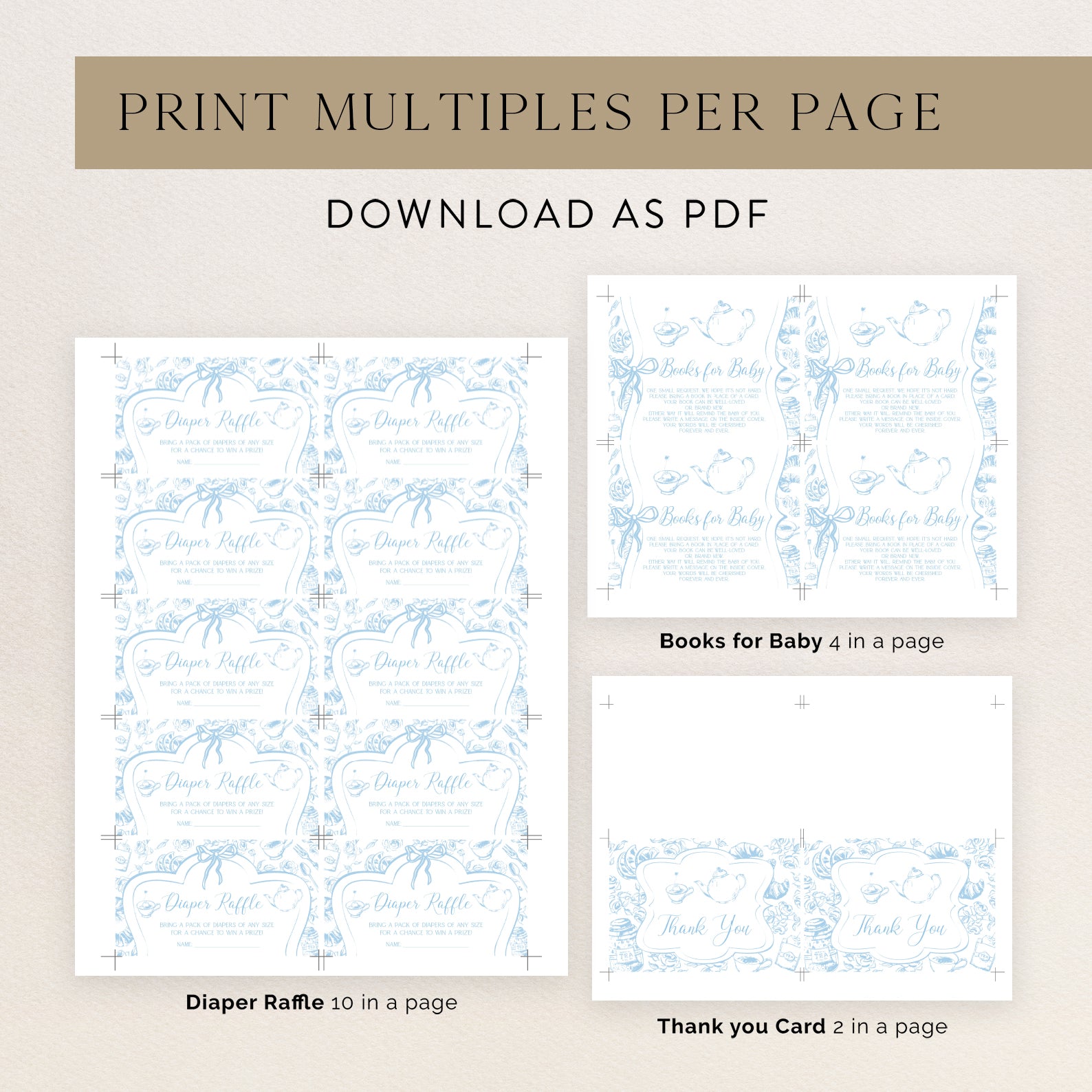 Celebrate your little one with this elegant tea party-themed baby shower bundle! Featuring a fancy-shaped design with a ribbon, a teapot pouring into a teacup, and a seamless floral background, this set includes everything you need—invitation, mobile invite, diaper raffle, books for baby, and thank you card. Available in green, pink, and blue, it's perfect for coordinating with your shower theme.