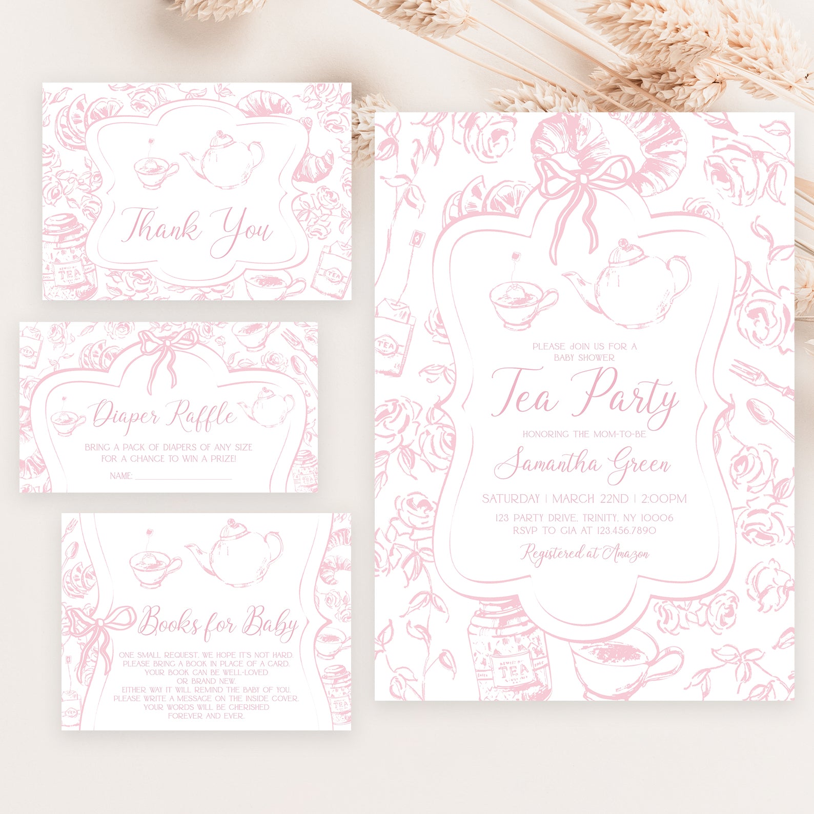 Pink Tea Party Baby Shower Invitation Bundle with Floral Accents
