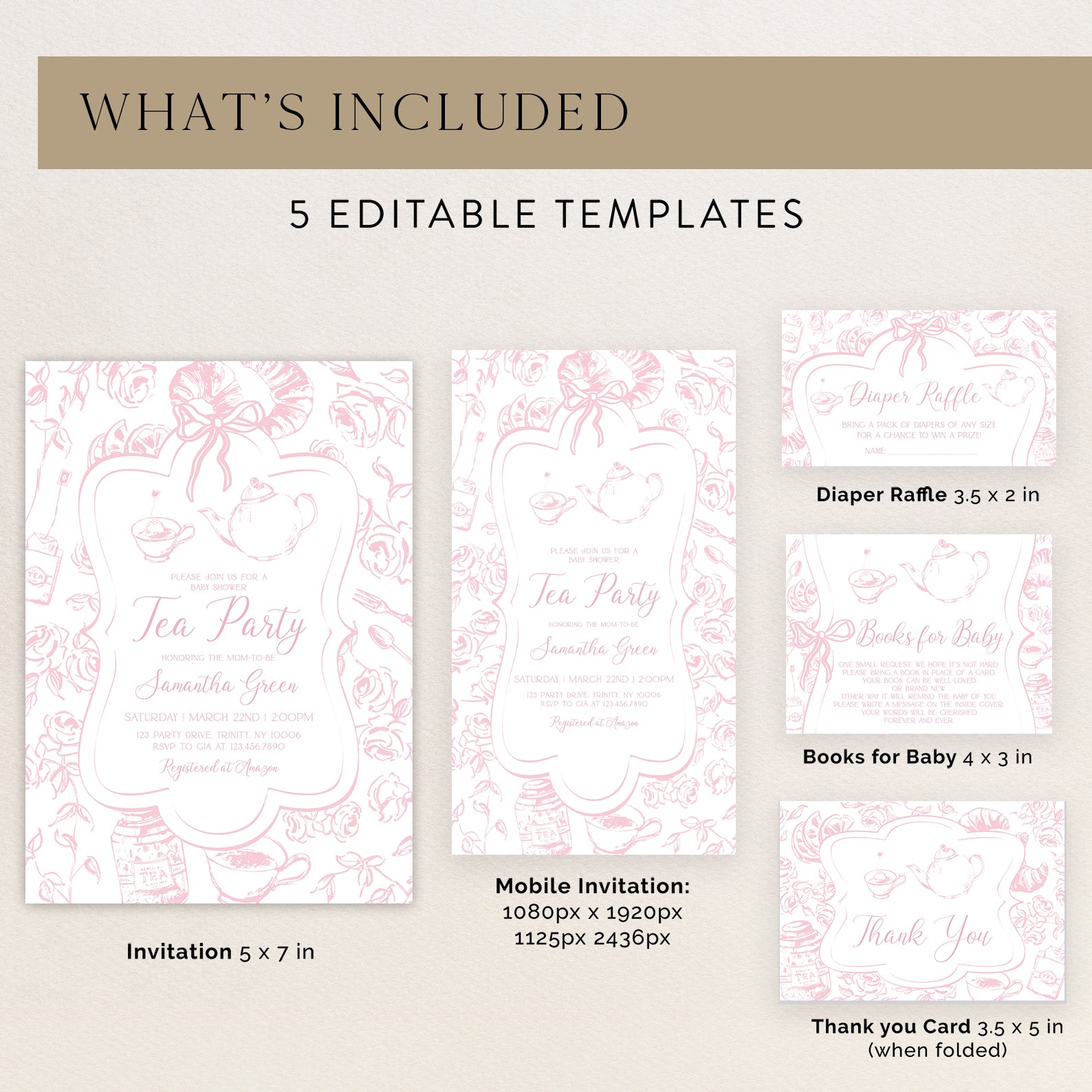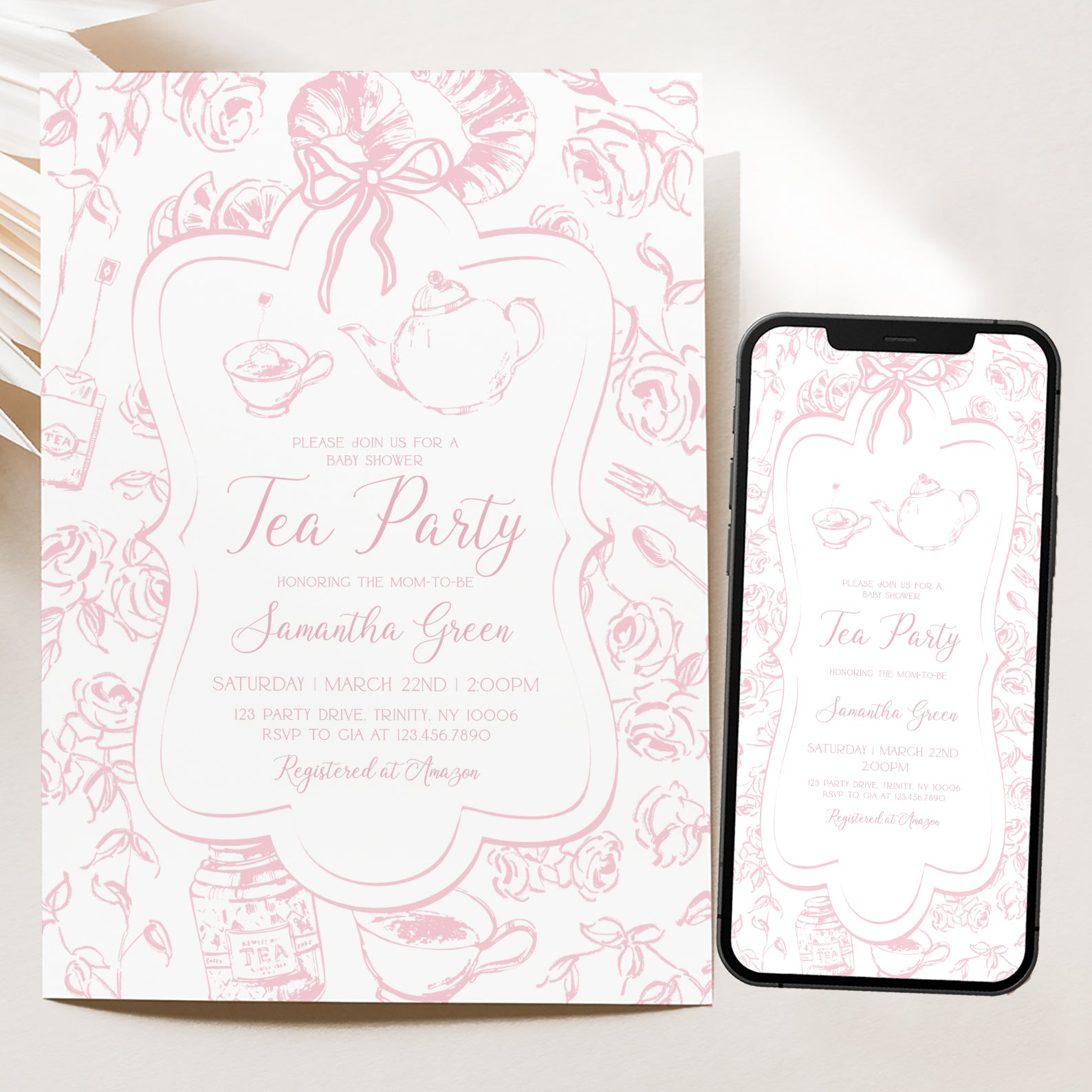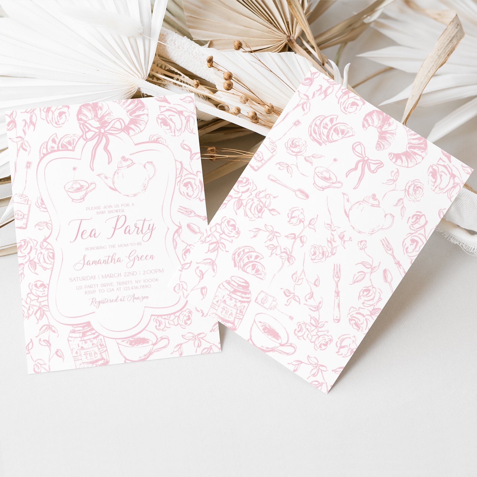 - Purchase this Pink Tea Party Baby Shower Invitation Bundle with Floral Accents template