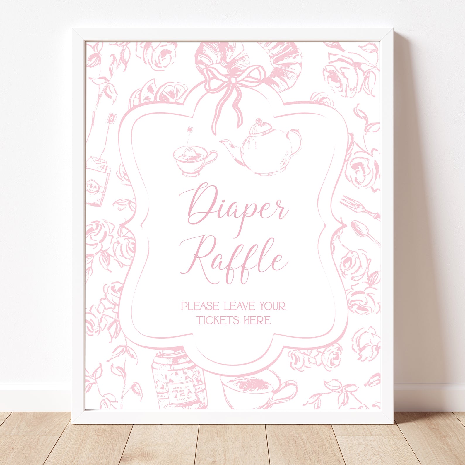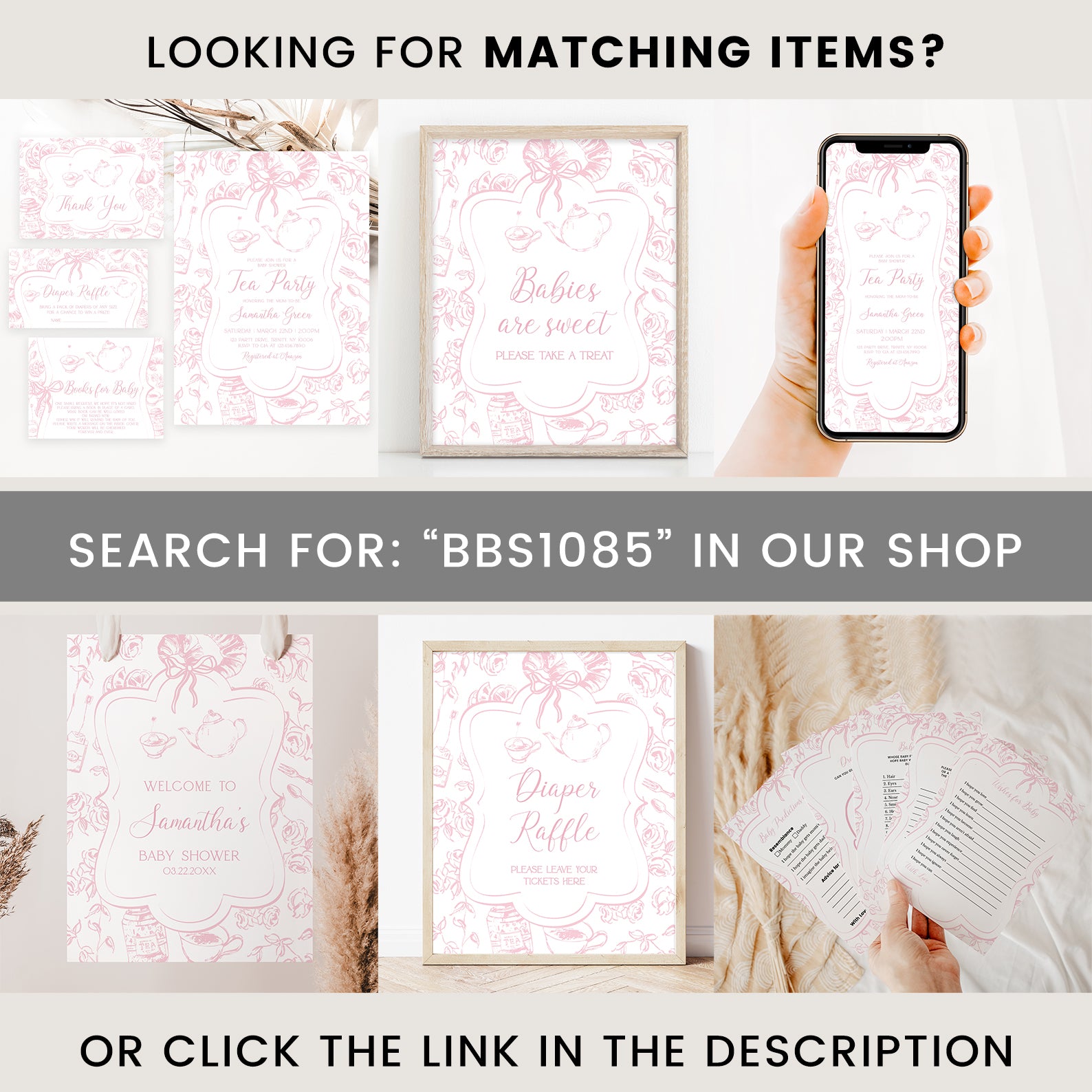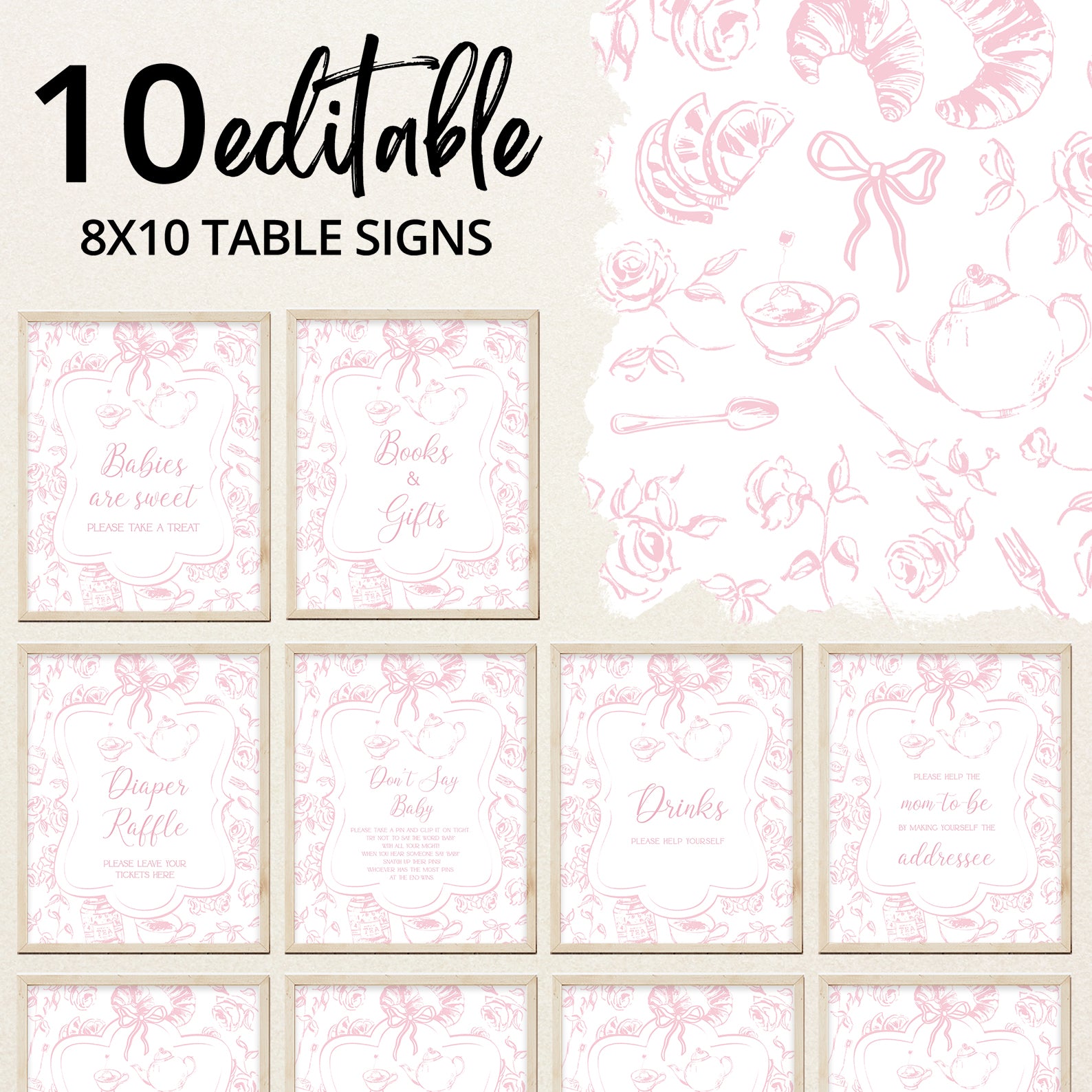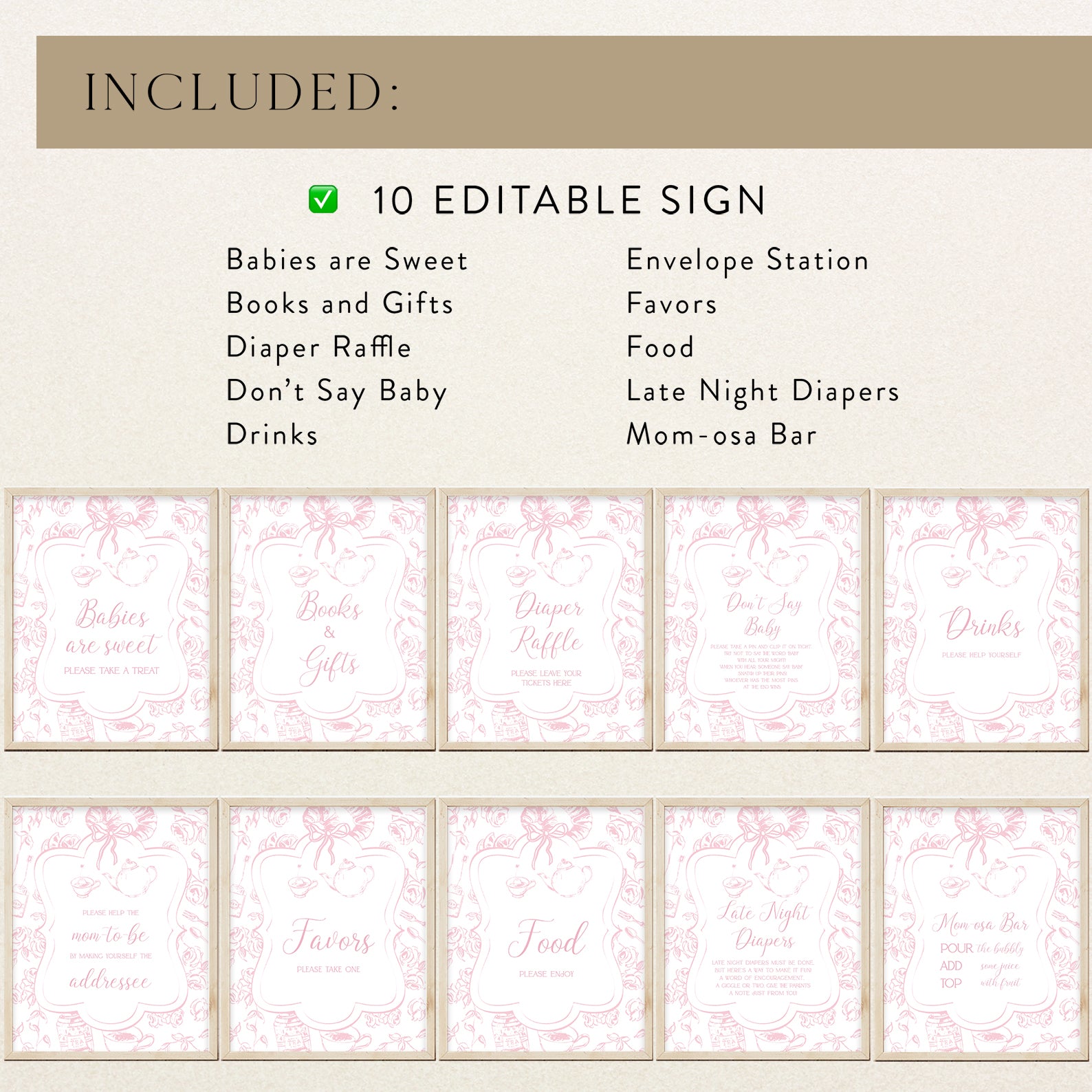 Elevate your baby shower with this charming set of ten editable table signs, perfect for a tea party-themed celebration! Each sign features a whimsical teapot pouring into a teacup, delicate ribbon accents, and a seamless floral background in your choice of green, pink, or blue. This set includes Babies Are Sweet, Books and Gifts, Diaper Raffle, Don't Say Baby, Drinks, Envelope Station, Favors, Food, Late Night Diapers, and Mom-osa Bar—bringing a coordinated, elegant touch to your event.