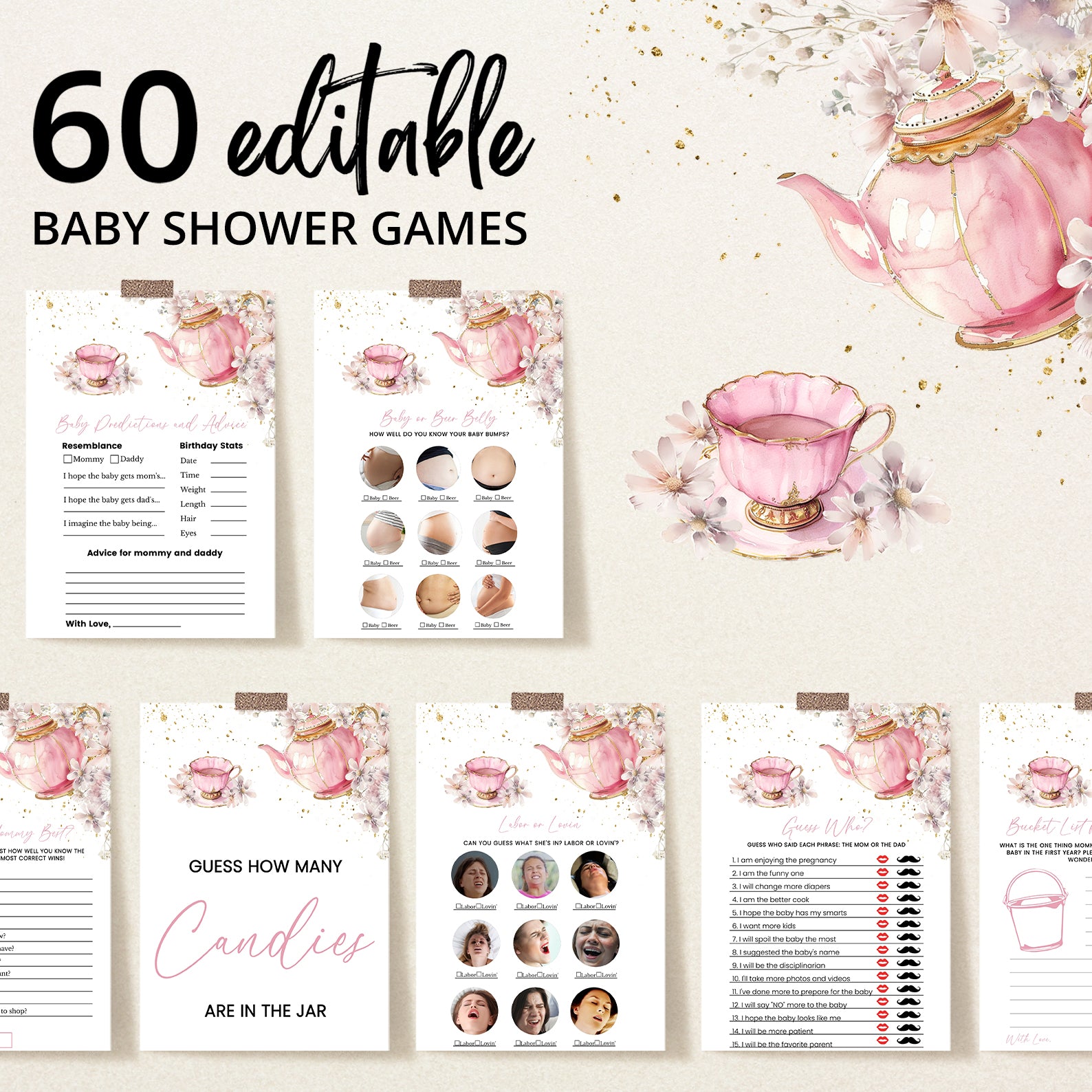 Add a touch of charm and elegance to your tea party-themed baby shower with this delightful bundle of 60 editable baby shower games. Featuring whimsical wildflowers, soft pink tones, and delicate gold accents, this collection perfectly complements your tea party celebration. Fully customizable, each game allows you to add a personal touch, ensuring your guests have a fun and memorable time. Whether you're hosting a cozy afternoon tea or an elegant garden gathering, this bundle adds the perfect balance of playfulness and sophistication to your special day.