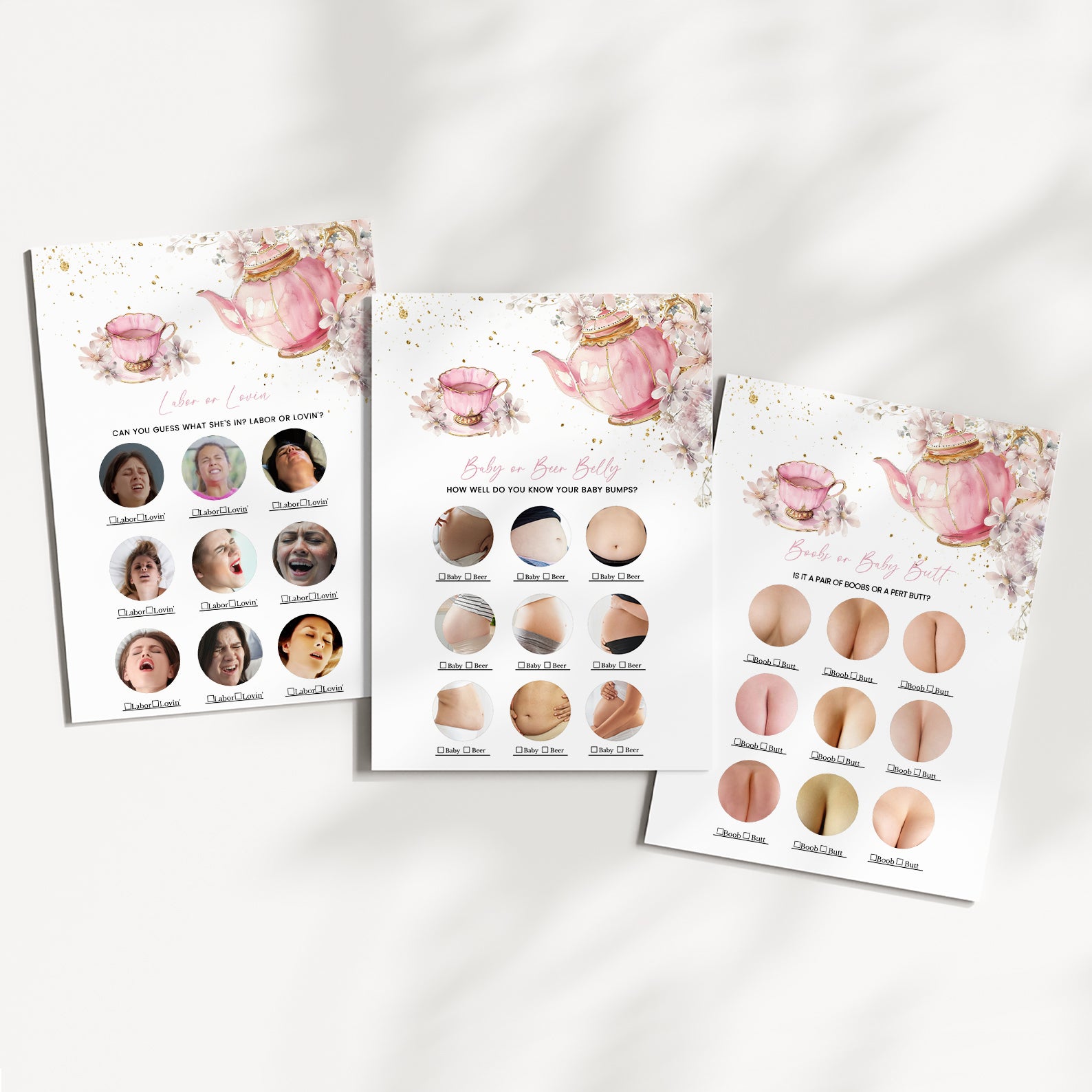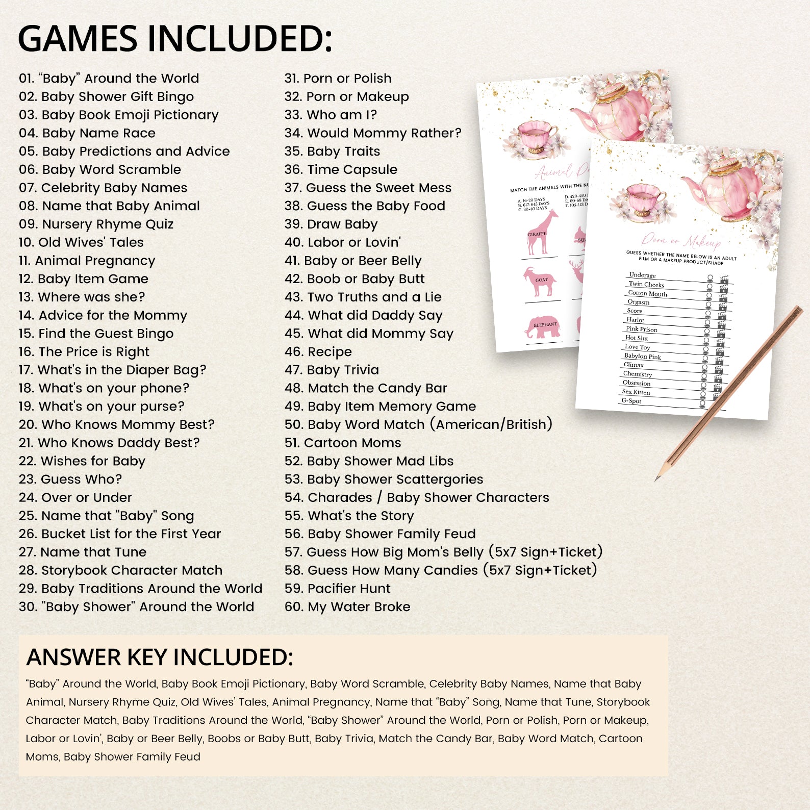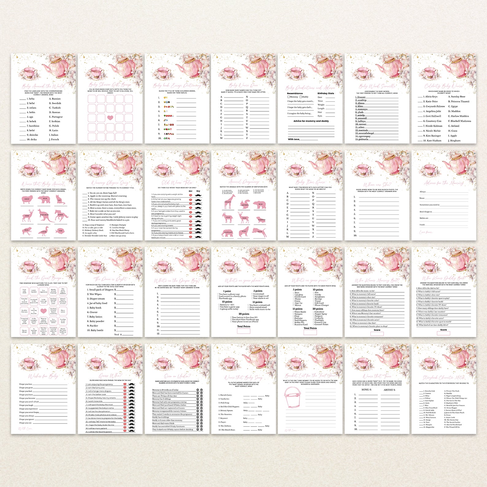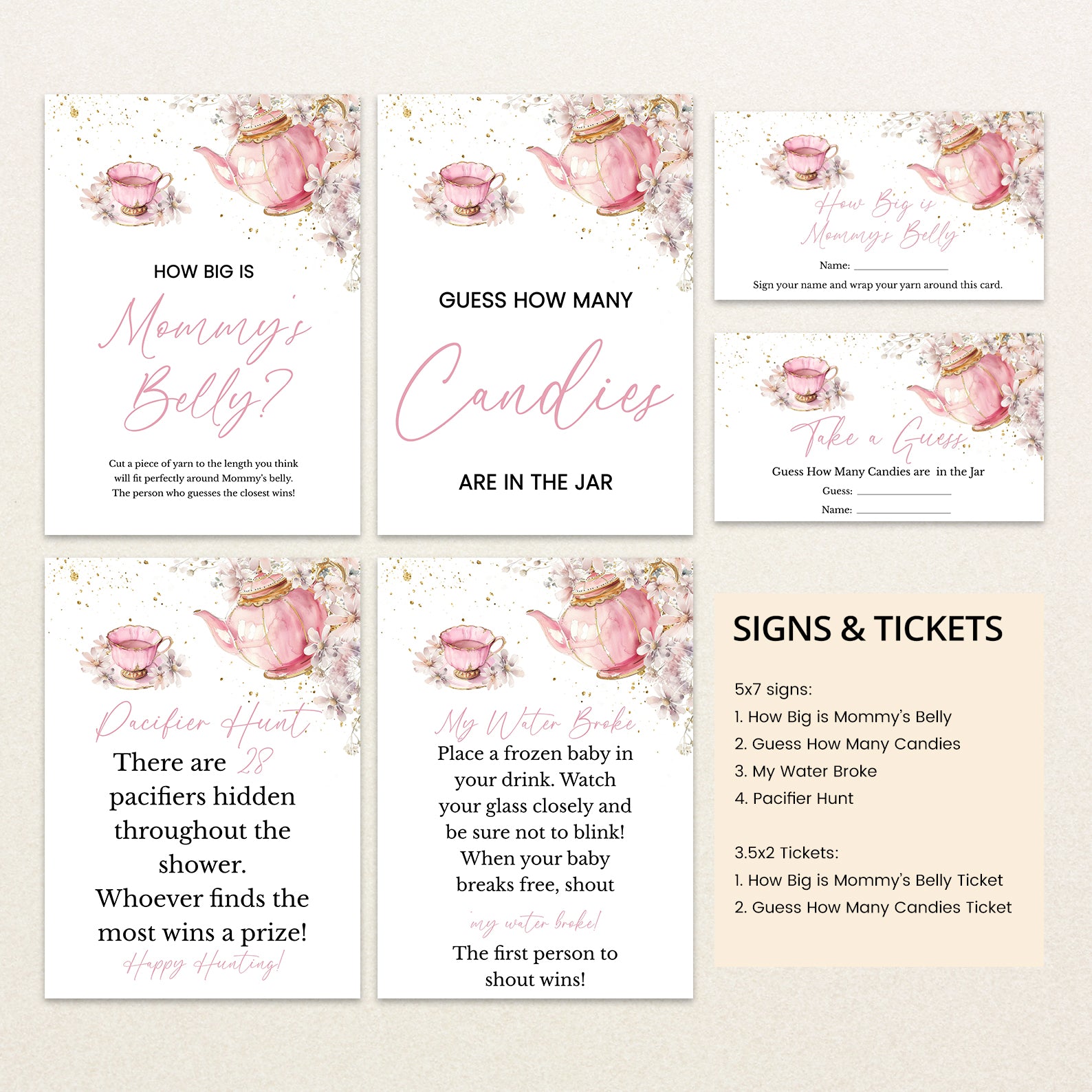 Spring Tea Party Baby Shower Game Bundle with Pink Teapot & Gold