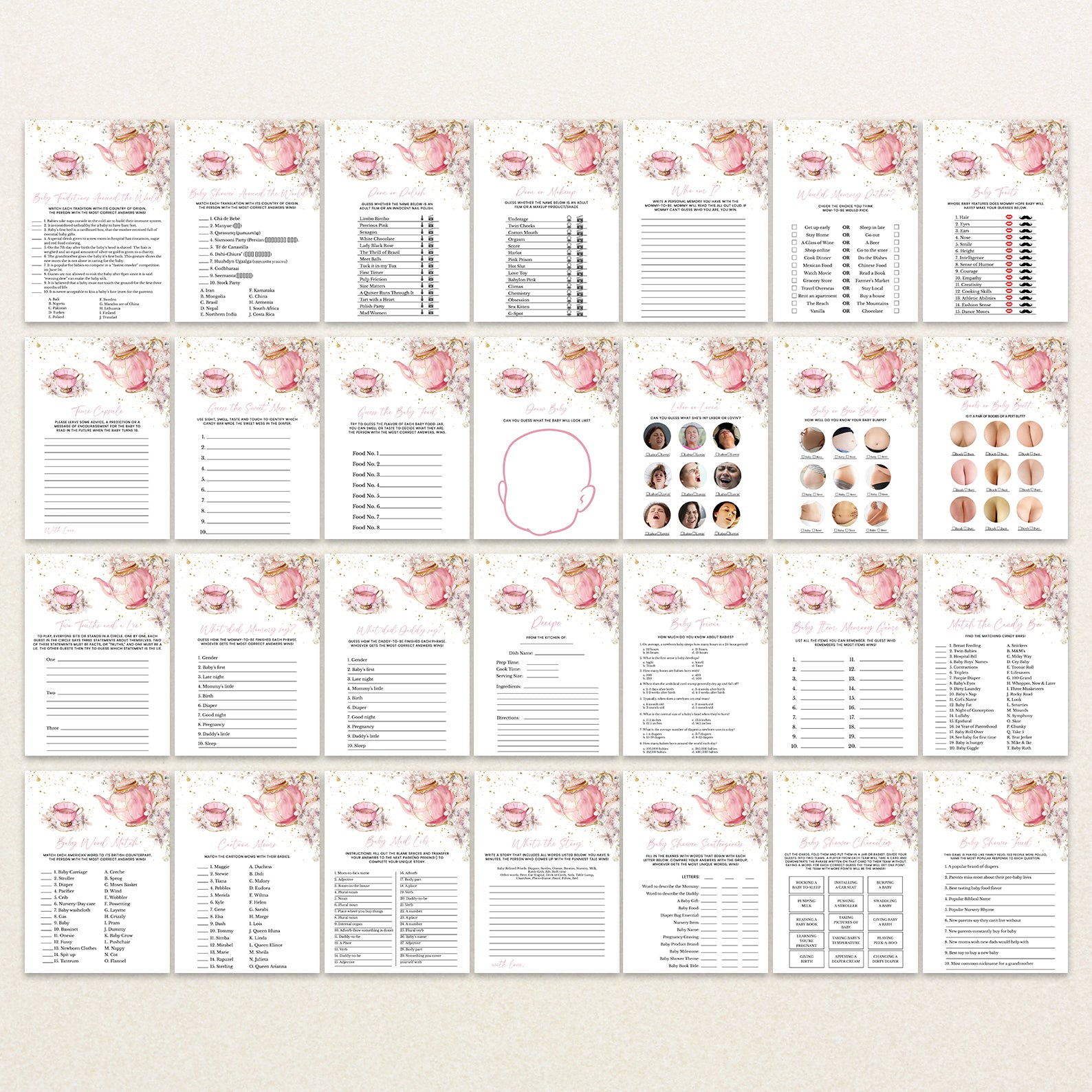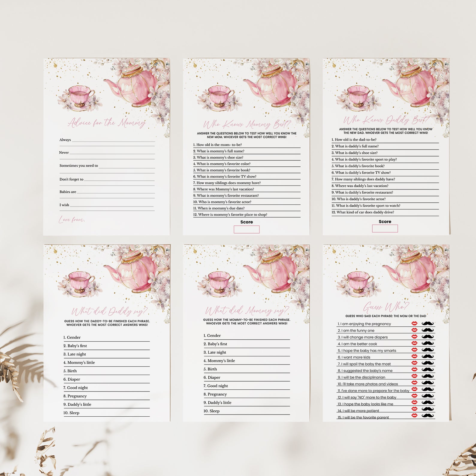 - Purchase this Spring Tea Party Baby Shower Game Bundle with Pink Teapot & Gold template
