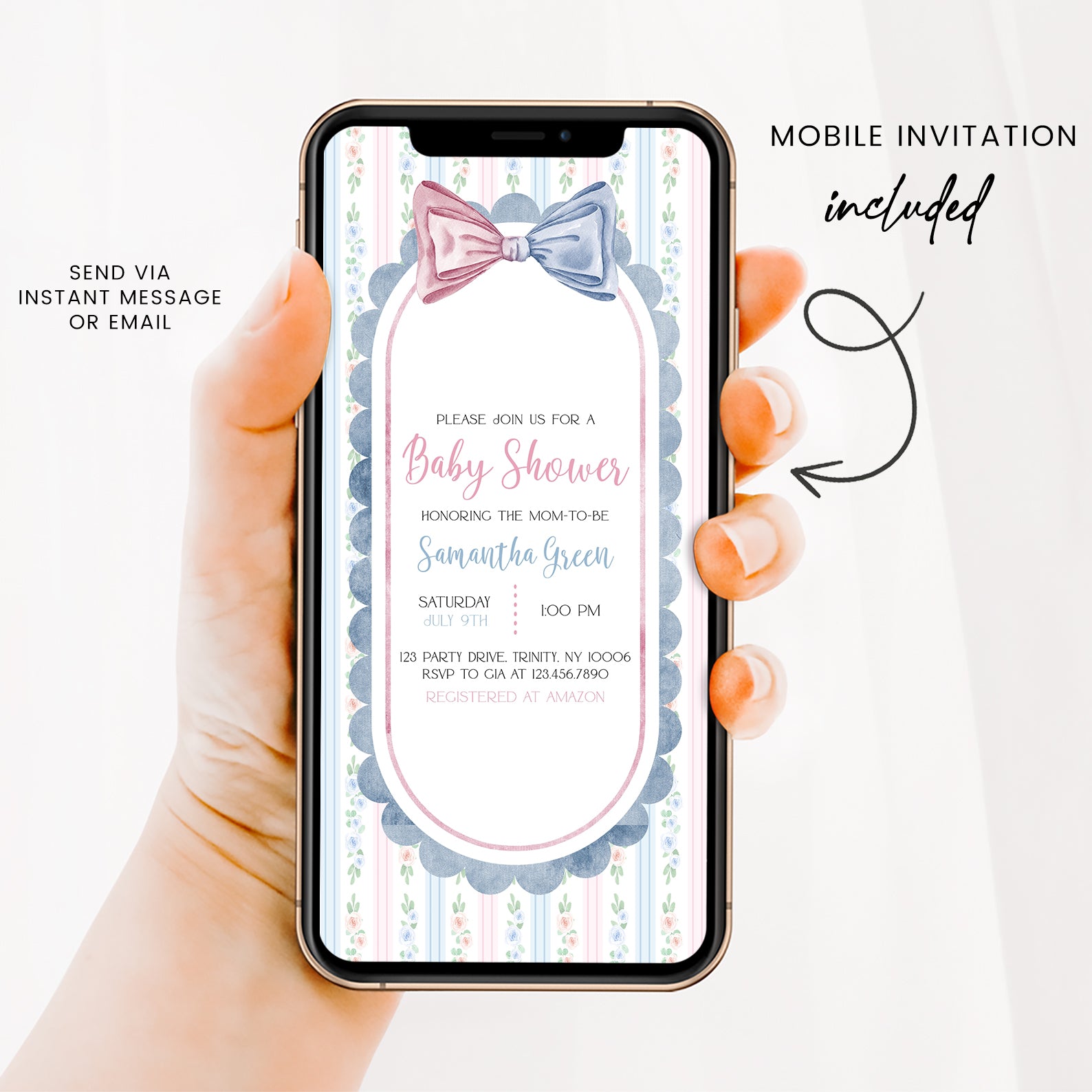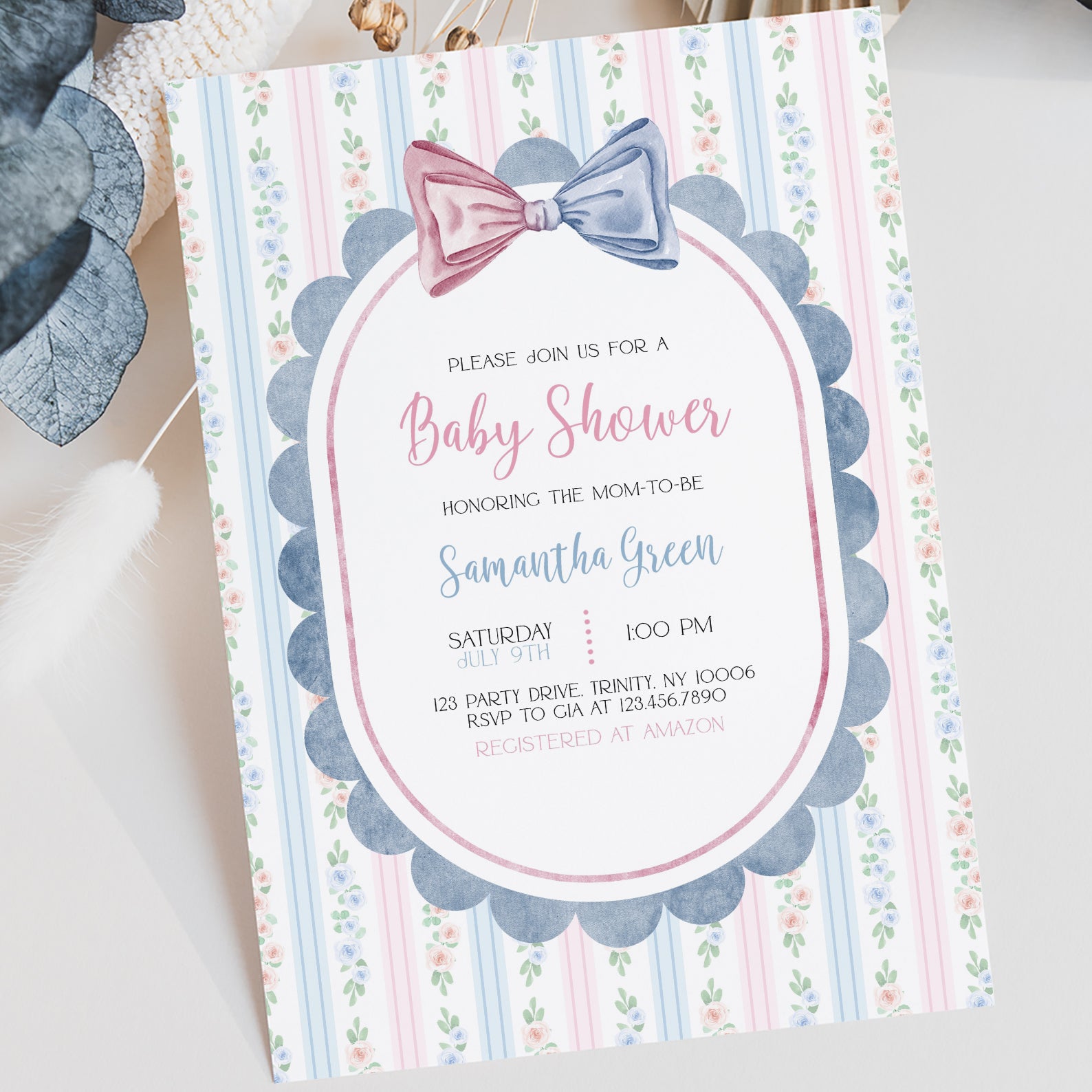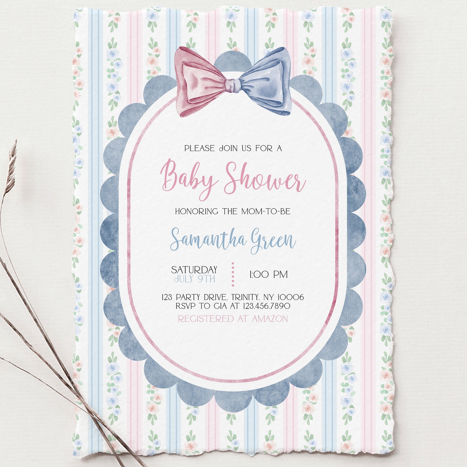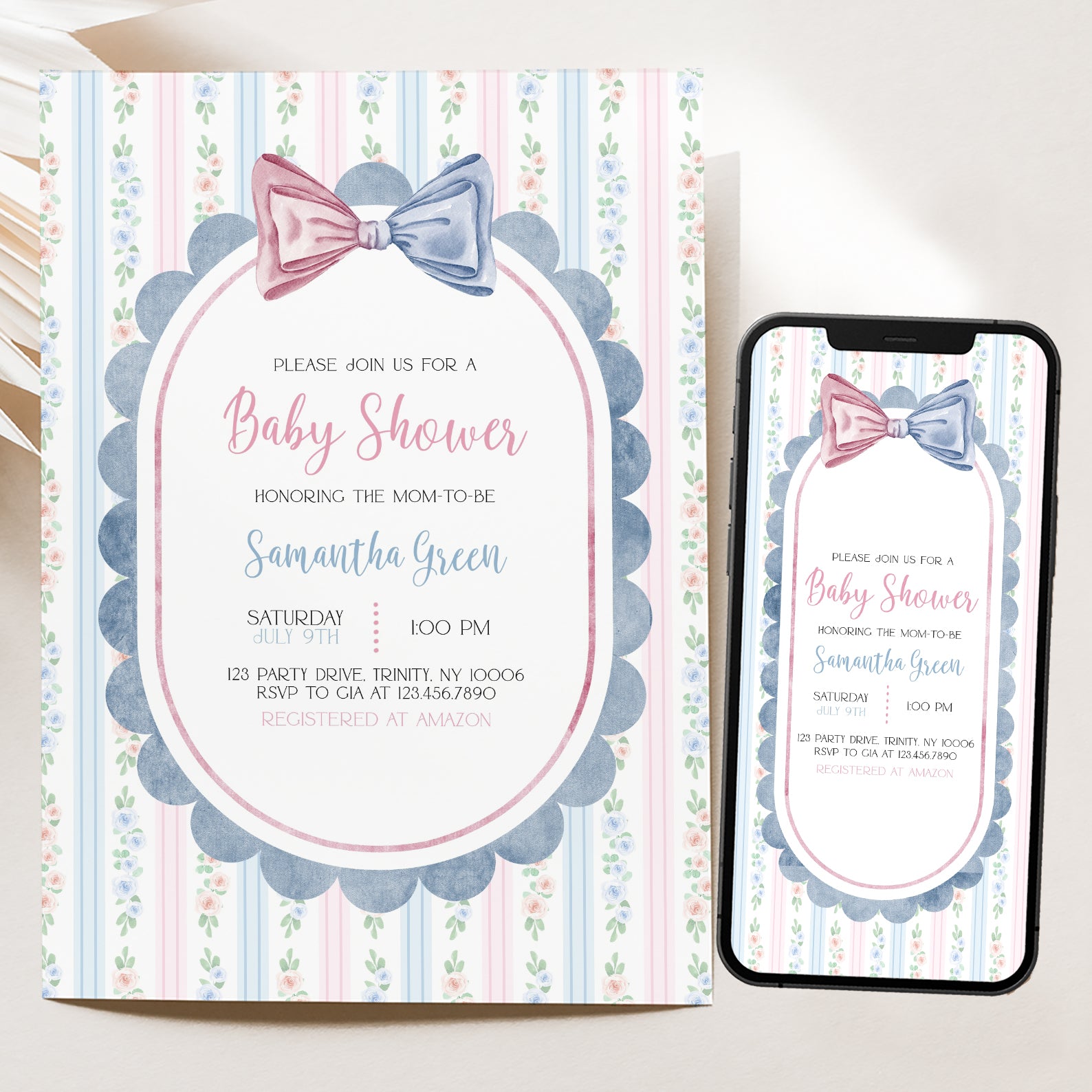 Celebrate the upcoming arrival of your little one with our charming baby shower digital invitation! Featuring a delightful flower pattern background, this elegant white vertical rectangle design showcases your event details beautifully layered on a soft blue pastel scalloped shape. Adorned with a lovely combination of pink and blue ribbons, this invitation sets the perfect tone for a joyful celebration. Easy to customize and share, it’s the ideal way to invite friends and family to join in the excitement of welcoming your new bundle of joy!