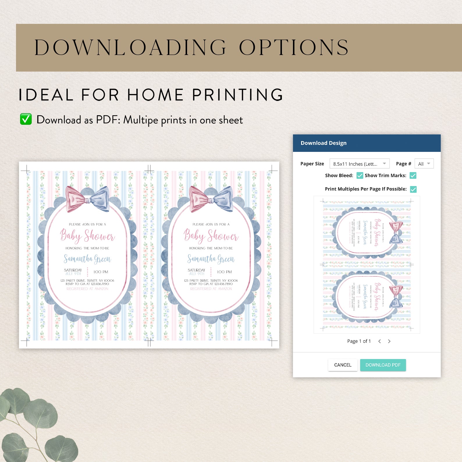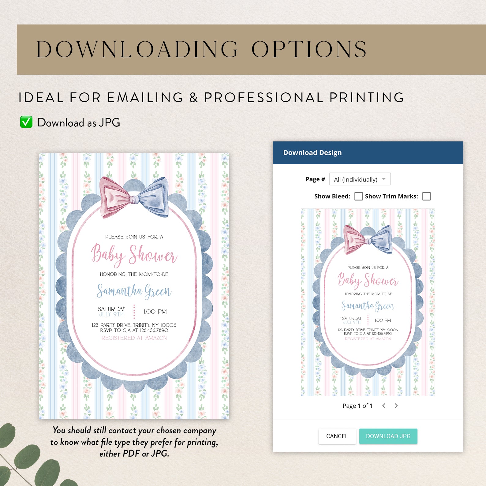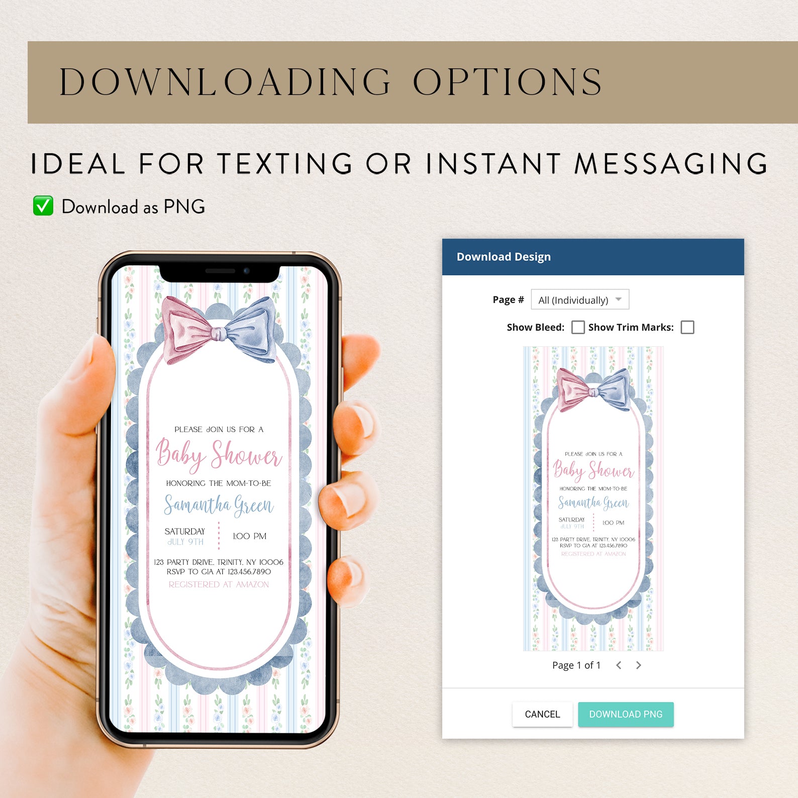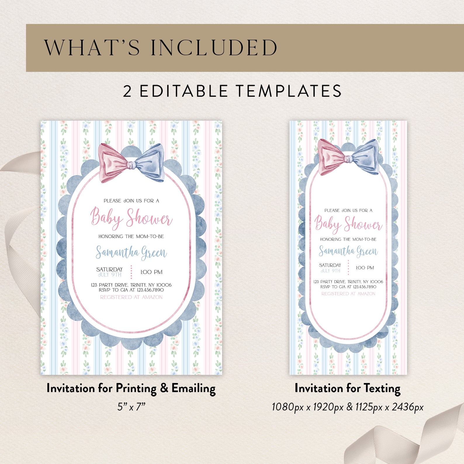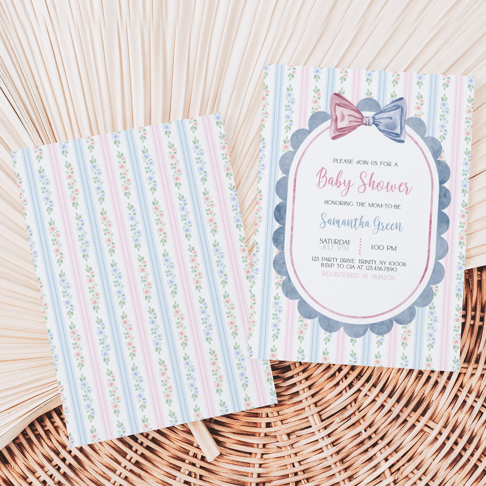 Celebrate the upcoming arrival of your little one with our charming baby shower digital invitation! Featuring a delightful flower pattern background, this elegant white vertical rectangle design showcases your event details beautifully layered on a soft blue pastel scalloped shape. Adorned with a lovely combination of pink and blue ribbons, this invitation sets the perfect tone for a joyful celebration. Easy to customize and share, it’s the ideal way to invite friends and family to join in the excitement of welcoming your new bundle of joy!