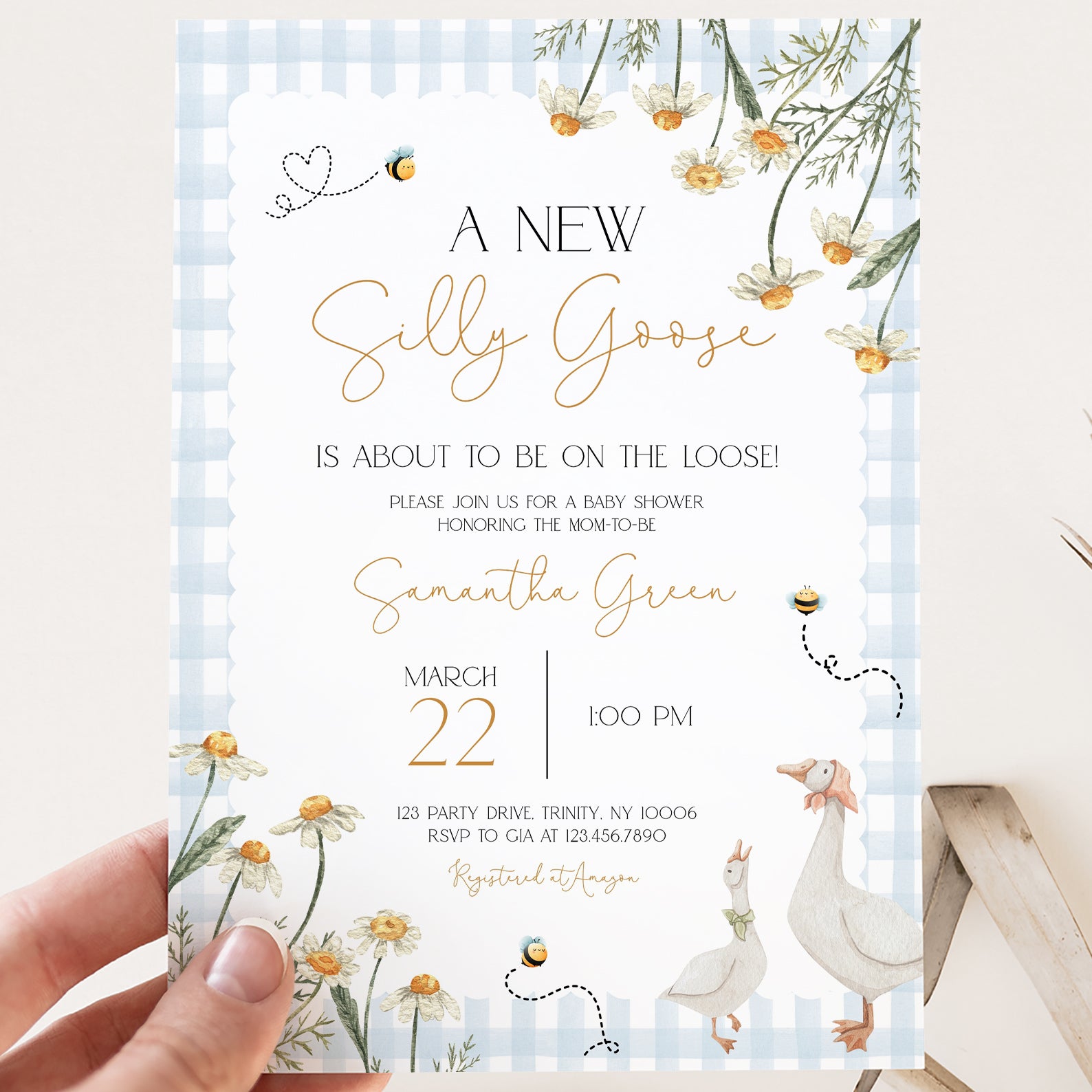 1. Purchase this Silly Goose Baby Shower Invitation with Chamomile & Bees template