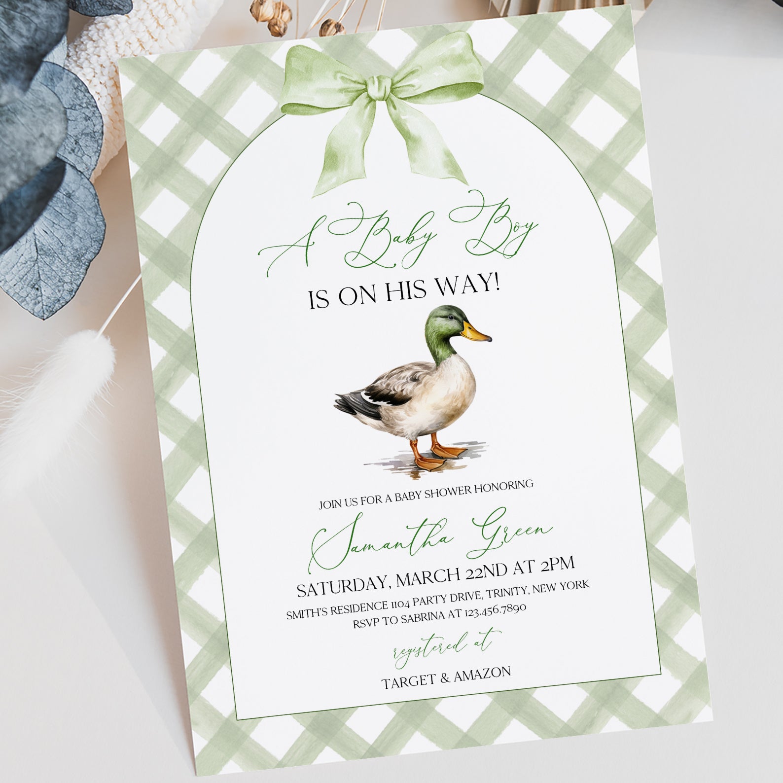 - Purchase this Spring Baby Boy Shower Invite with Green Plaid & Mallard Duck template