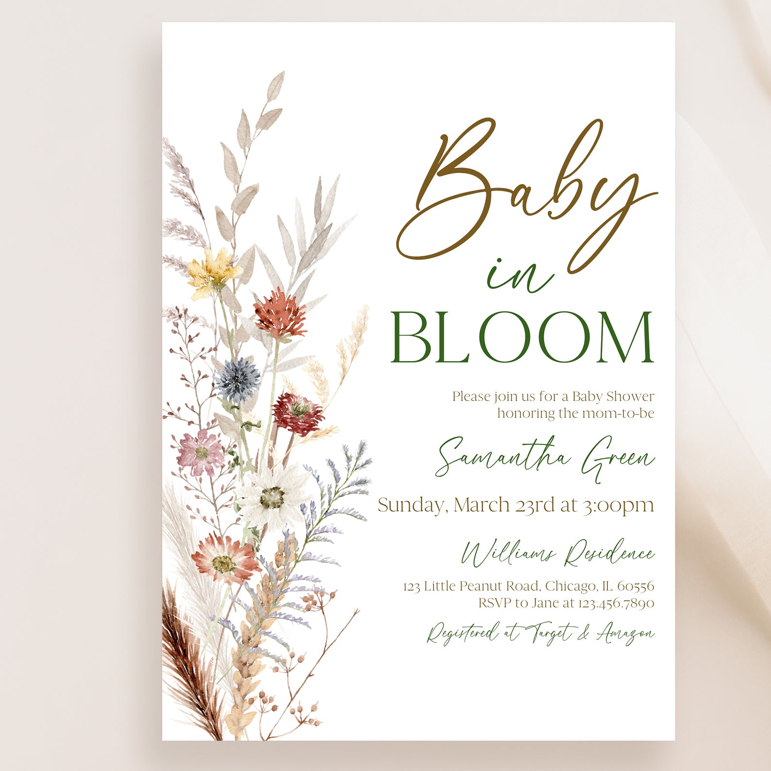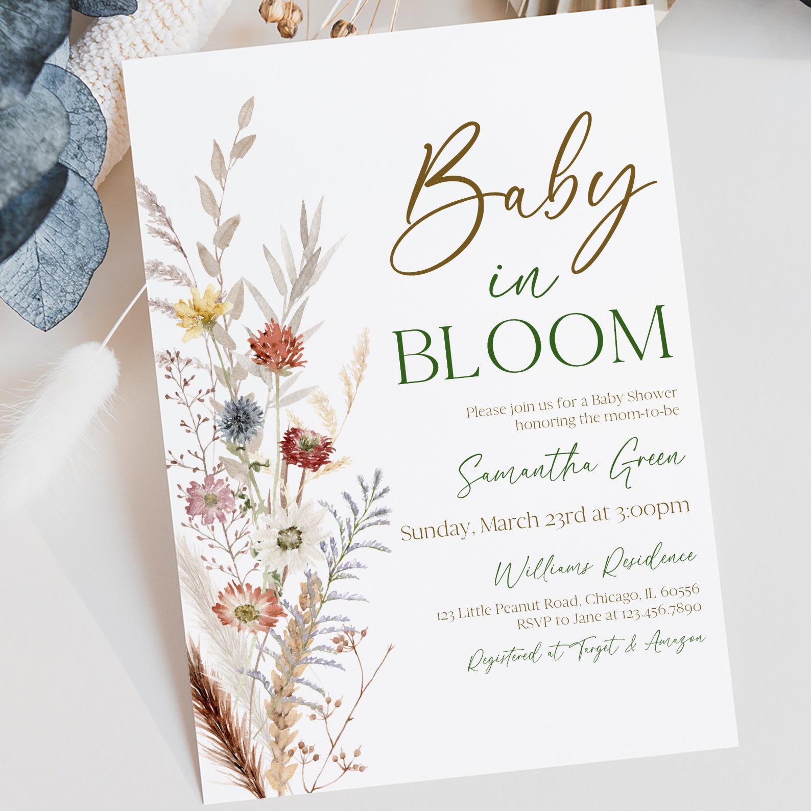 Spring Baby Shower Invite with Boho Wildflower Bouquet Design