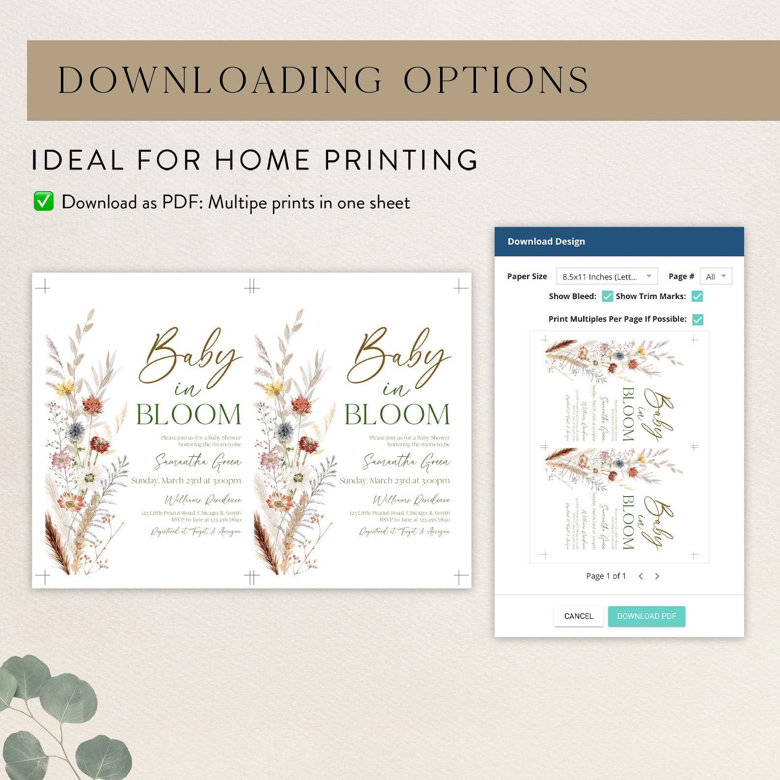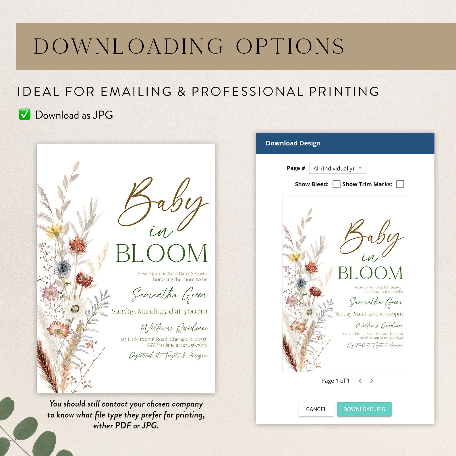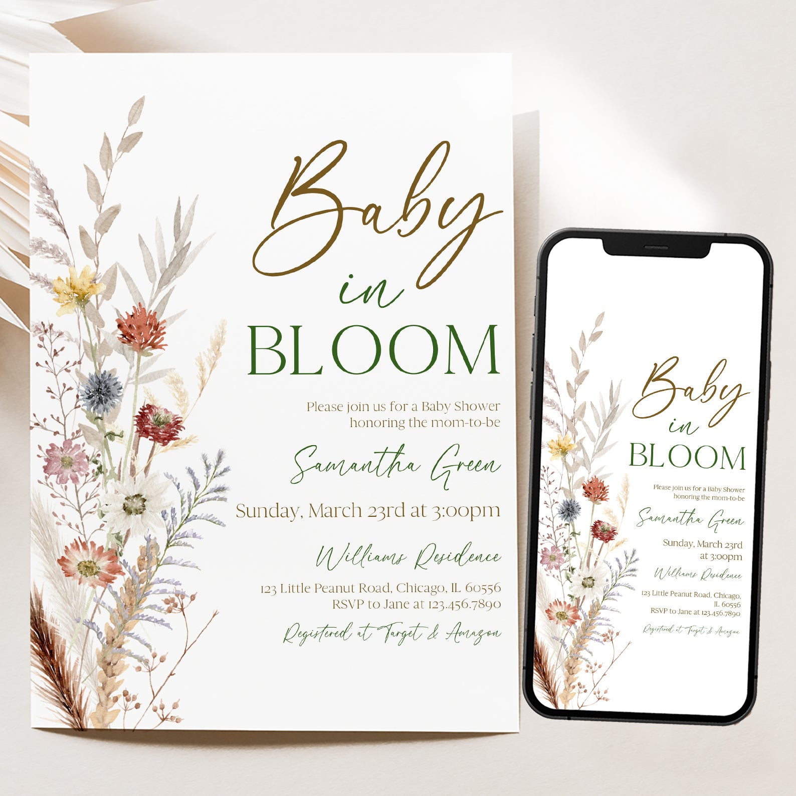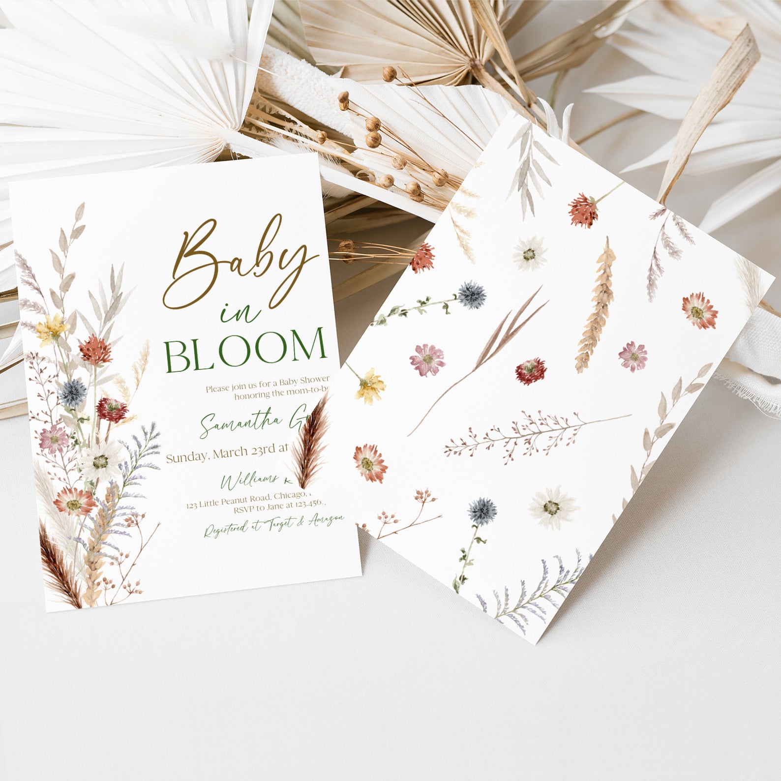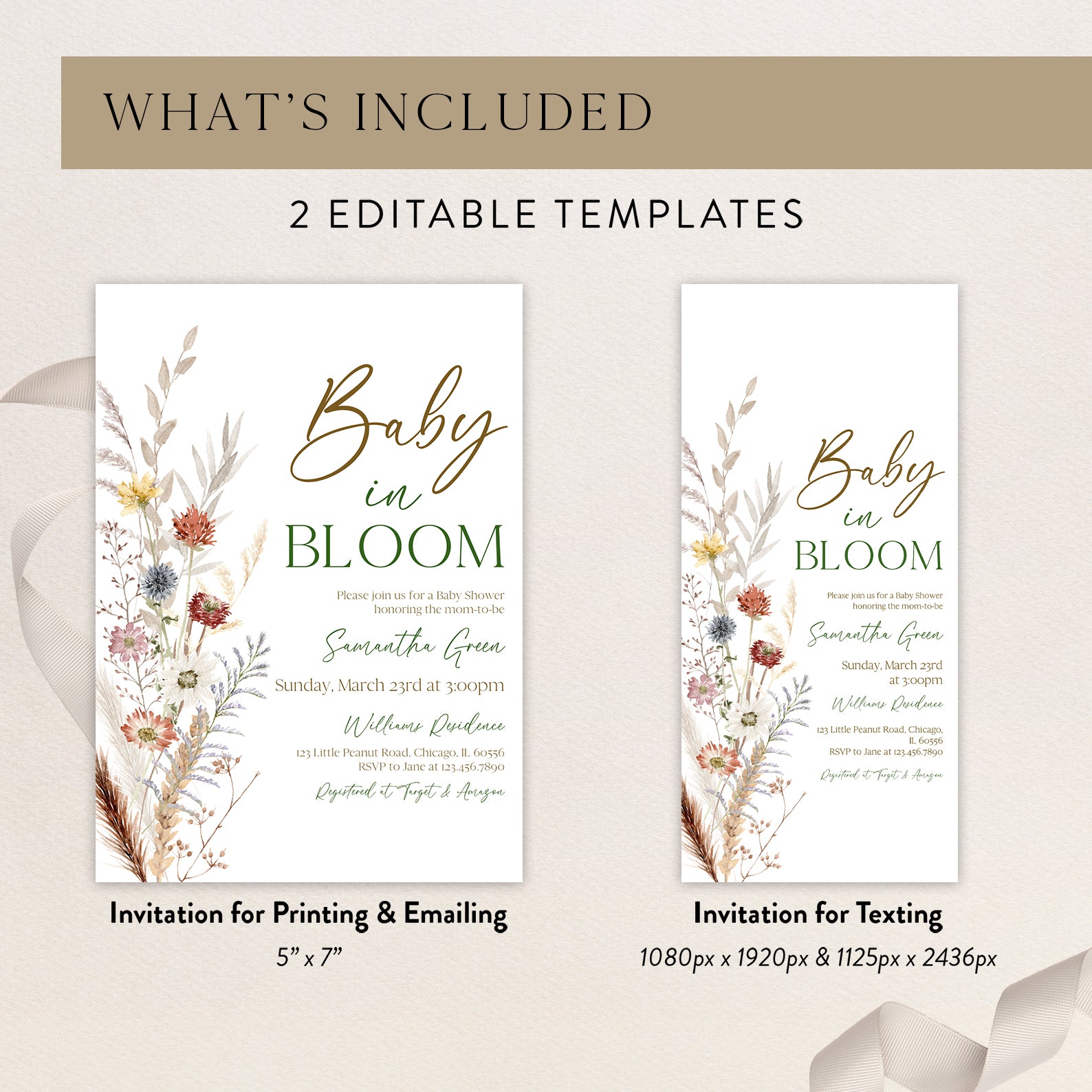 1. Purchase this Spring Baby Shower Invite with Boho Wildflower Bouquet Design template
