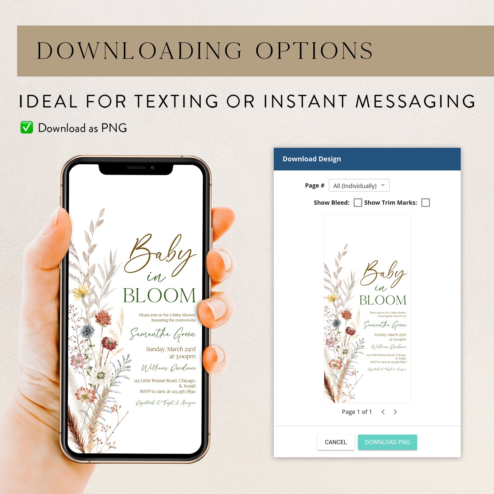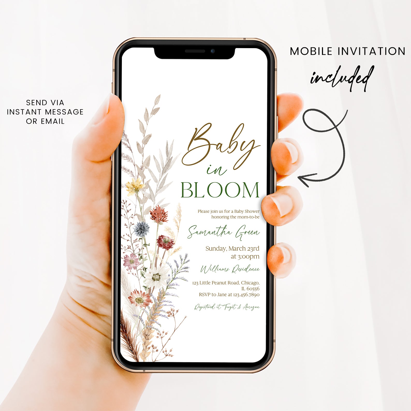 Celebrate the arrival of your little one with our enchanting Spring Baby Shower Digital Invitation, beautifully designed with a boho wildflowers bouquet adorning the left side. This charming invitation captures the essence of new beginnings, making it perfect for a joyful gathering. Easy to customize and share, it sets the tone for a delightful celebration filled with love and laughter. Invite your friends and family to join in the blooming excitement!
