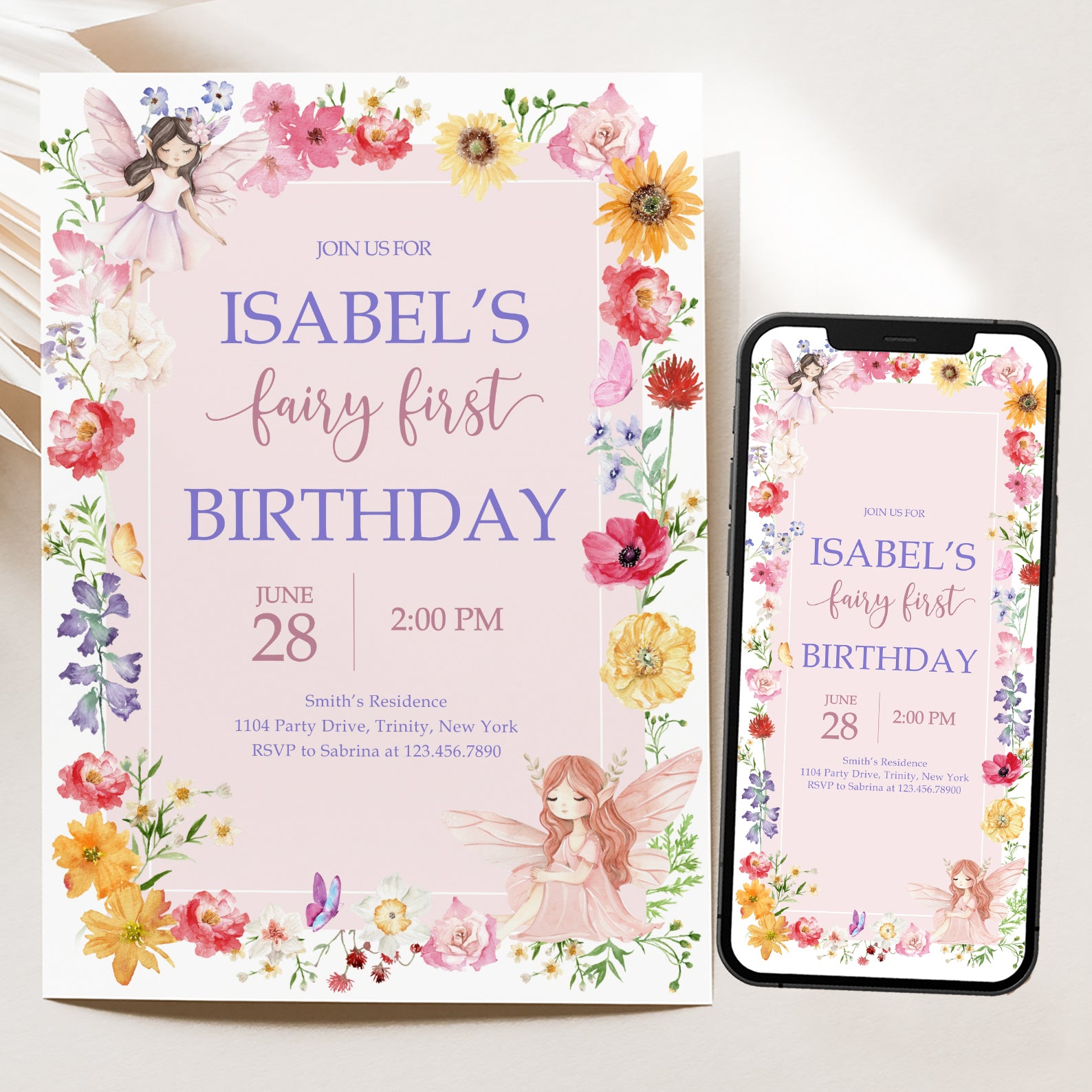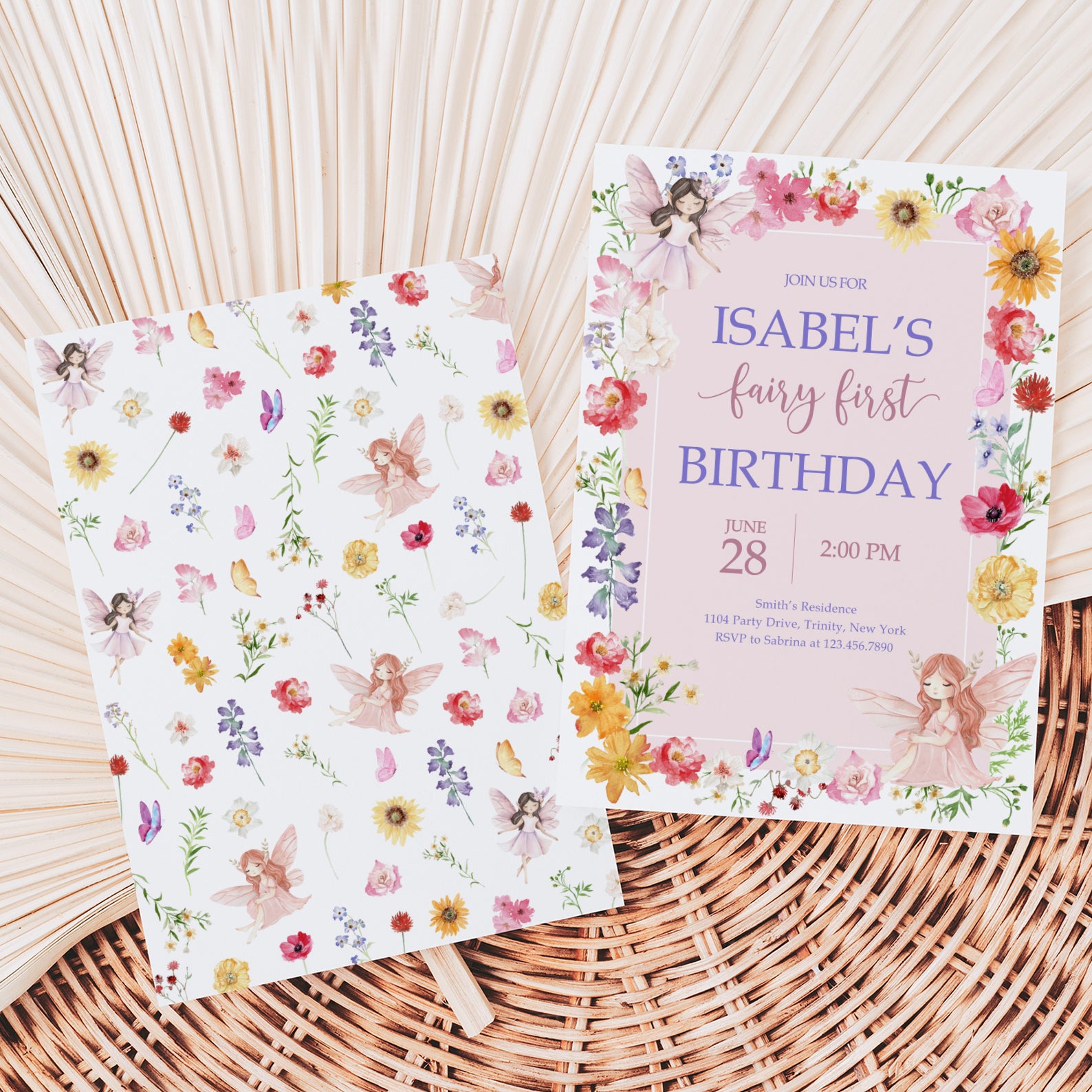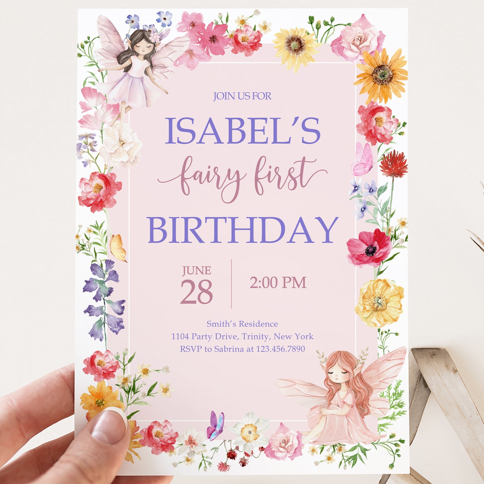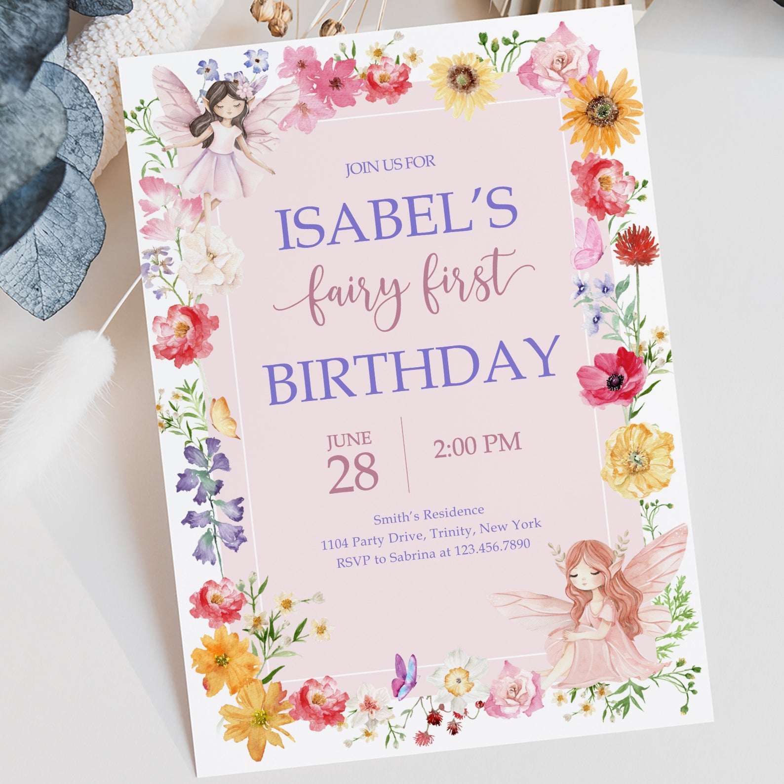 - Purchase this Fairy Birthday Invite with Flowers, Butterflies & Fairy template