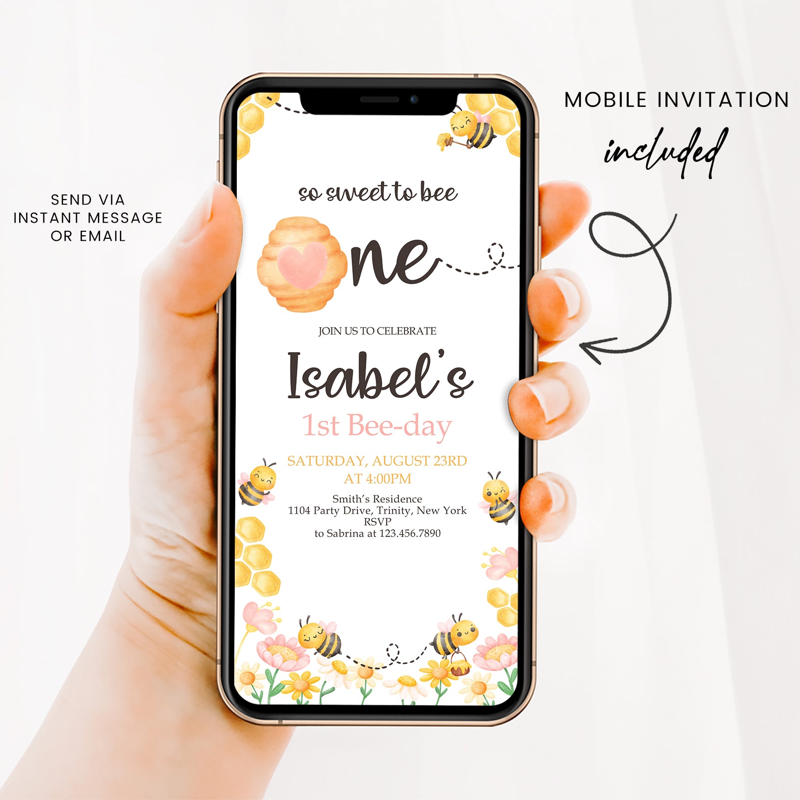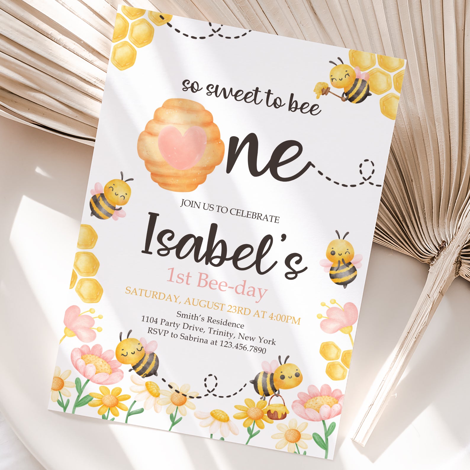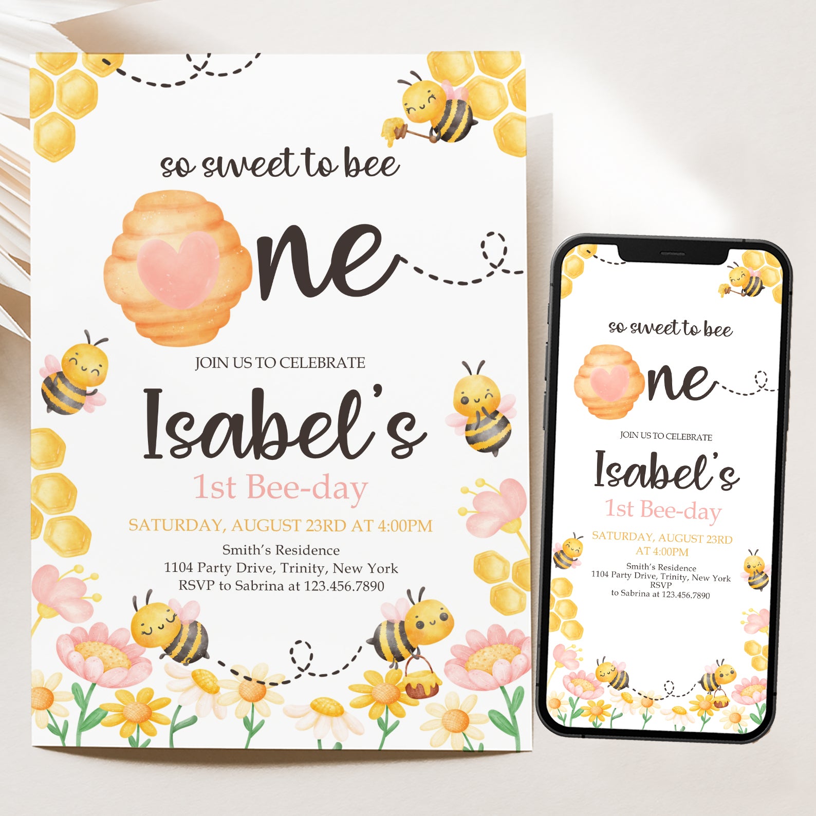 Celebrate your little one's special day with our charming Spring Birthday Digital Invitation! Adorned with delightful honeycombs, a whimsical beehive, and playful flying bees, this invitation captures the essence of springtime joy. The vibrant yellow and pink flowers at the bottom add a cheerful touch, making it perfect for a fun-filled birthday bash. Easy to customize and send, this invitation will set the tone for a buzzing good time!