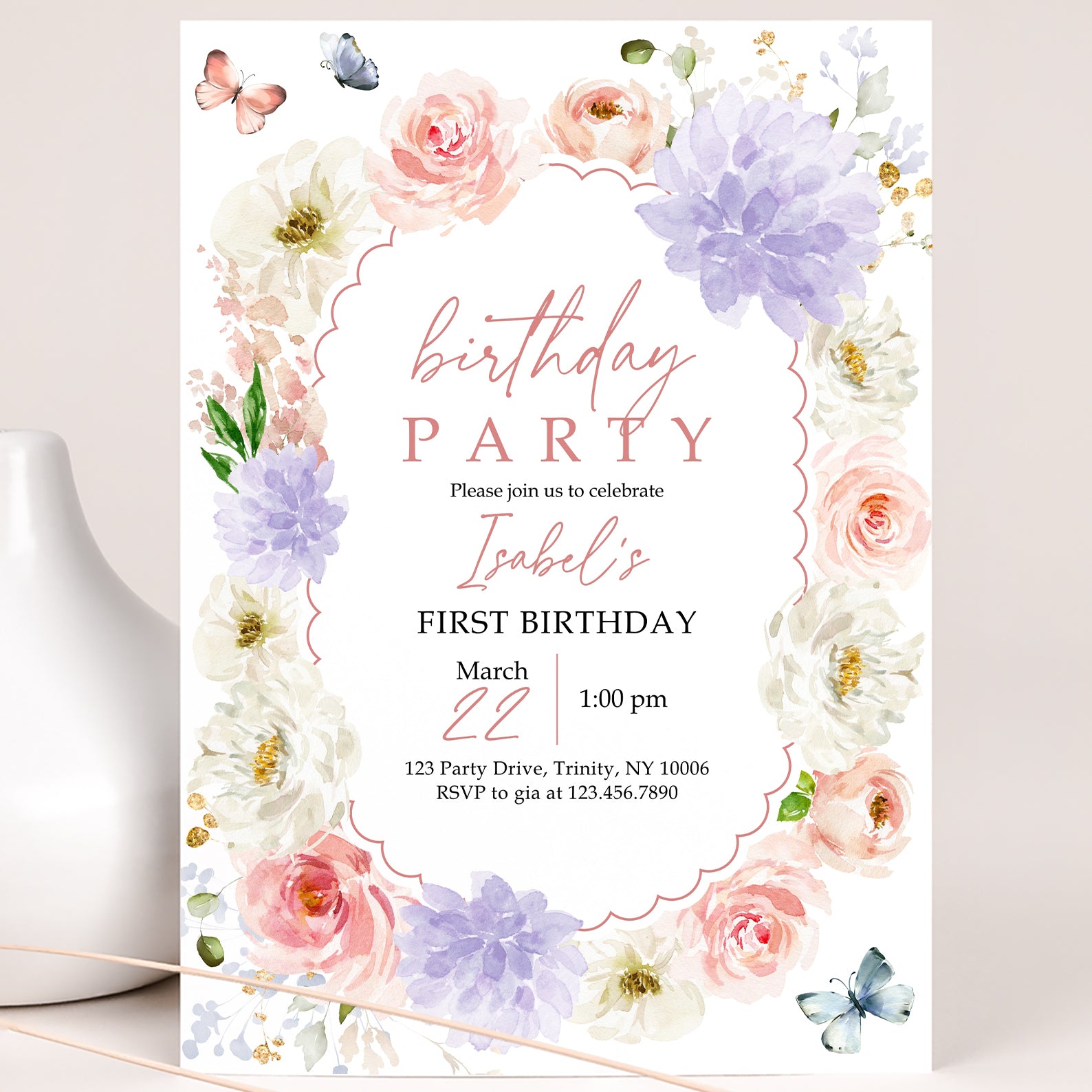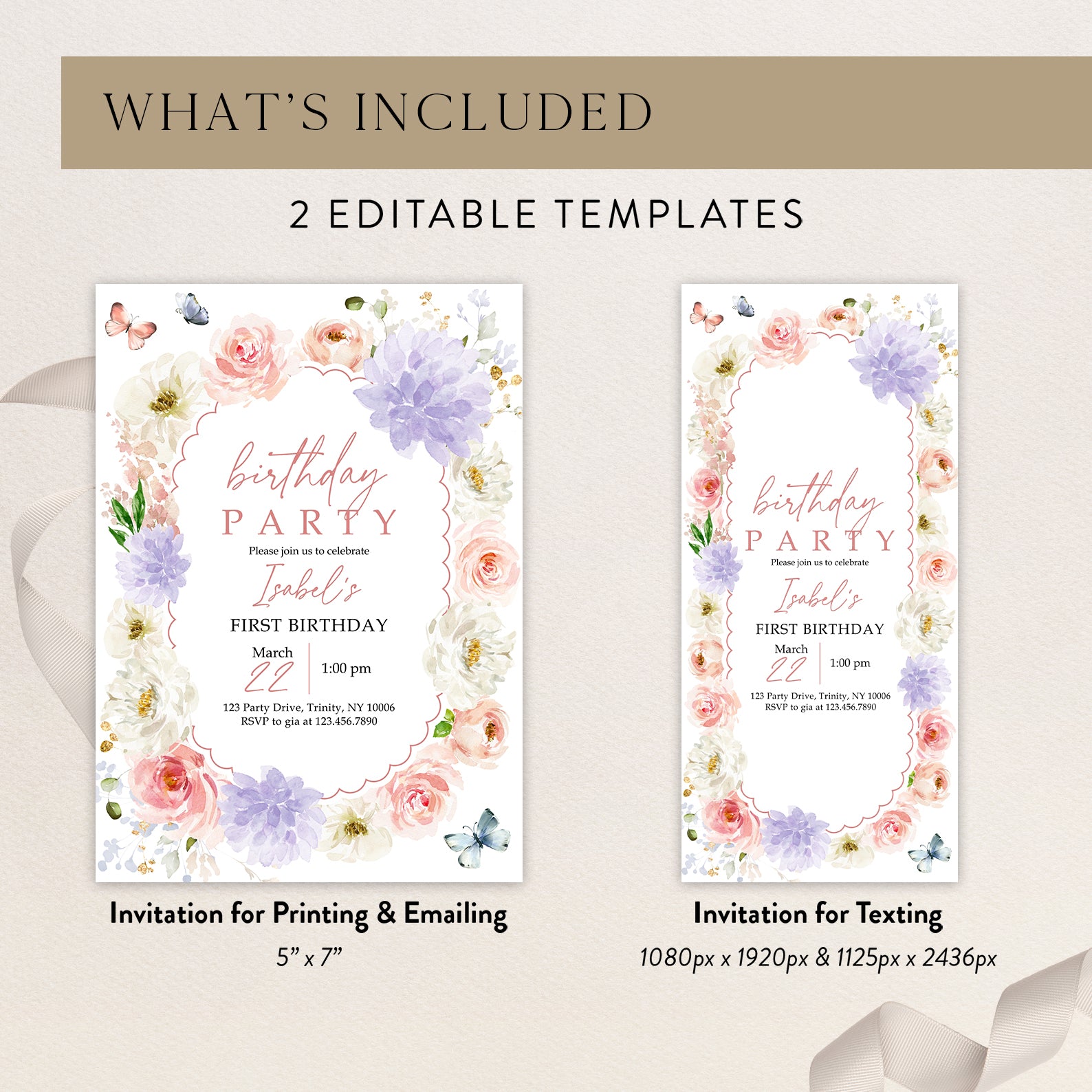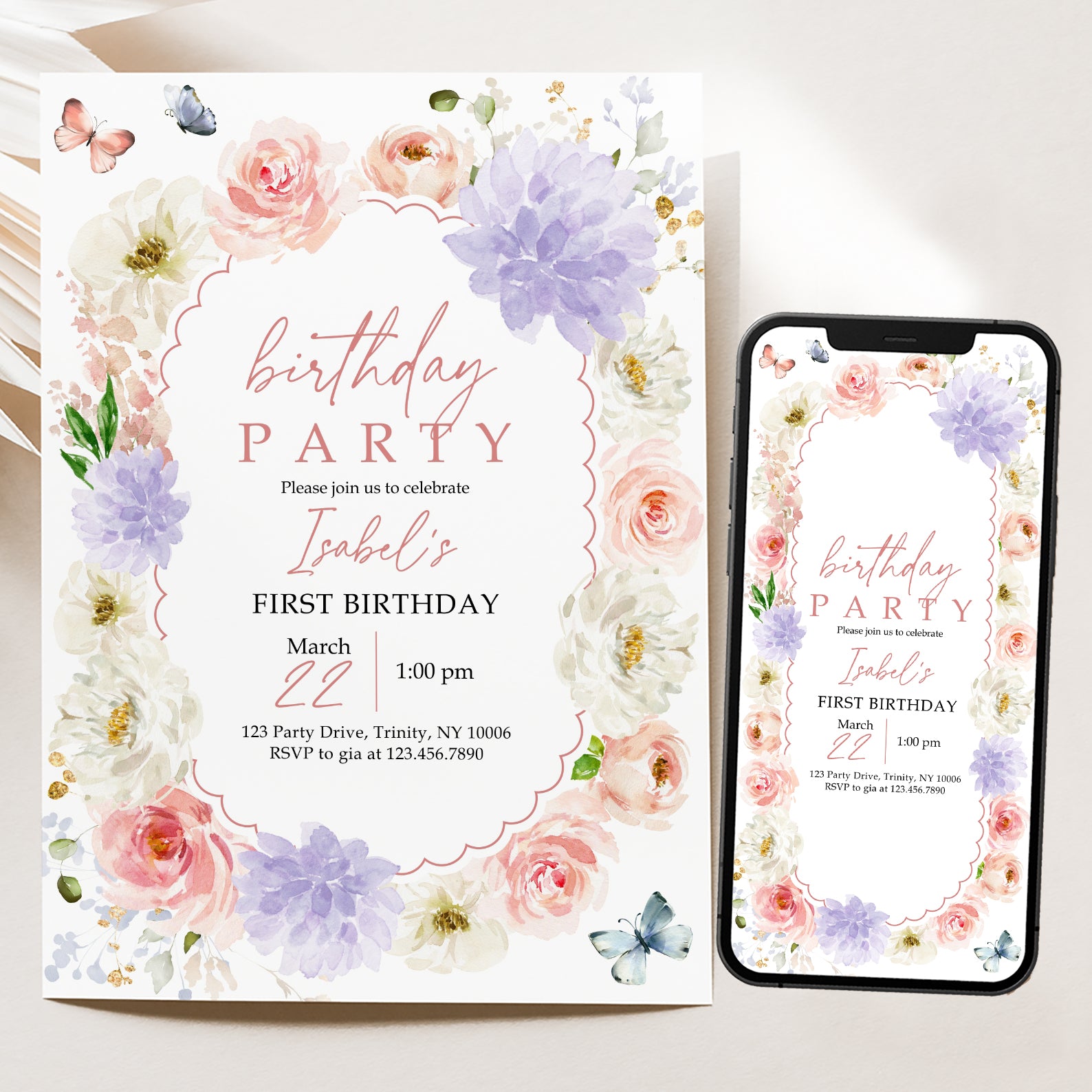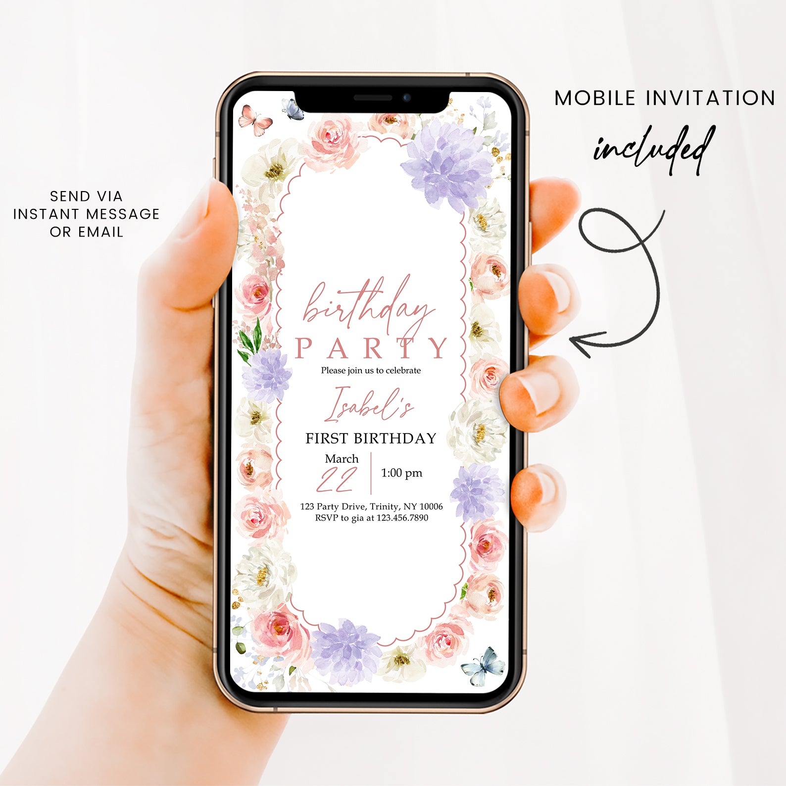 Celebrate your little one's first birthday in style with our enchanting spring birthday digital invitation! Adorned with exquisite watercolor flowers in shades of pink, purple, and white, along with whimsical flying butterflies, this invitation sets the perfect tone for a delightful celebration. Easy to customize and share, it’s the ideal way to invite friends and family to join in the joyous occasion. Make your child's special day unforgettable with this charming and vibrant invitation!