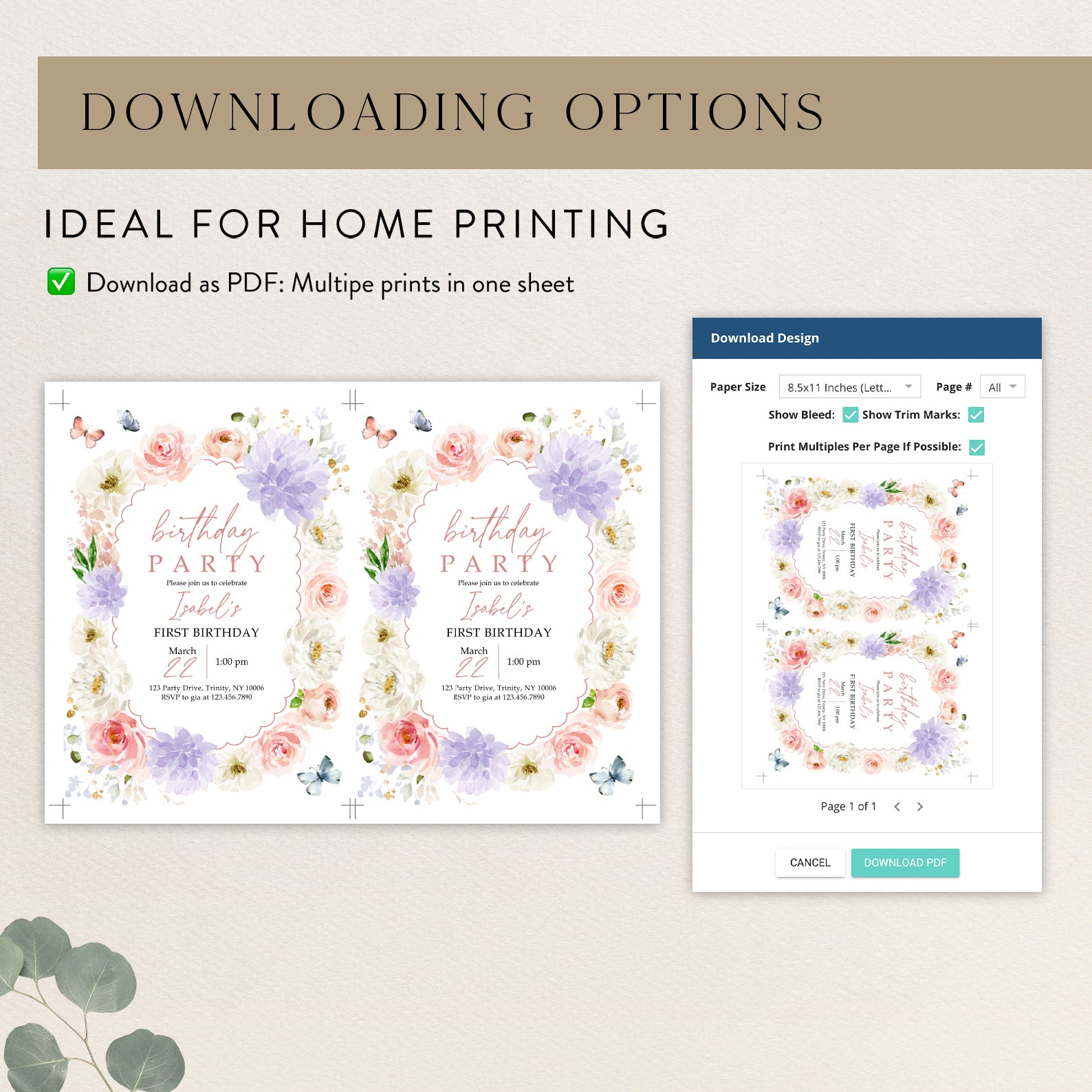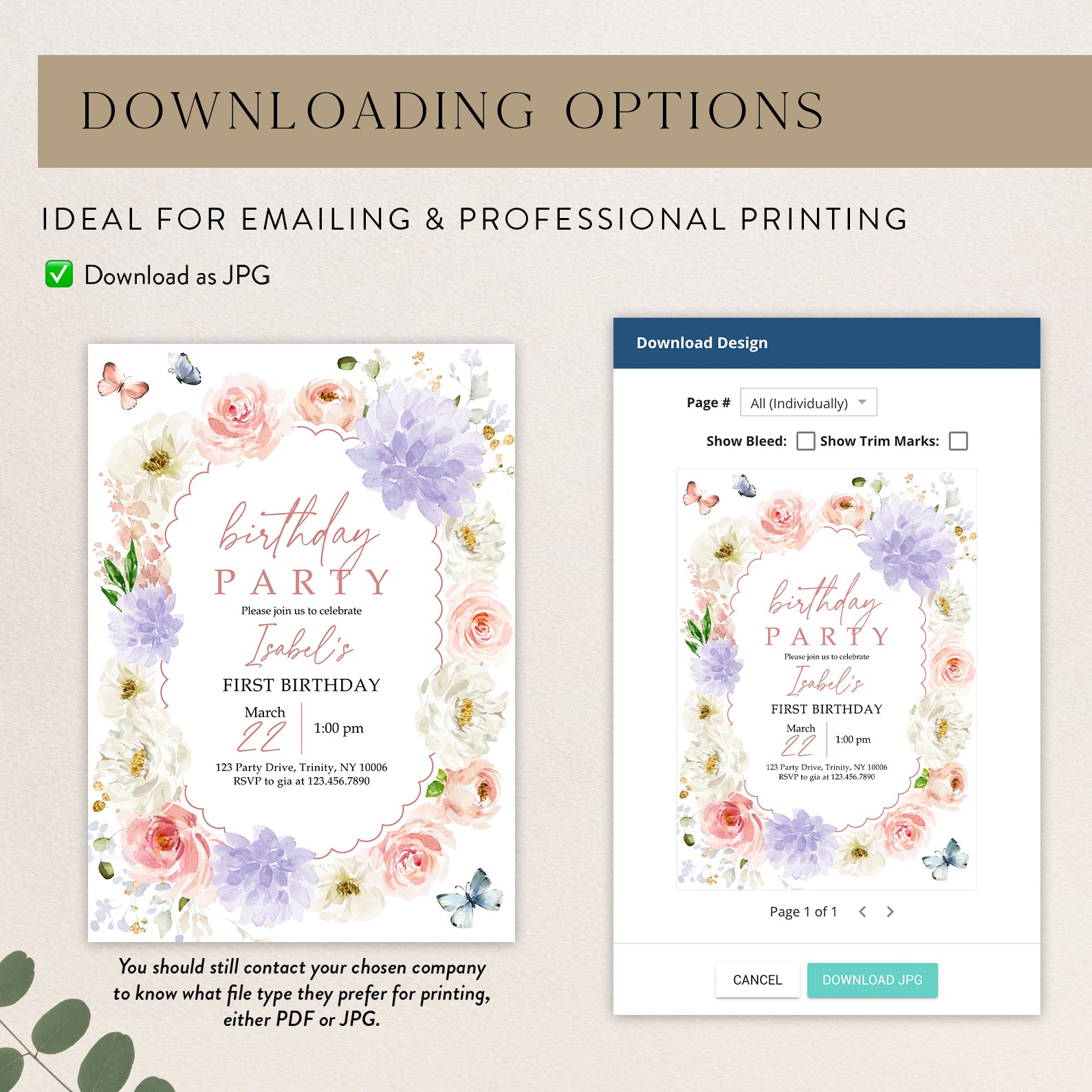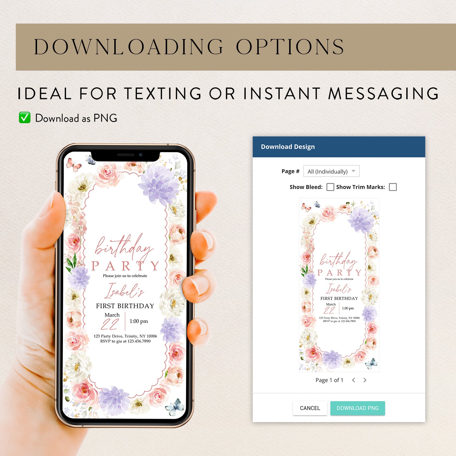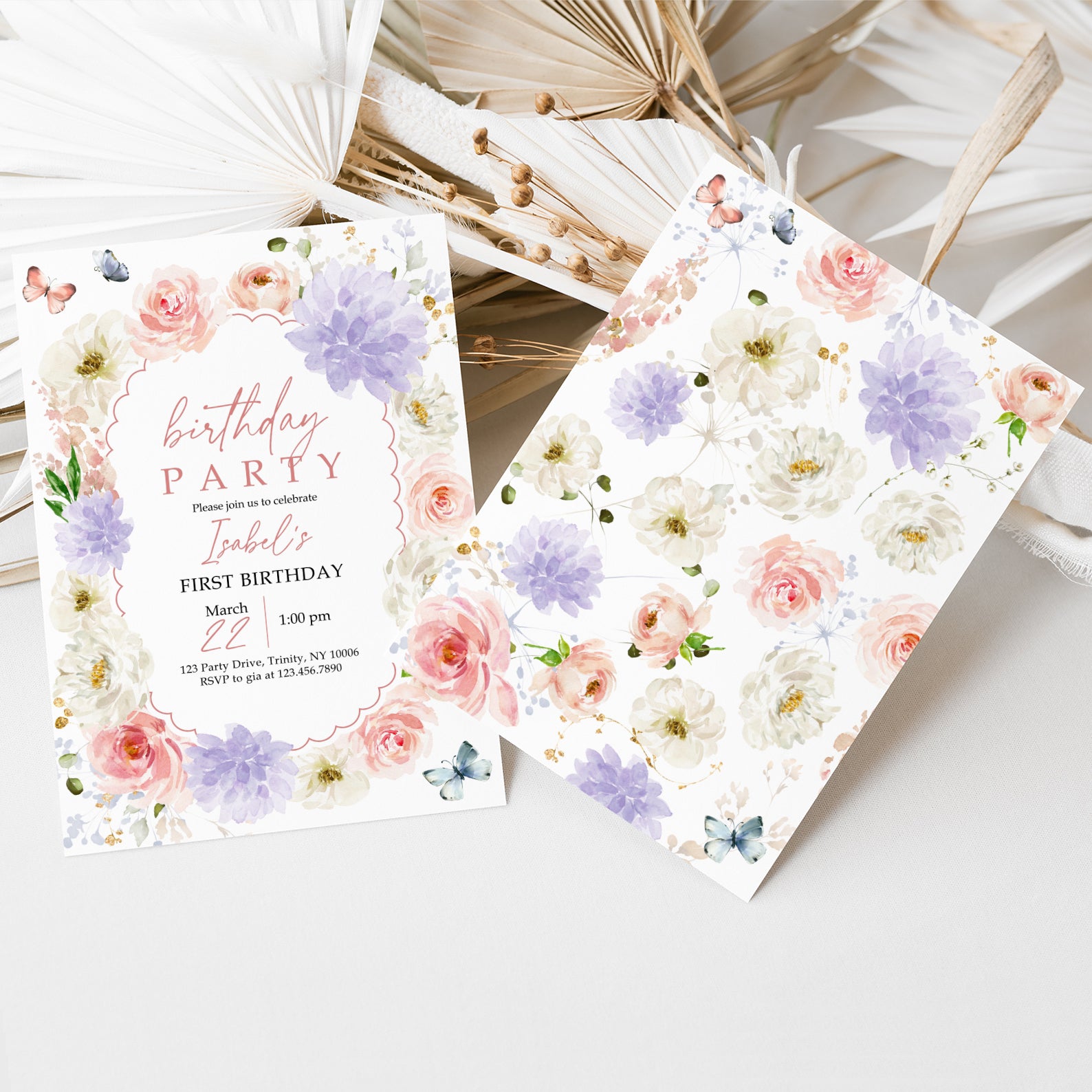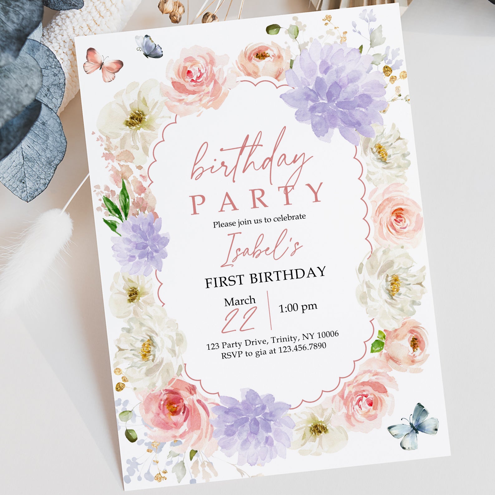 Celebrate your little one's first birthday in style with our enchanting spring birthday digital invitation! Adorned with exquisite watercolor flowers in shades of pink, purple, and white, along with whimsical flying butterflies, this invitation sets the perfect tone for a delightful celebration. Easy to customize and share, it’s the ideal way to invite friends and family to join in the joyous occasion. Make your child's special day unforgettable with this charming and vibrant invitation!