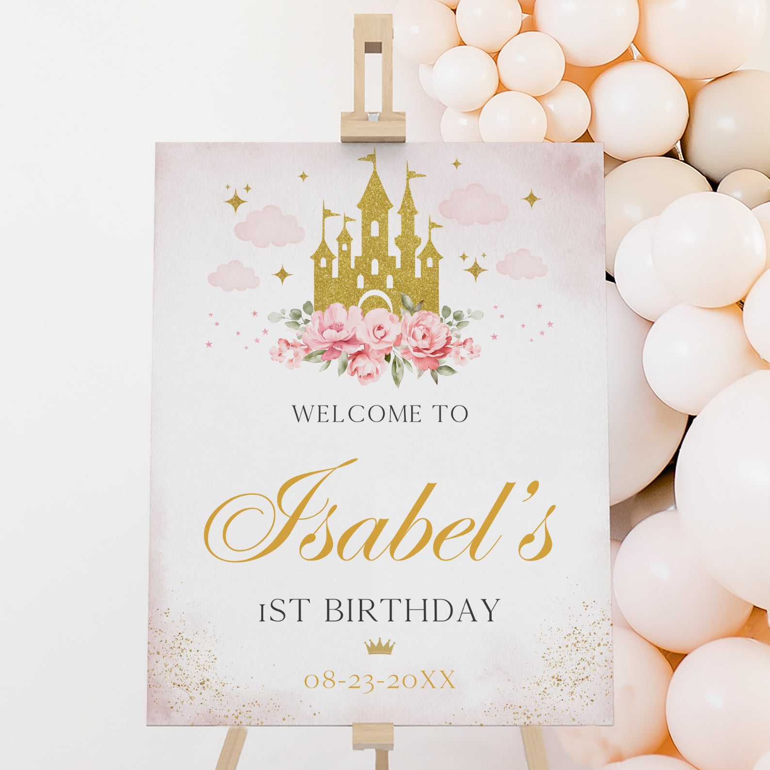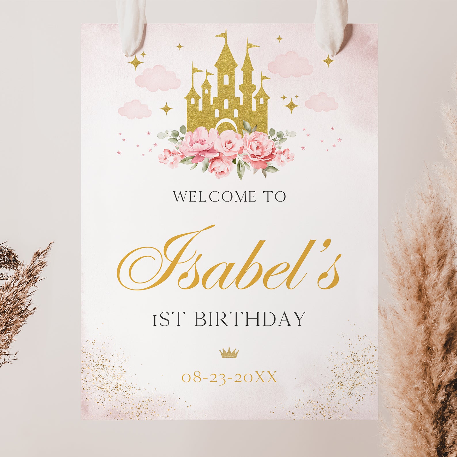 Welcome guests with a touch of fairy tale magic! This enchanting pink and gold-themed welcome sign sets the perfect scene for your little one’s special day. Featuring a soft pink background, a regal gold castle, delicate pink rose florals, and shimmering gold diamond stars, it creates a dreamy entrance fit for a storybook celebration.