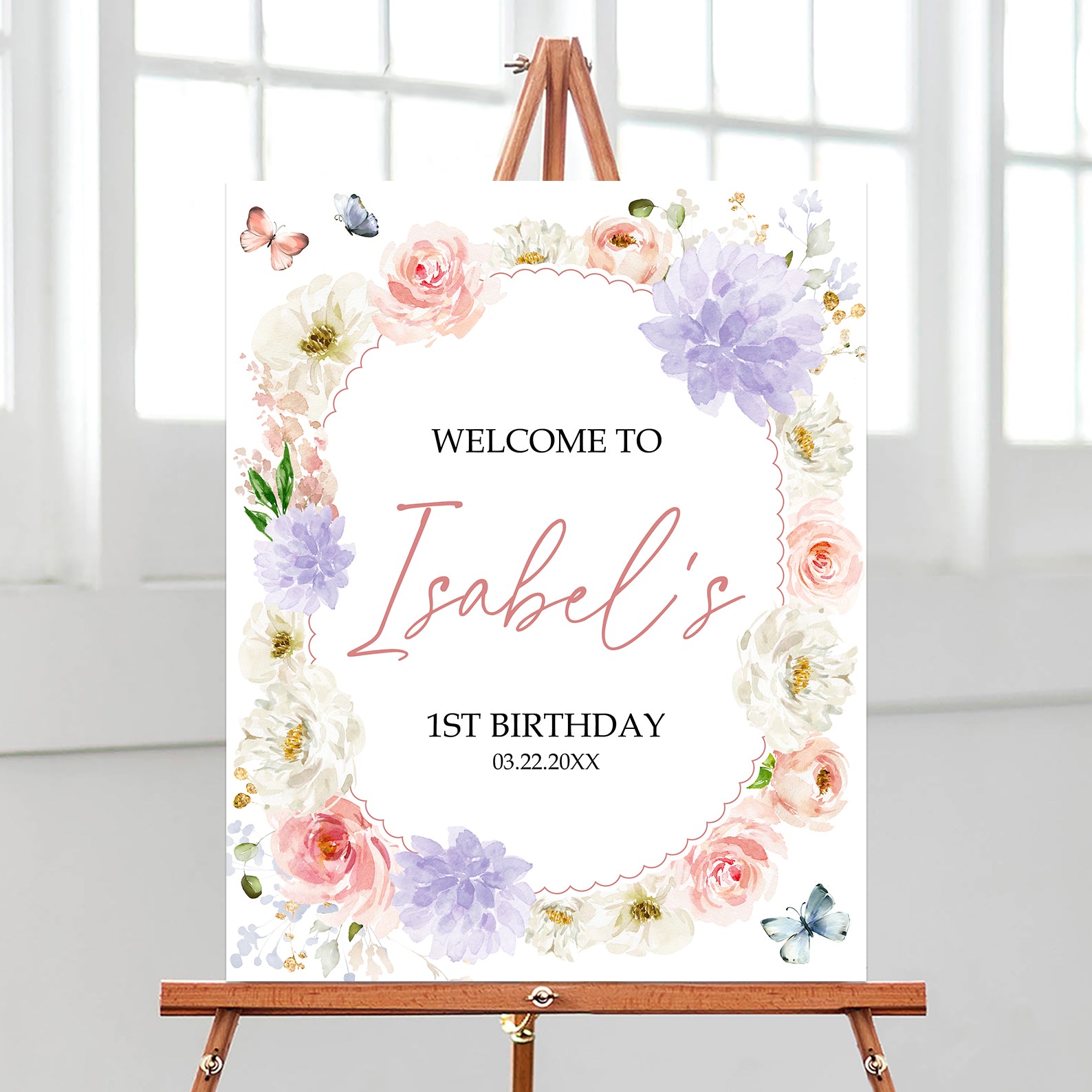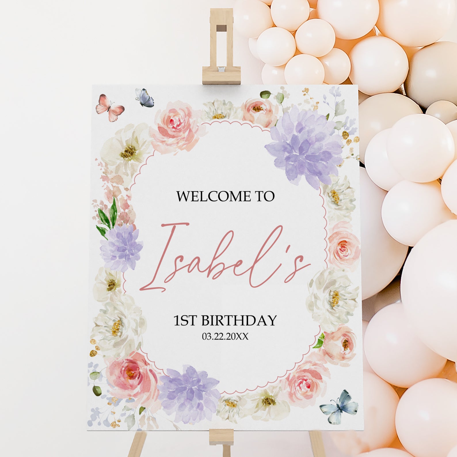 Greet guests with style at your little one’s first birthday celebration with our enchanting spring-themed welcome sign! Featuring delicate watercolor flowers in shades of pink, purple, and white, along with whimsical flying butterflies, this sign sets a joyful tone right from the moment they arrive. Perfect for your spring birthday party, it’s customizable to match your celebration’s theme, creating a warm and inviting atmosphere for all your guests. Make your child’s milestone unforgettable with this charming and vibrant welcome sign!
