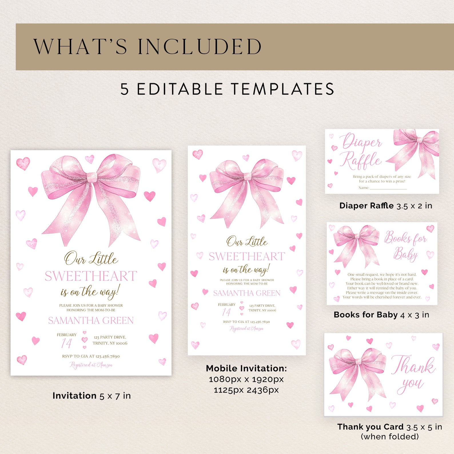 - Purchase this Spring Baby Shower Invite Bundle with Pink Ribbon & Heart Accents template