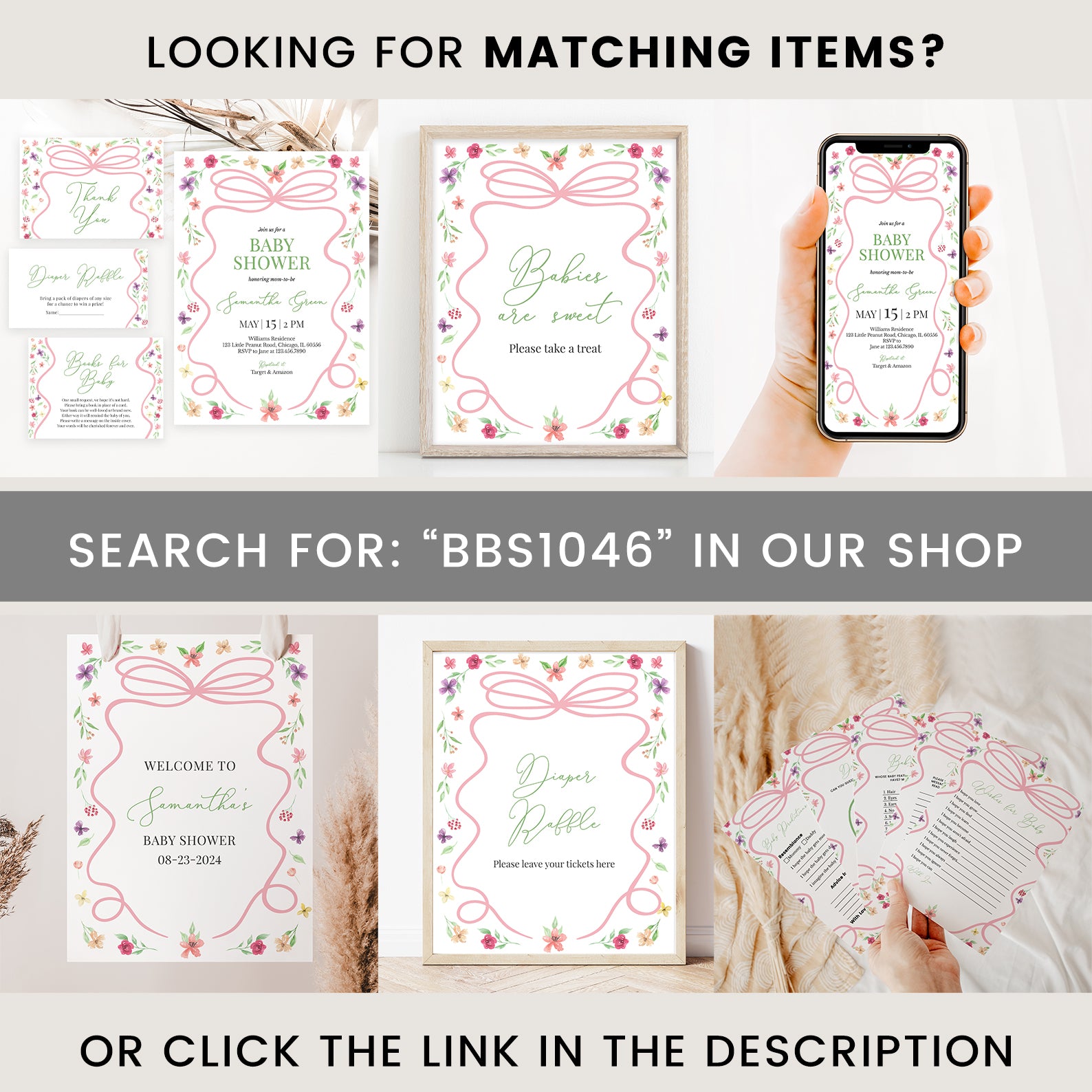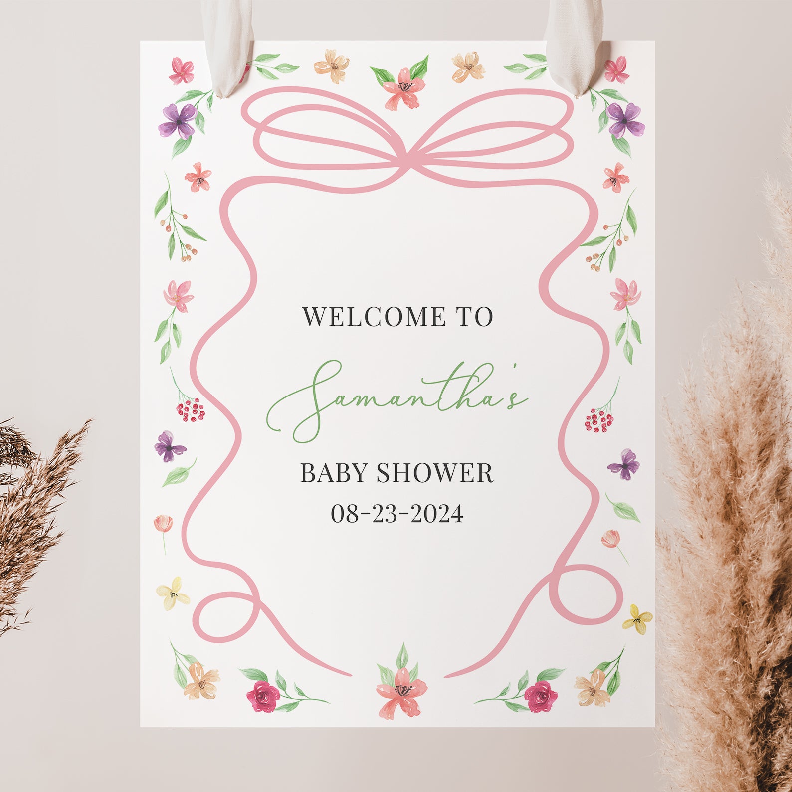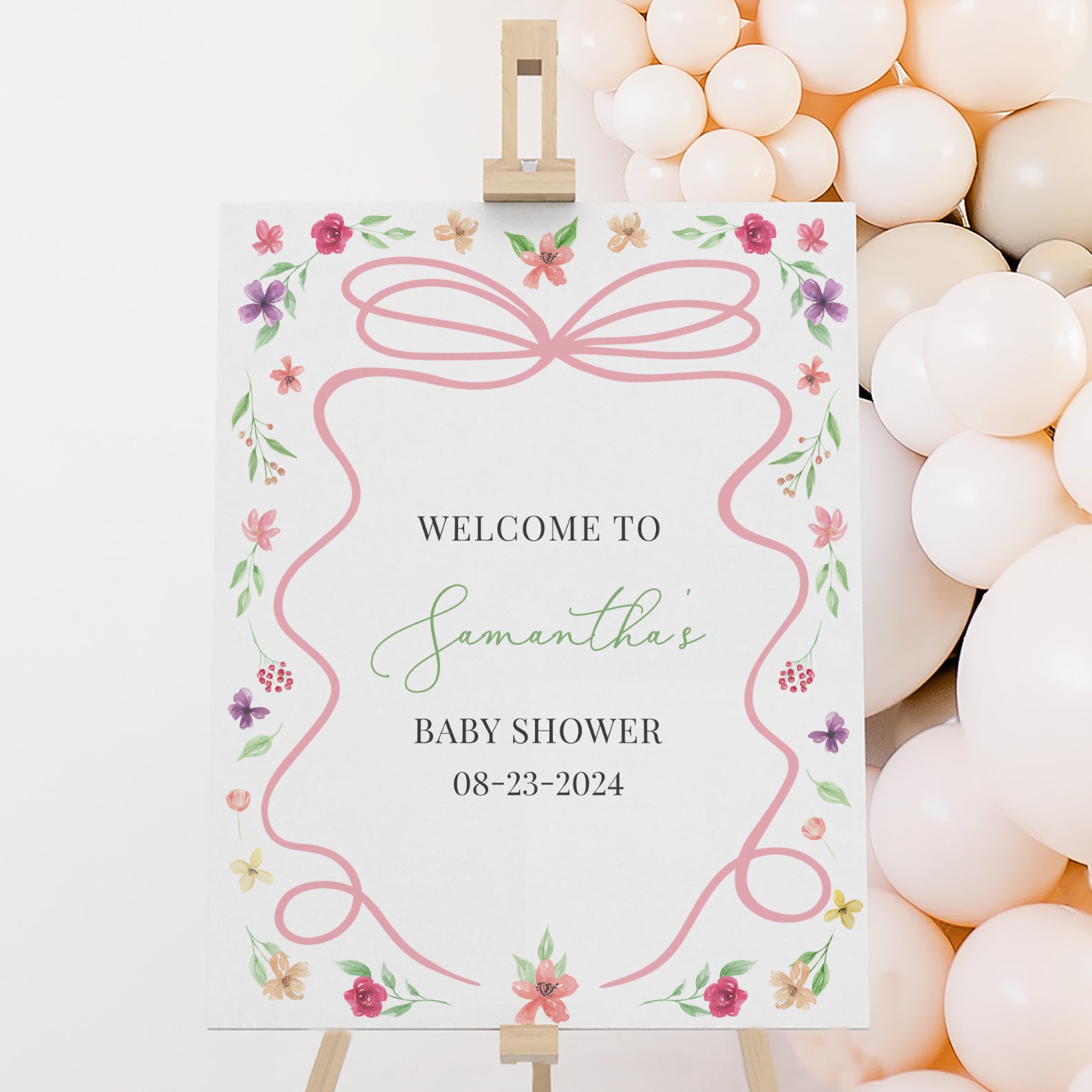 1. Purchase this Spring Baby Shower Digital Welcome Sign with Pink Ribbon & Flowers template