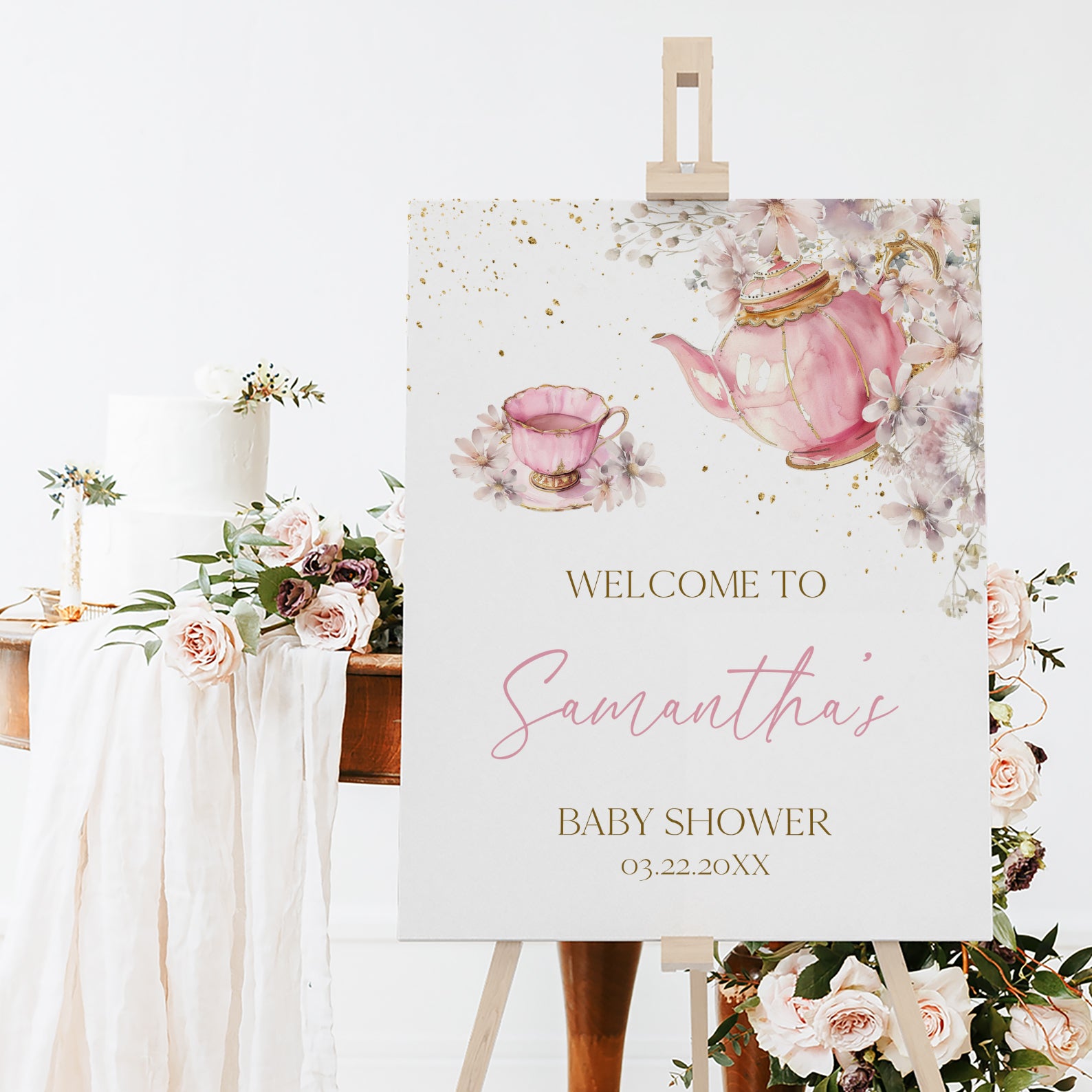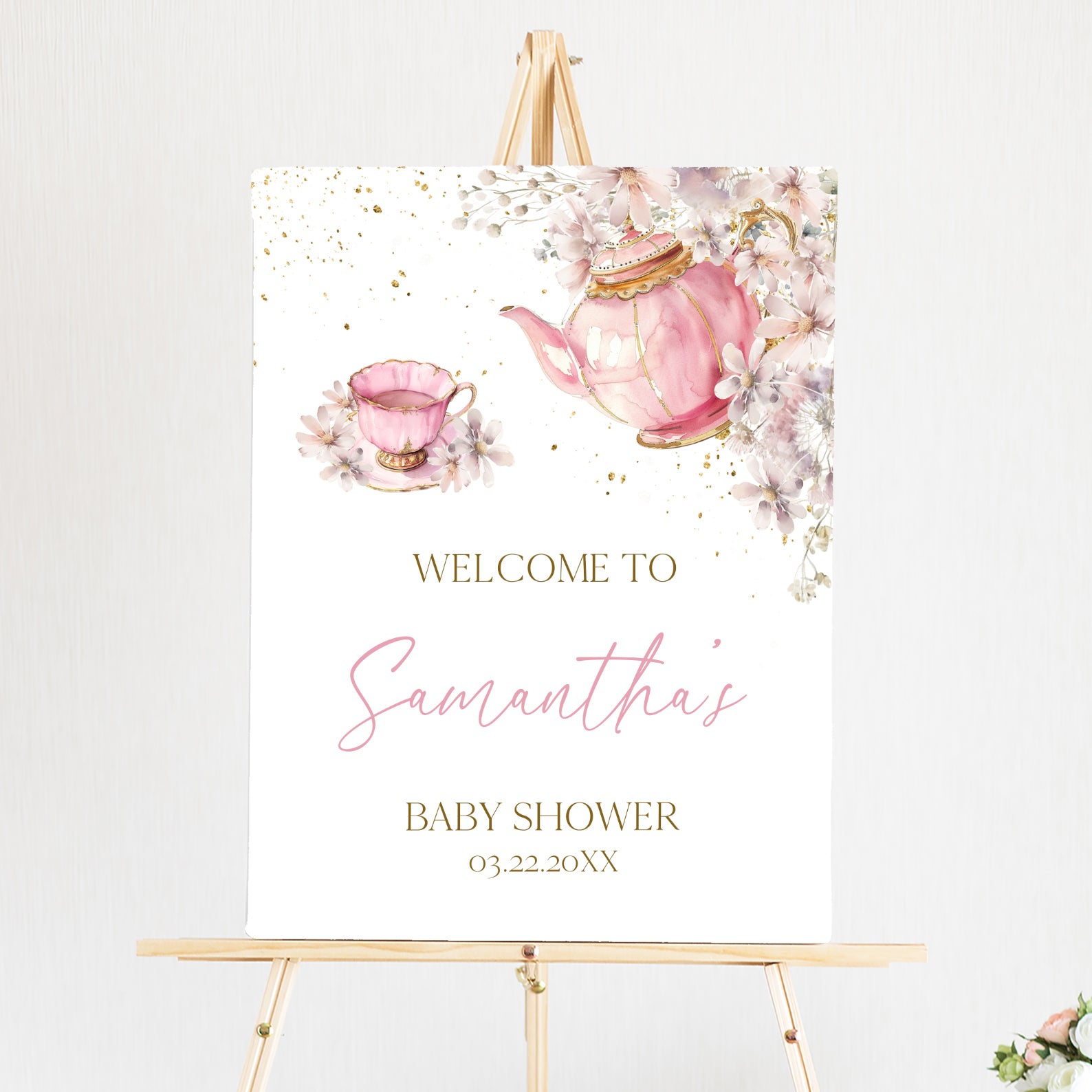 - Purchase this Spring Tea Party Baby Shower Welcome Sign with Pink Teapot & Gold template