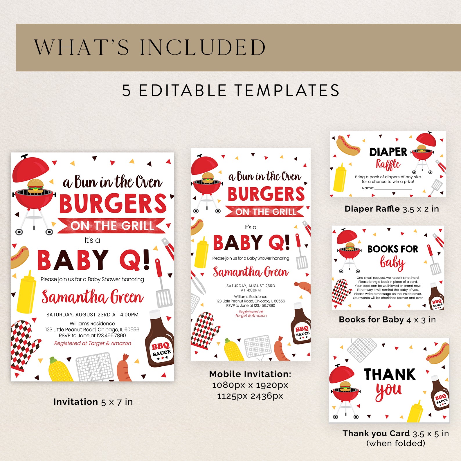 Celebrate your little one’s arrival with our fun "Baby Q" Summer Baby Shower Digital Invitation Bundle! Featuring a sizzling red grill, burgers, hotdogs, and BBQ essentials, this vibrant design sets the perfect tone for your celebration. The colorful confetti adds a festive touch, making it an exciting and memorable way to invite family and friends. Easy to customize and share, this bundle includes the invitation, mobile invite, diaper raffle, books for baby, and thank you card—everything you need for a perfect baby shower!