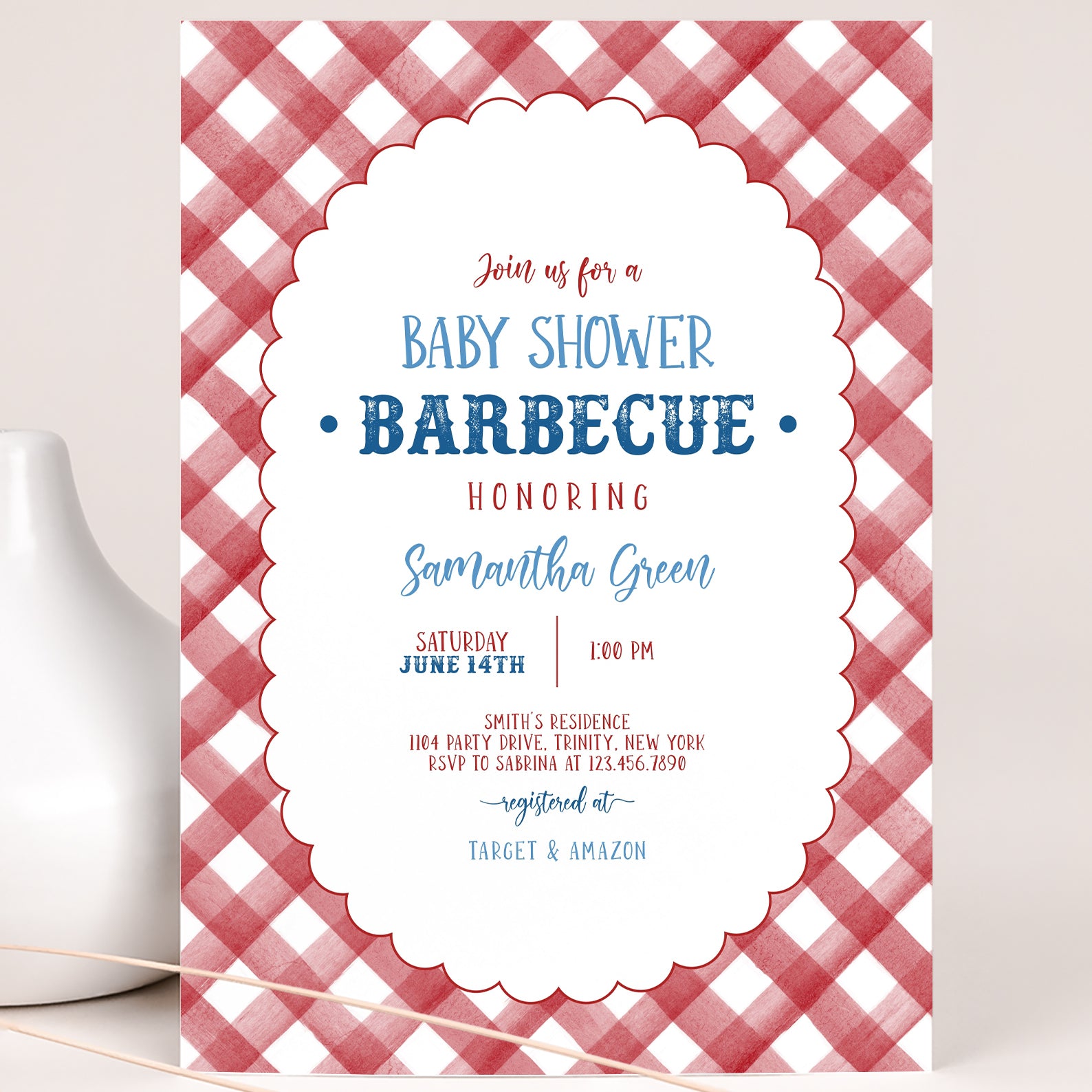 BBQ Baby Shower Digital Invitation: Red Check & Scalloped