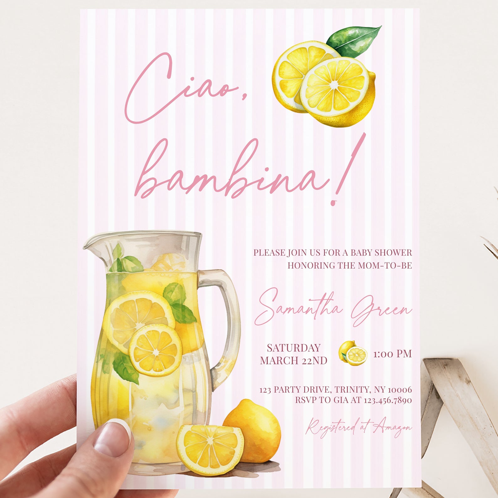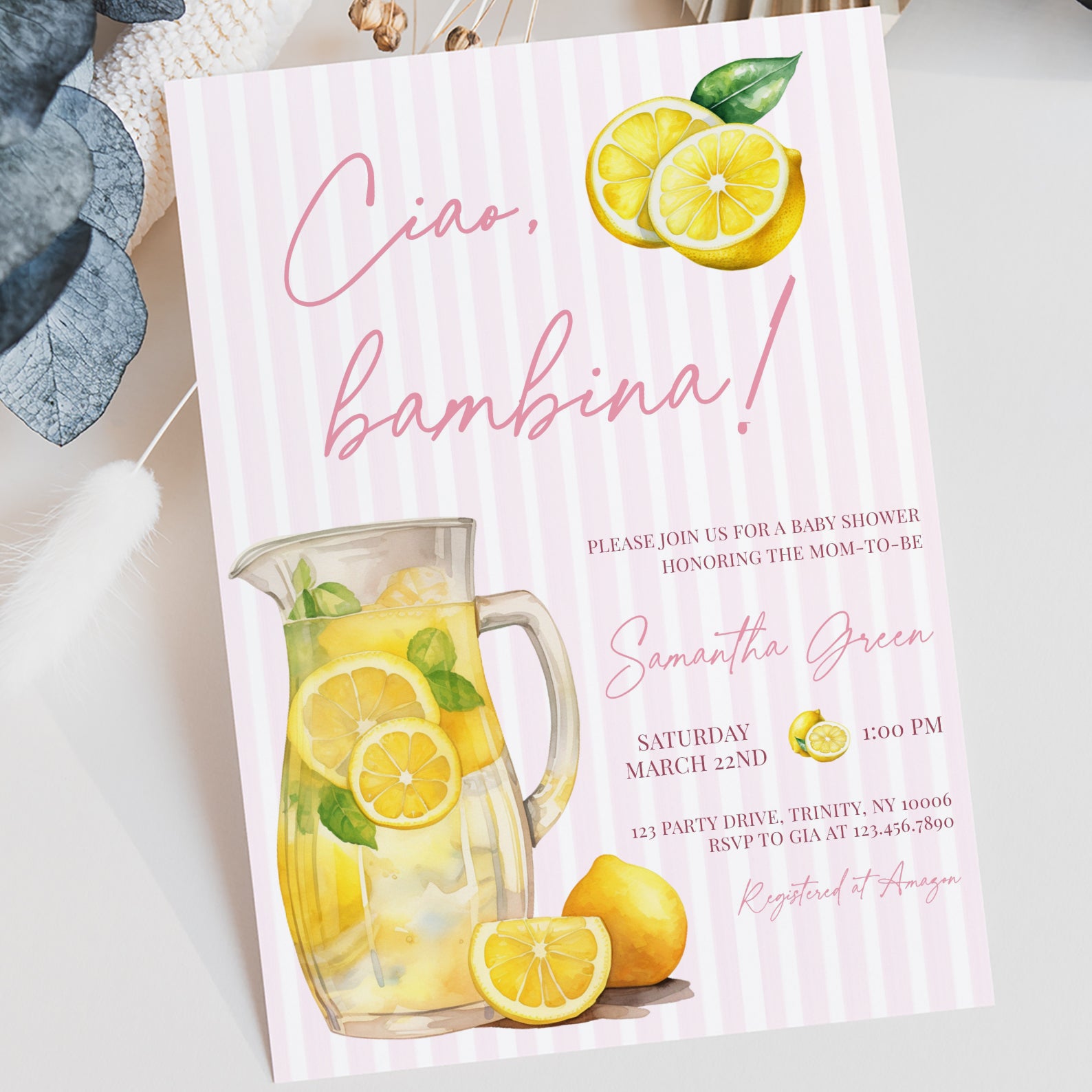 Celebrate your little one's upcoming arrival with our charming summer baby shower digital invitation, "Ciao, Bambina!" Featuring a delightful pitcher of fresh lemon juice against a playful pink vertical stripes background, this invitation sets the perfect tone for a sunny celebration. Easy to customize and share, it adds a touch of whimsy and warmth to your event, ensuring your guests feel the joy and excitement of welcoming your new bundle of joy. Make your baby shower unforgettable with this vibrant and inviting design!