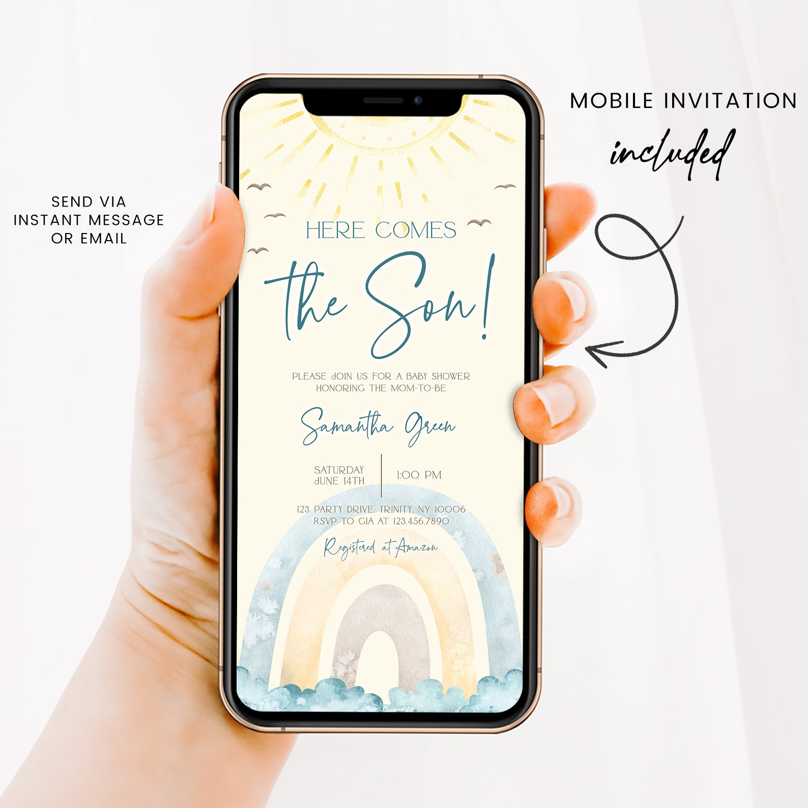 Celebrate your little one's upcoming arrival with our charming summer baby shower digital invitation! Featuring a delightful watercolor theme, this invitation showcases radiant sun rays at the top, whimsical flying birds on the side, and a serene blue boho rainbow with fluffy clouds at the bottom, all set against a soft yellow pastel background. Perfect for setting a joyful tone for your celebration, this invitation is easy to customize and share, making it a breeze to gather friends and family for a memorable day.