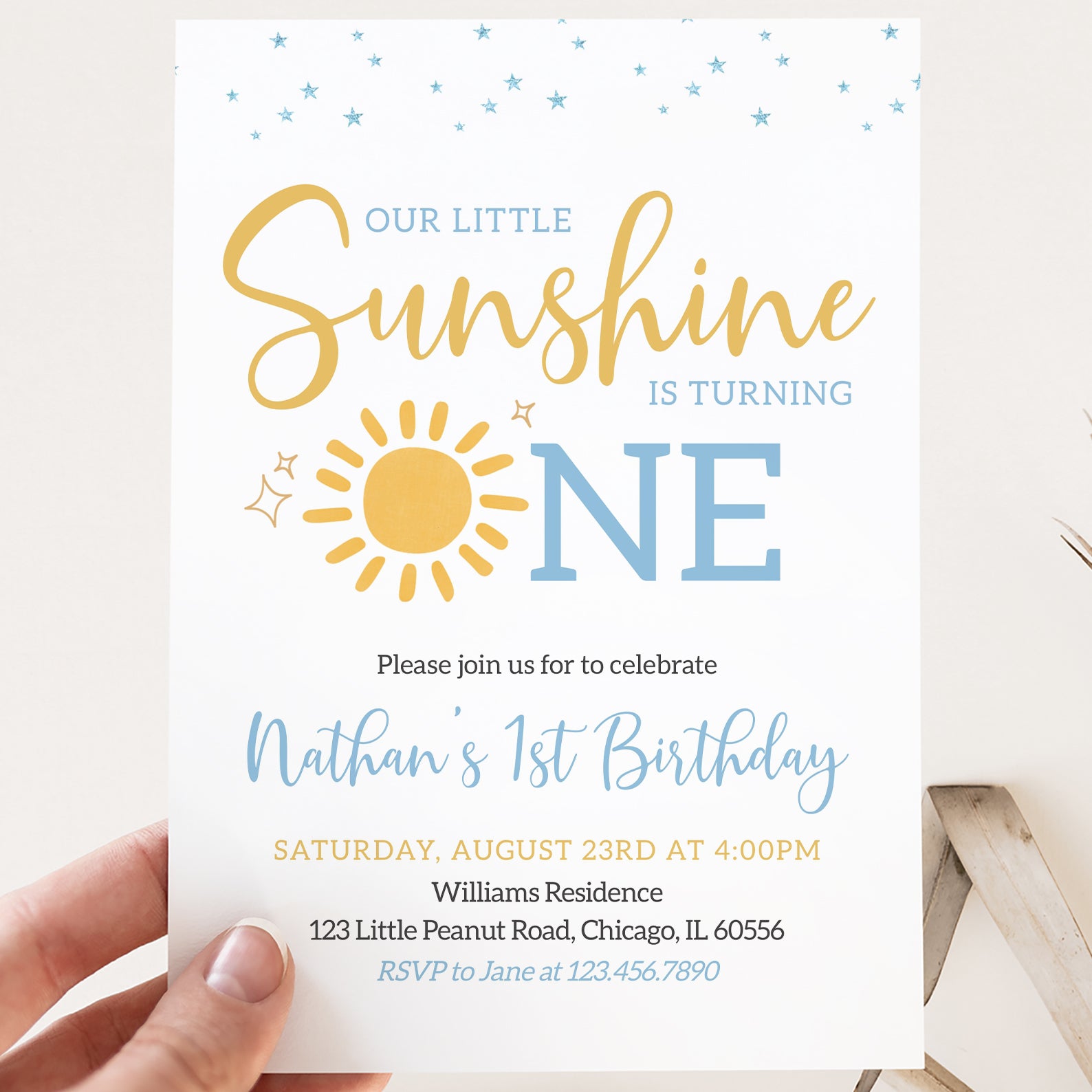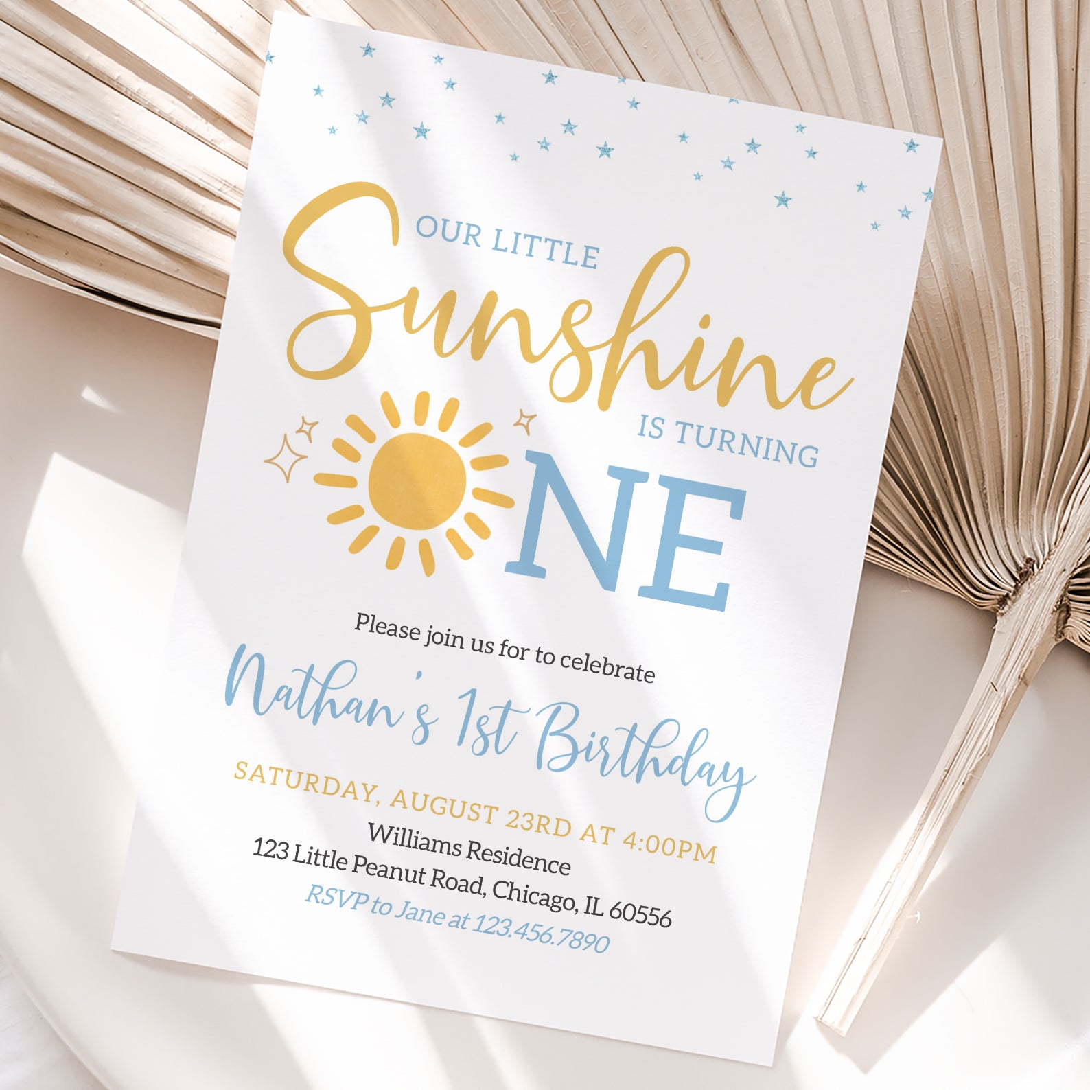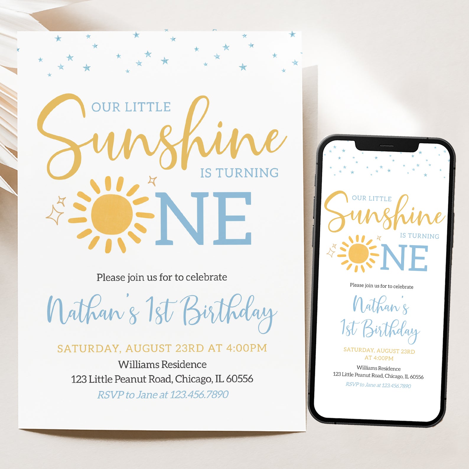 Celebrate your little sunshine's first birthday with our charming digital invitation! Featuring a delightful blue and yellow theme, this invitation showcases playful blue stars at the top and an adorable sun that radiates joy. Perfect for summer festivities, it sets the tone for a fun-filled celebration as you gather friends and family to honor this special milestone. Make your child's birthday unforgettable with this vibrant and inviting design!