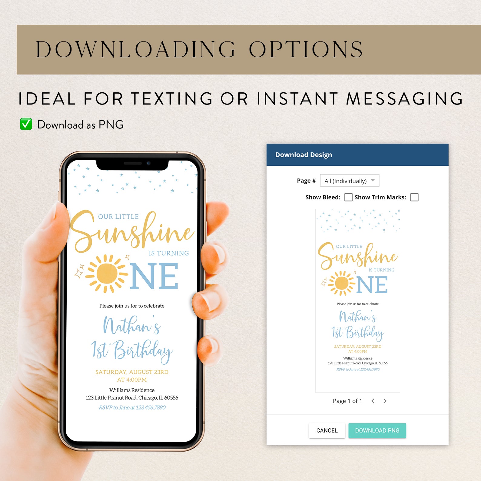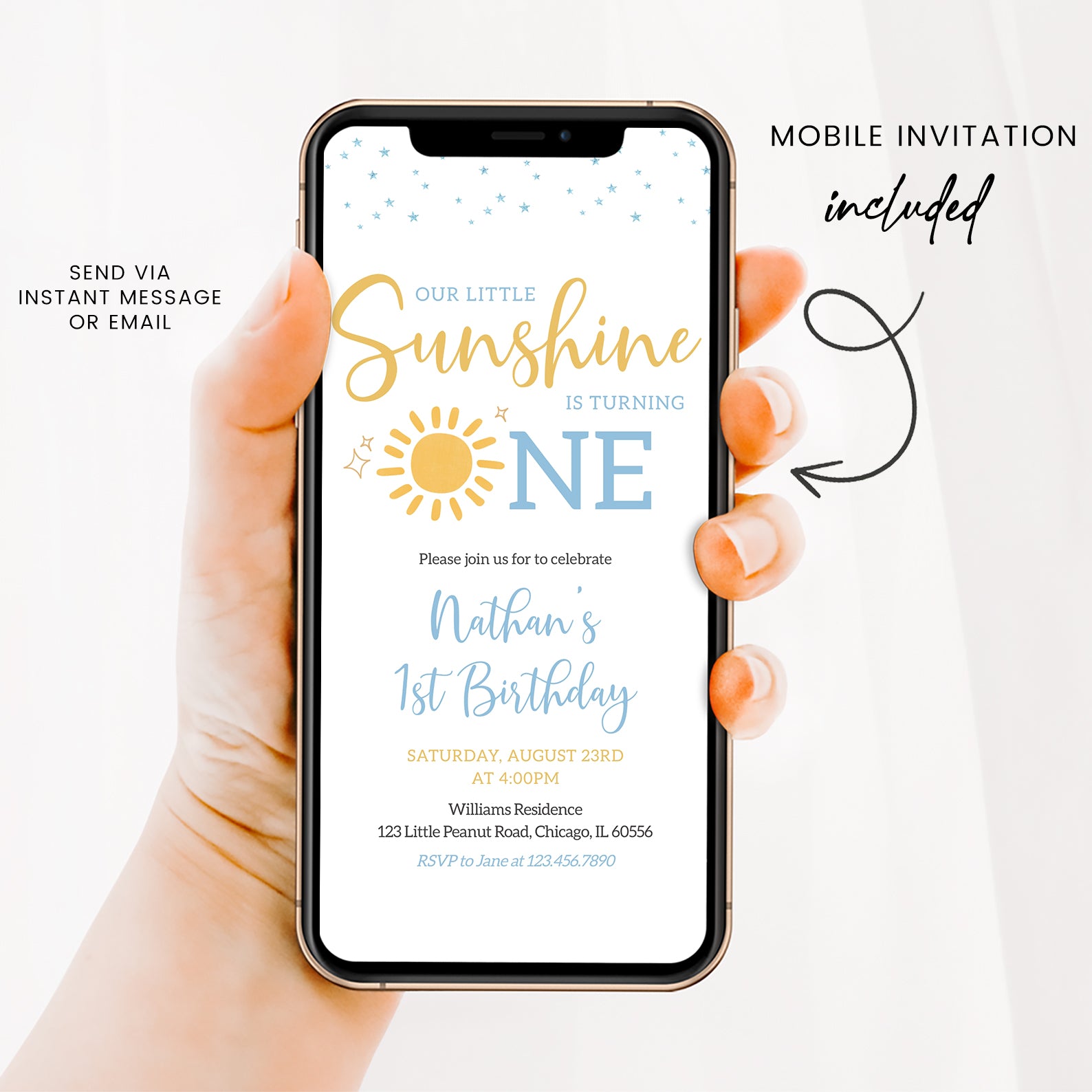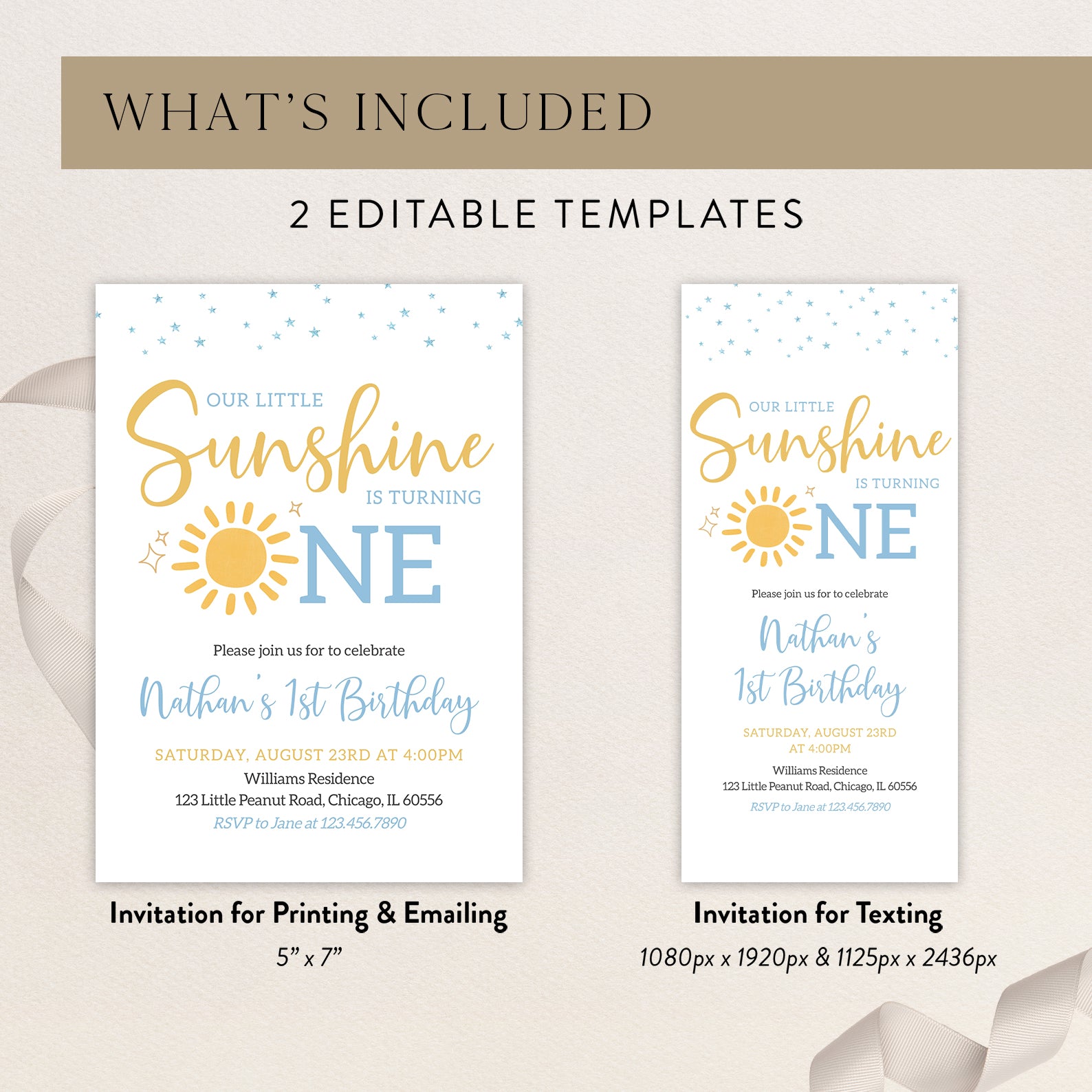 Celebrate your little sunshine's first birthday with our charming digital invitation! Featuring a delightful blue and yellow theme, this invitation showcases playful blue stars at the top and an adorable sun that radiates joy. Perfect for summer festivities, it sets the tone for a fun-filled celebration as you gather friends and family to honor this special milestone. Make your child's birthday unforgettable with this vibrant and inviting design!