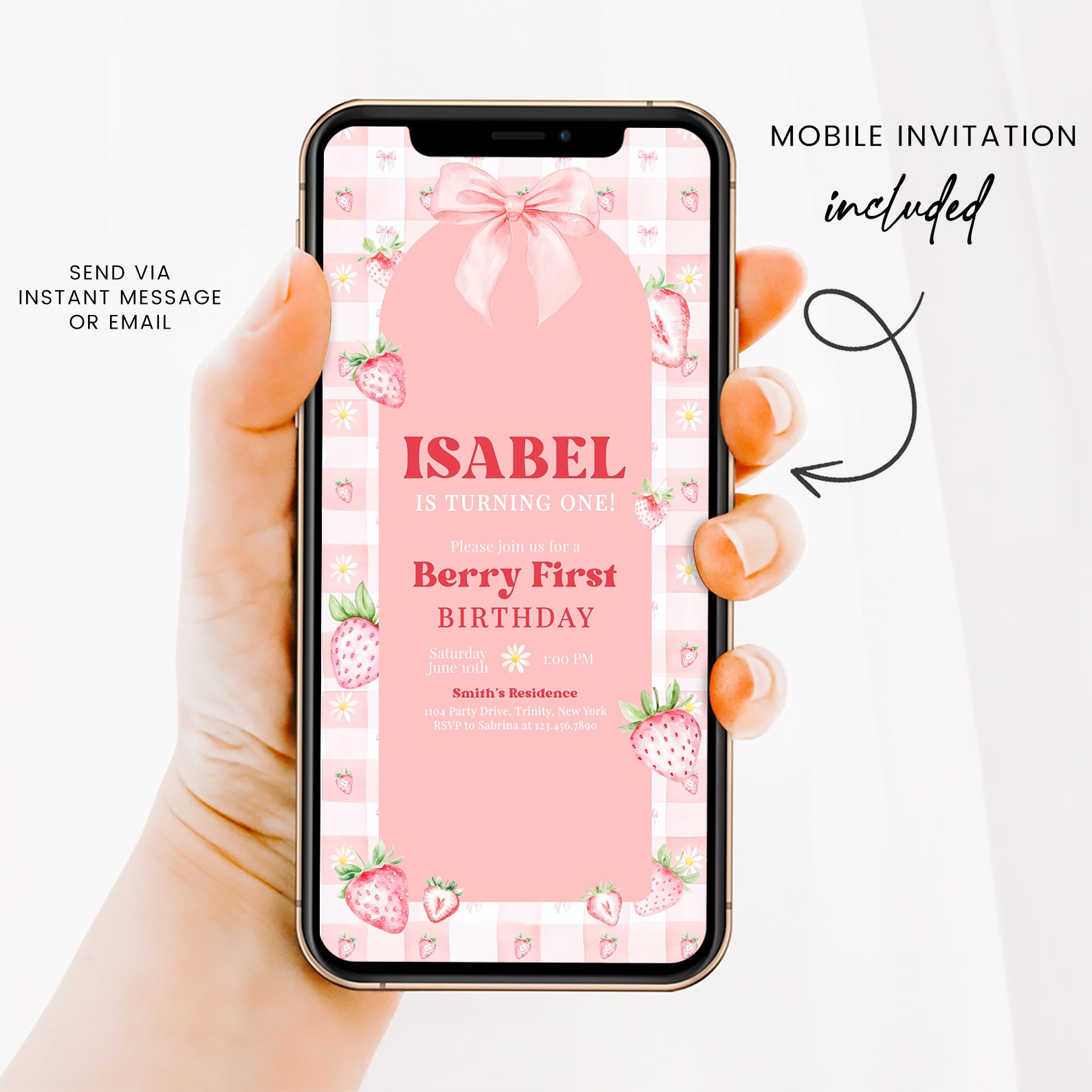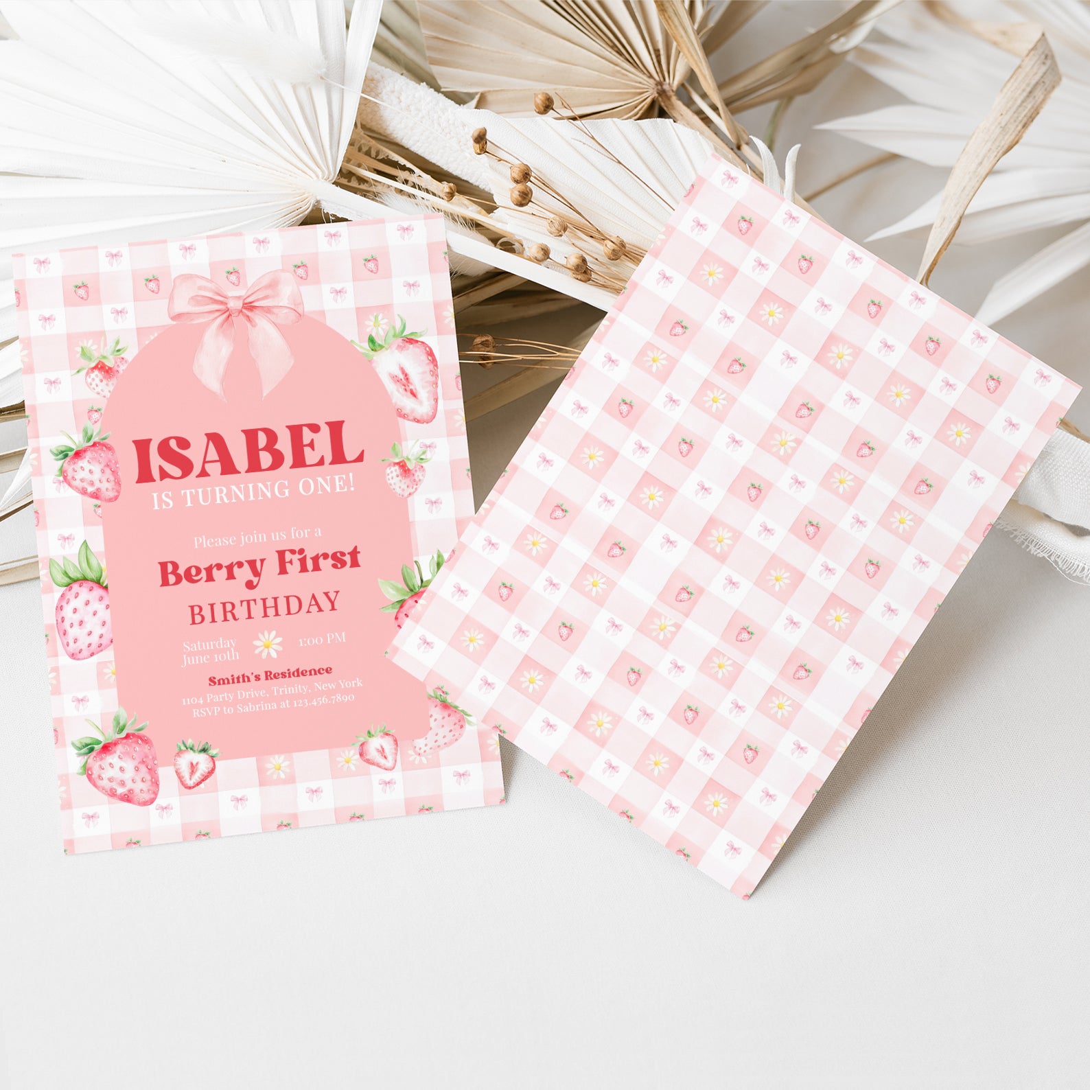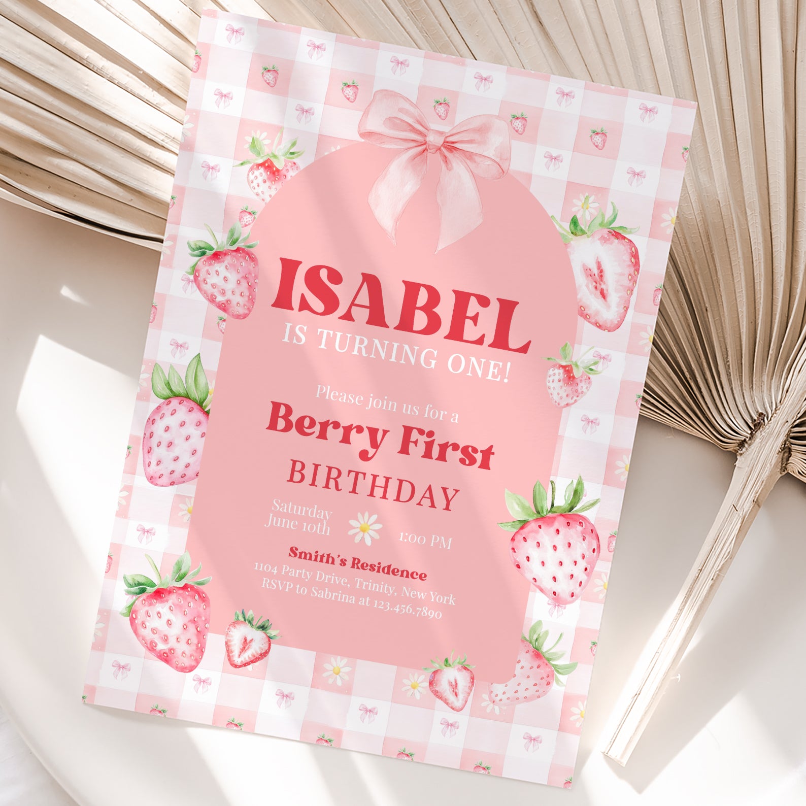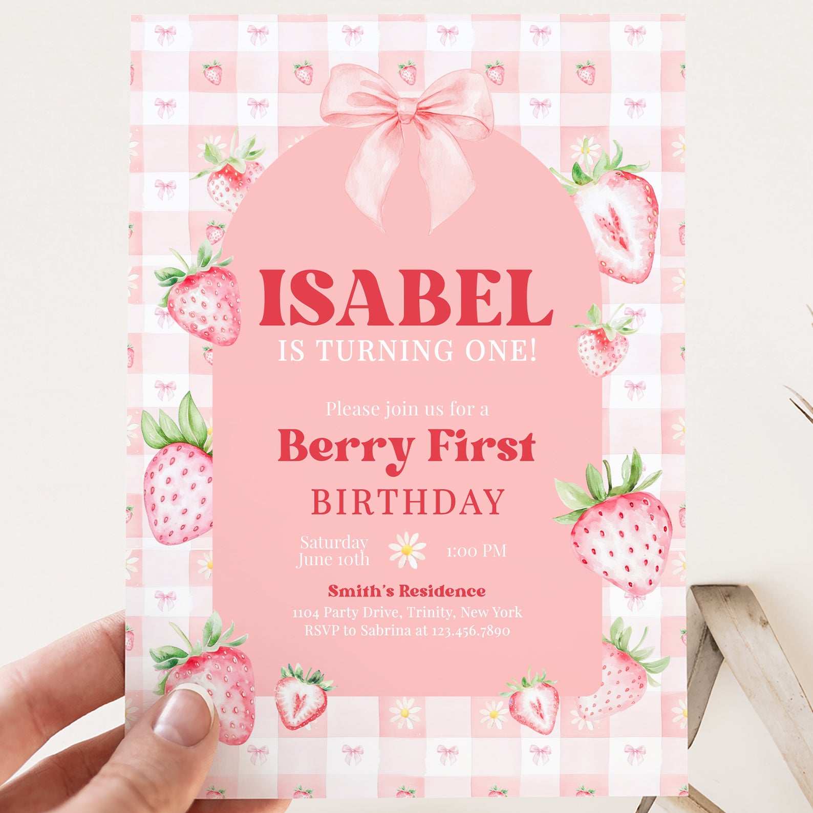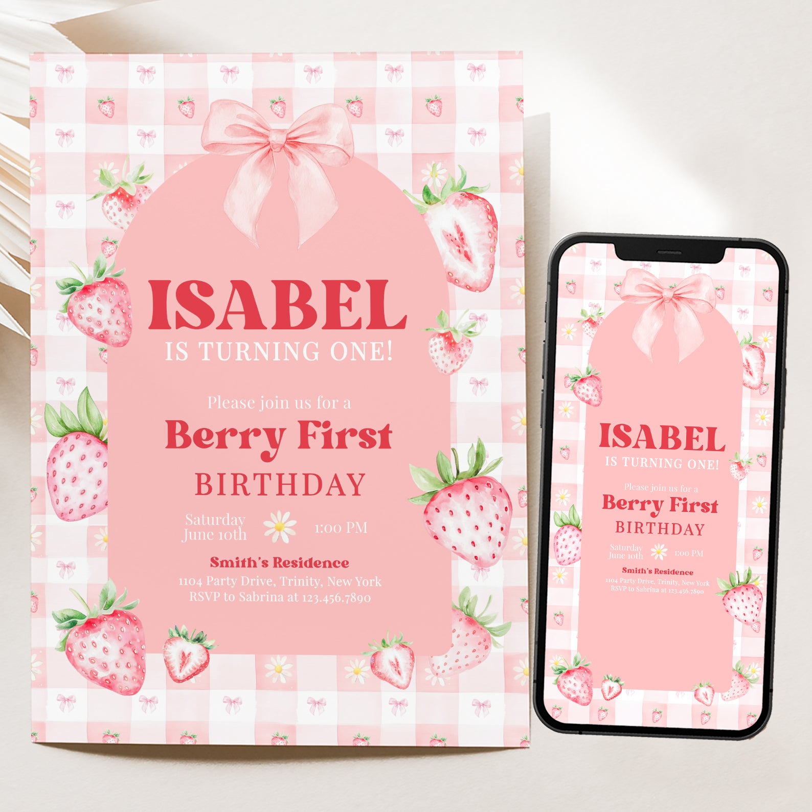 Celebrate your little one's first birthday in style with our charming summer birthday digital invitation! Featuring a delightful pink arch adorned with a pastel pink ribbon, this invitation is beautifully framed by fresh watercolor strawberries and a playful pink checkered background. Perfectly designed with whimsical daisies, it sets the tone for a joyful celebration that your guests will love. Make your child's milestone unforgettable with this enchanting invitation that captures the essence of summer fun!