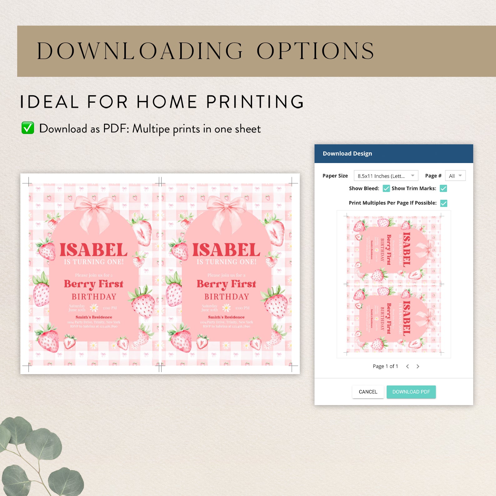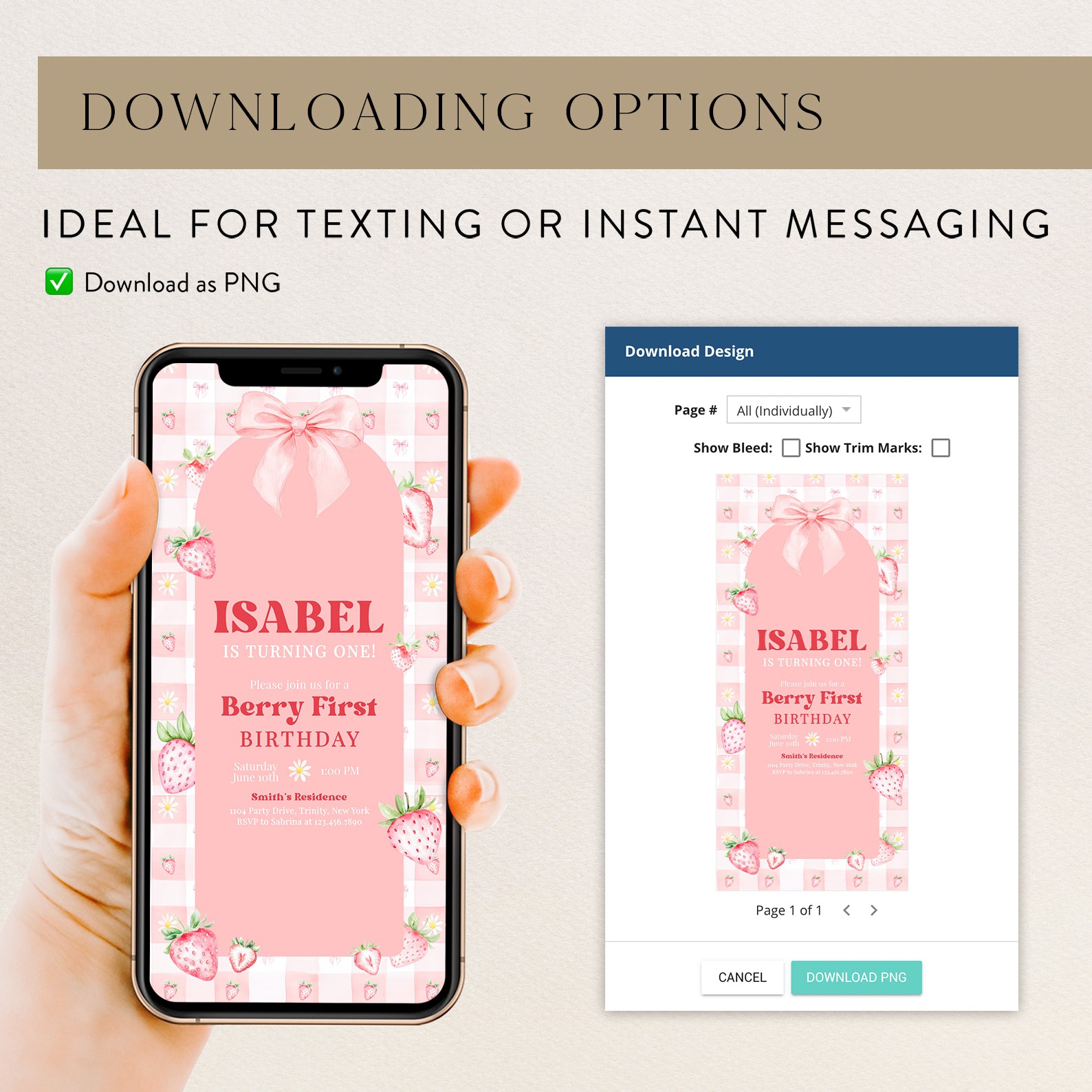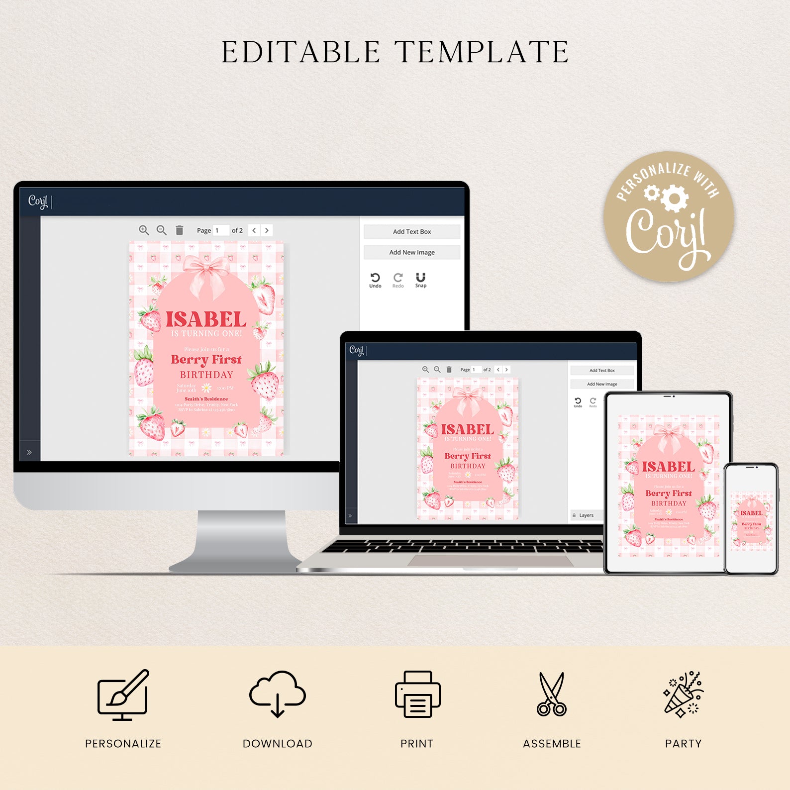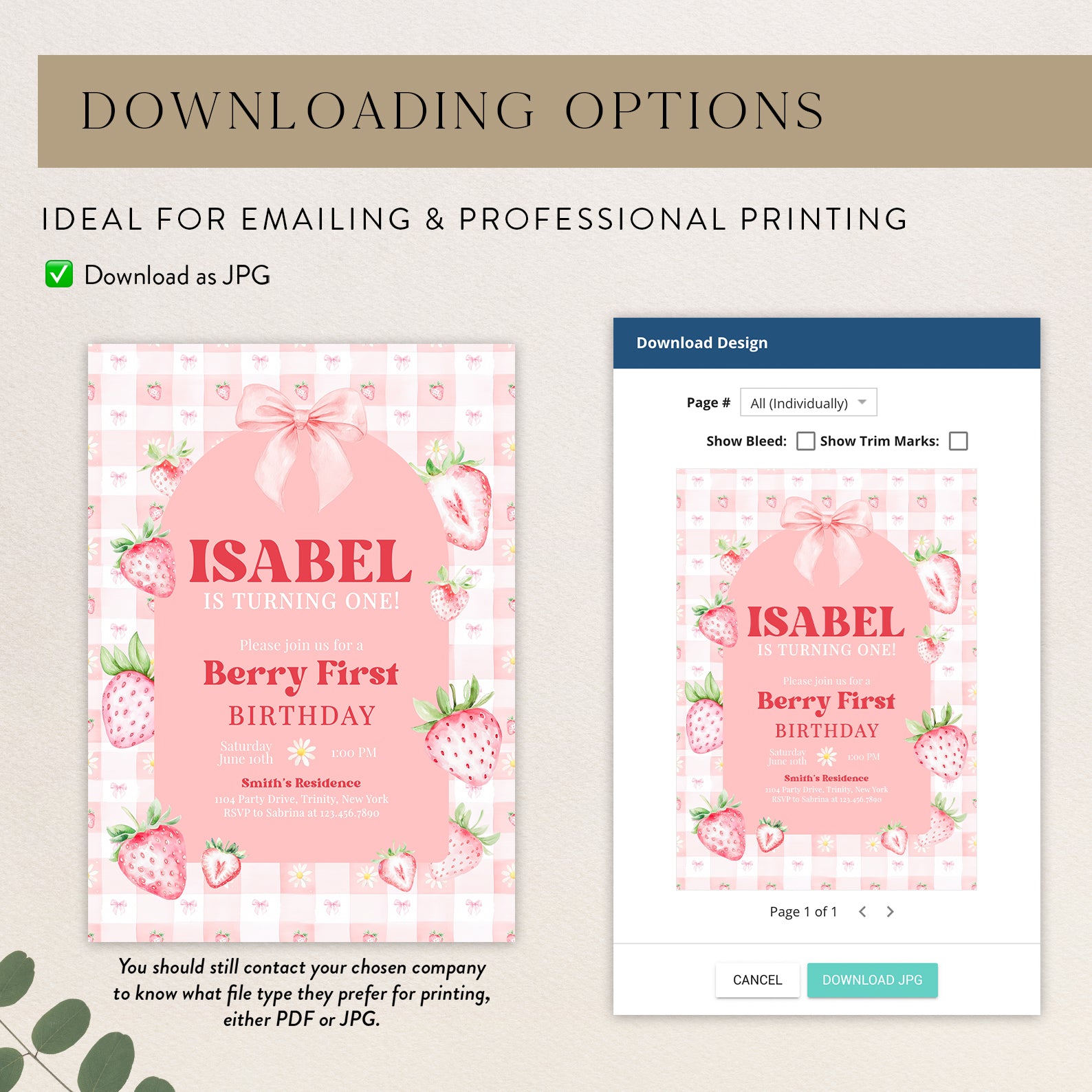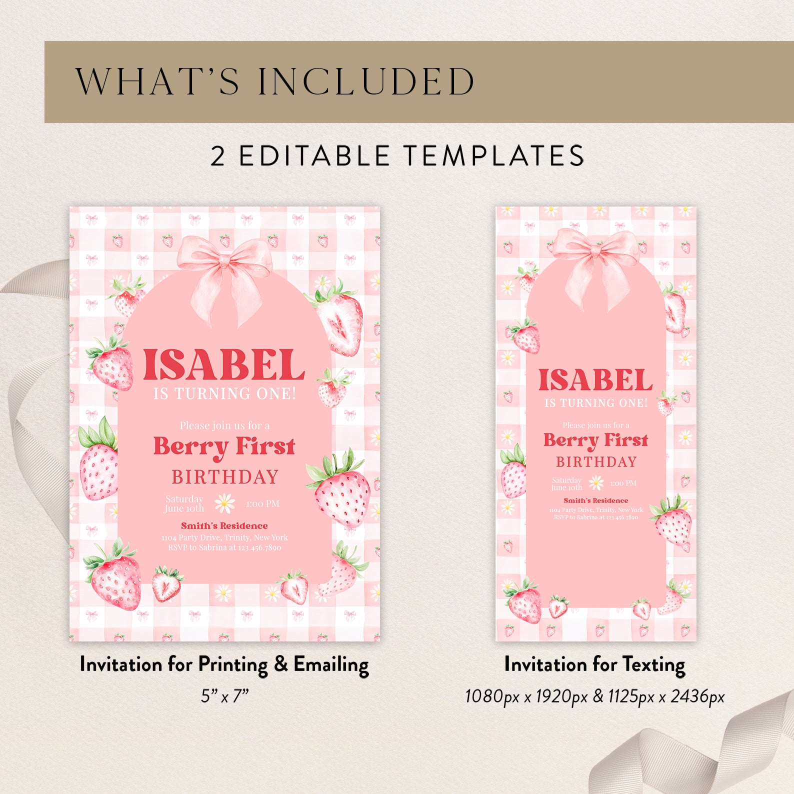 - Purchase this Pastel Strawberry 1st Birthday Digital Invite with Pink Arch template