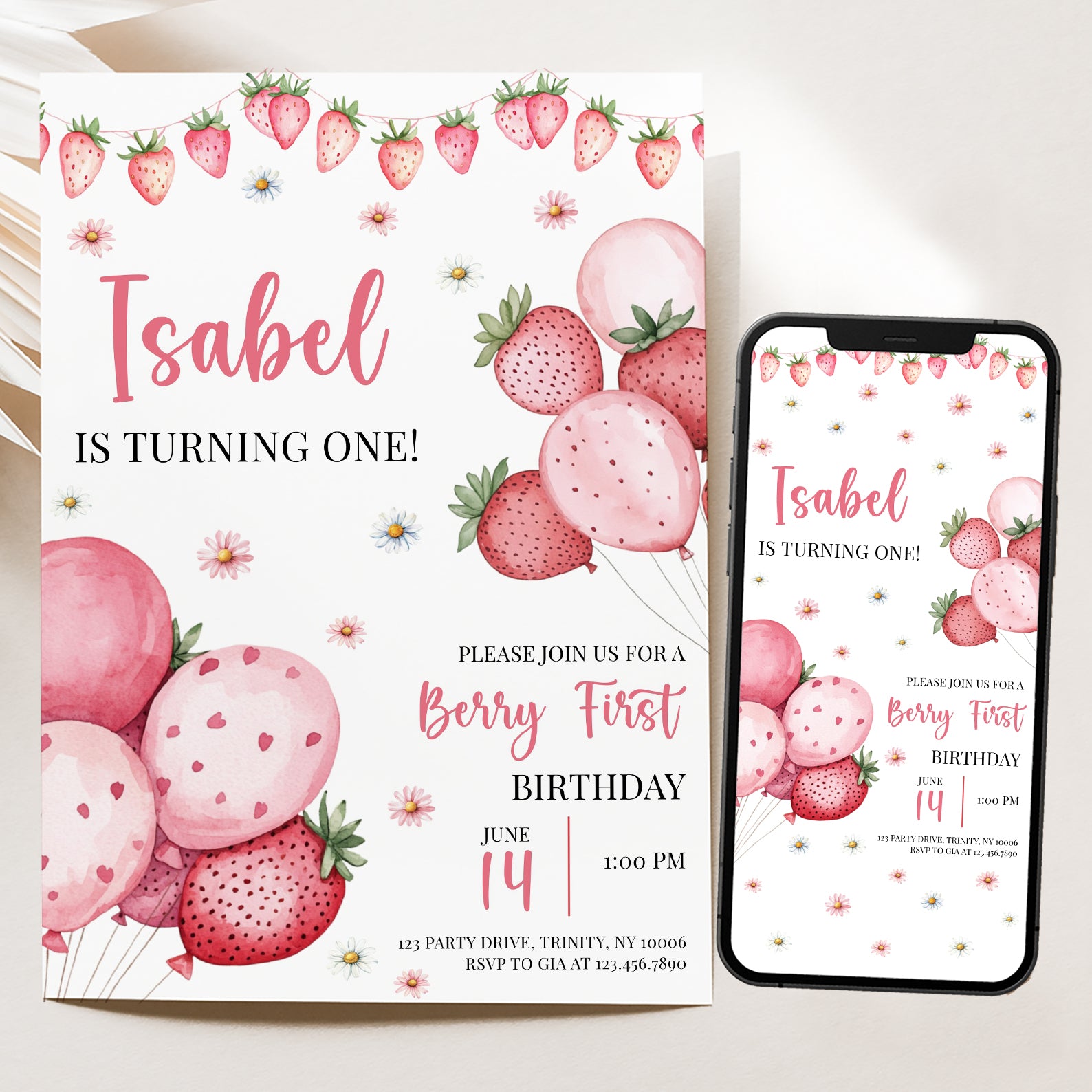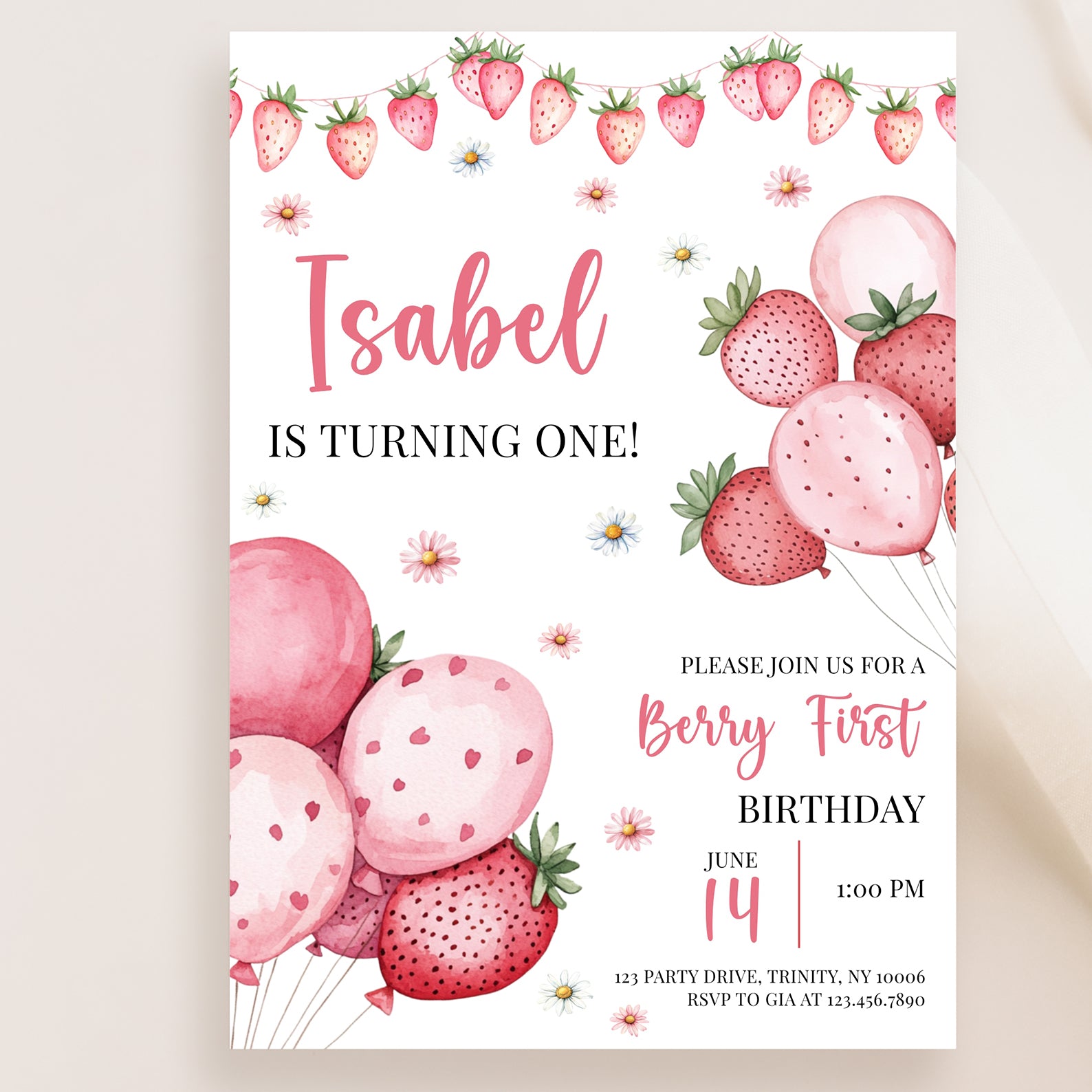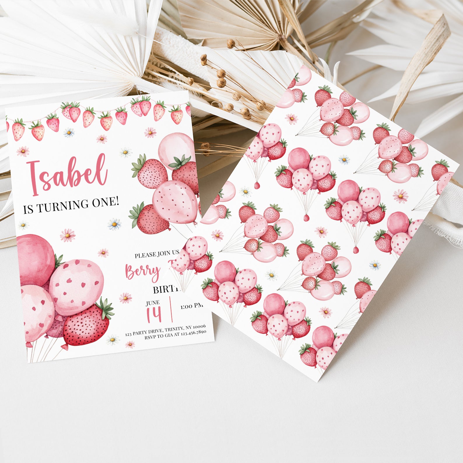 - Purchase this Summer 1st Birthday Invite with Strawberries & Balloons template