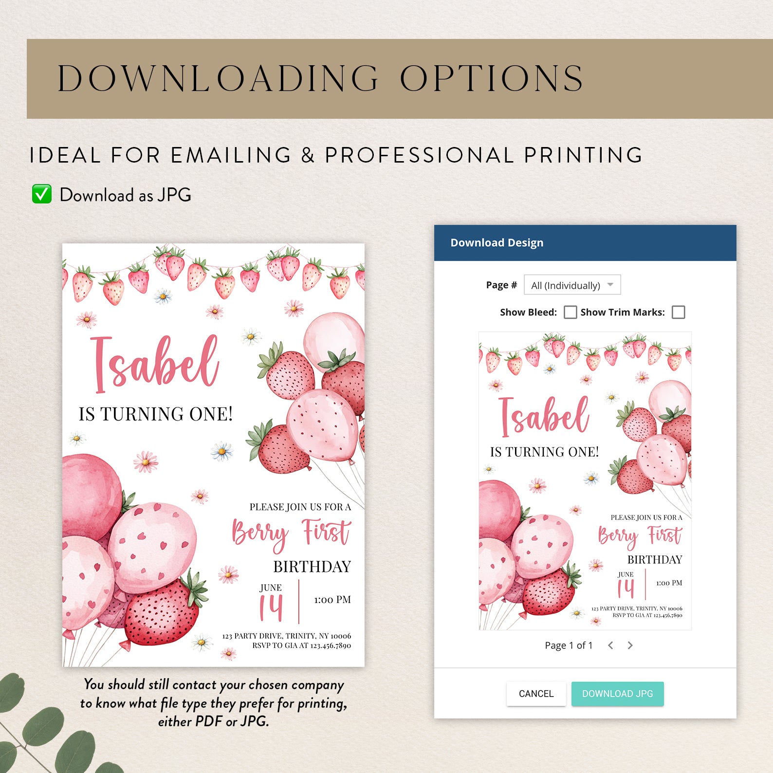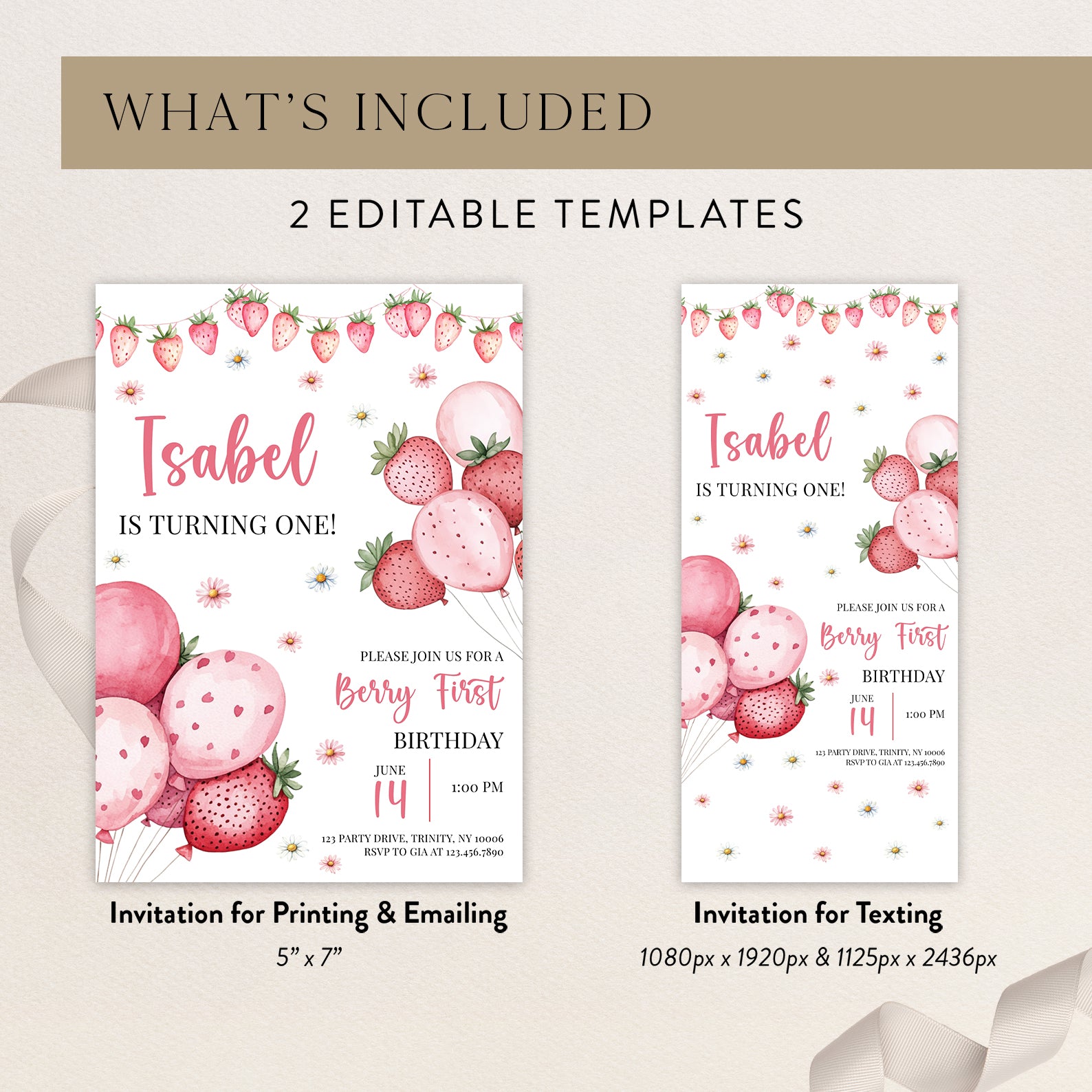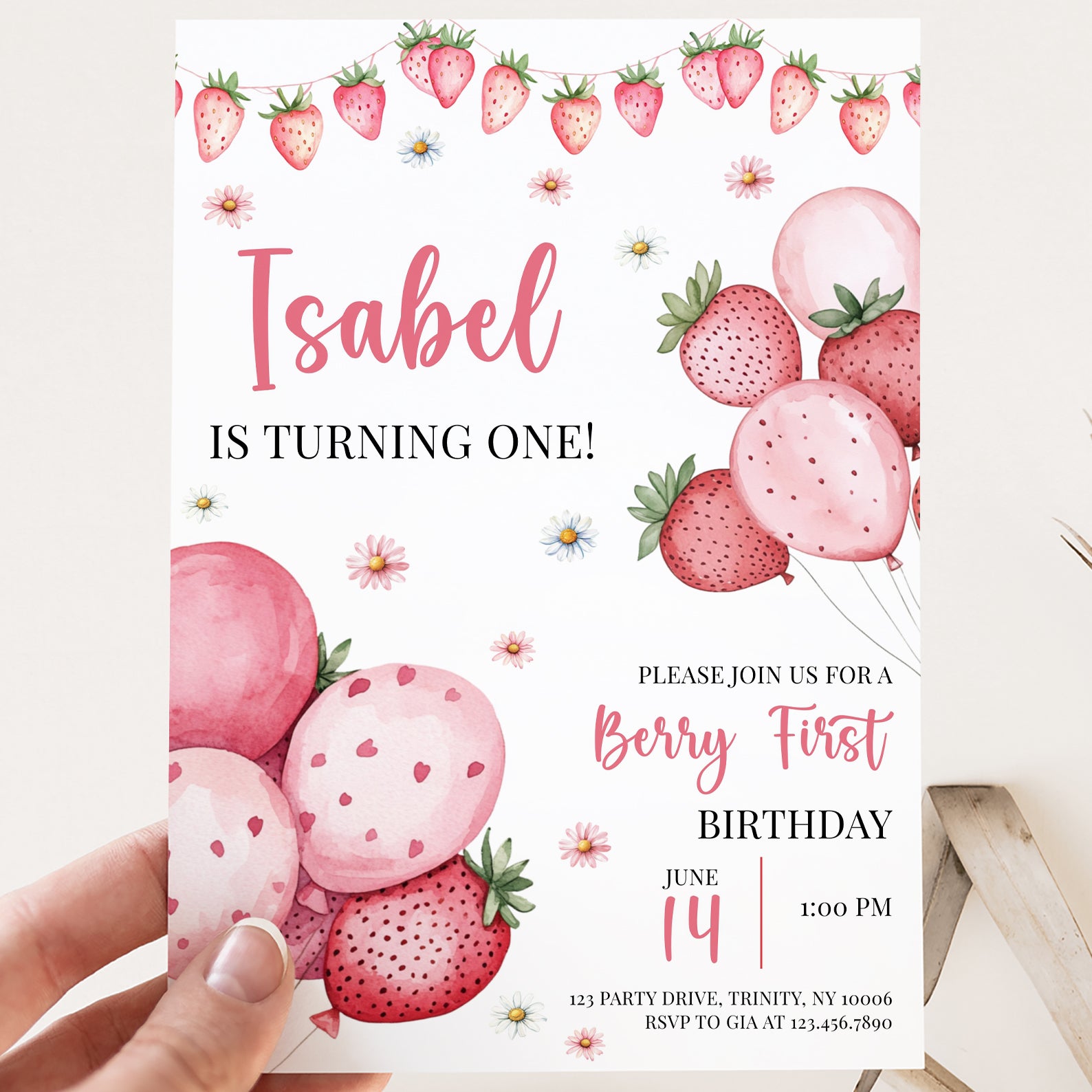 - Purchase this Summer 1st Birthday Invite with Strawberries & Balloons template