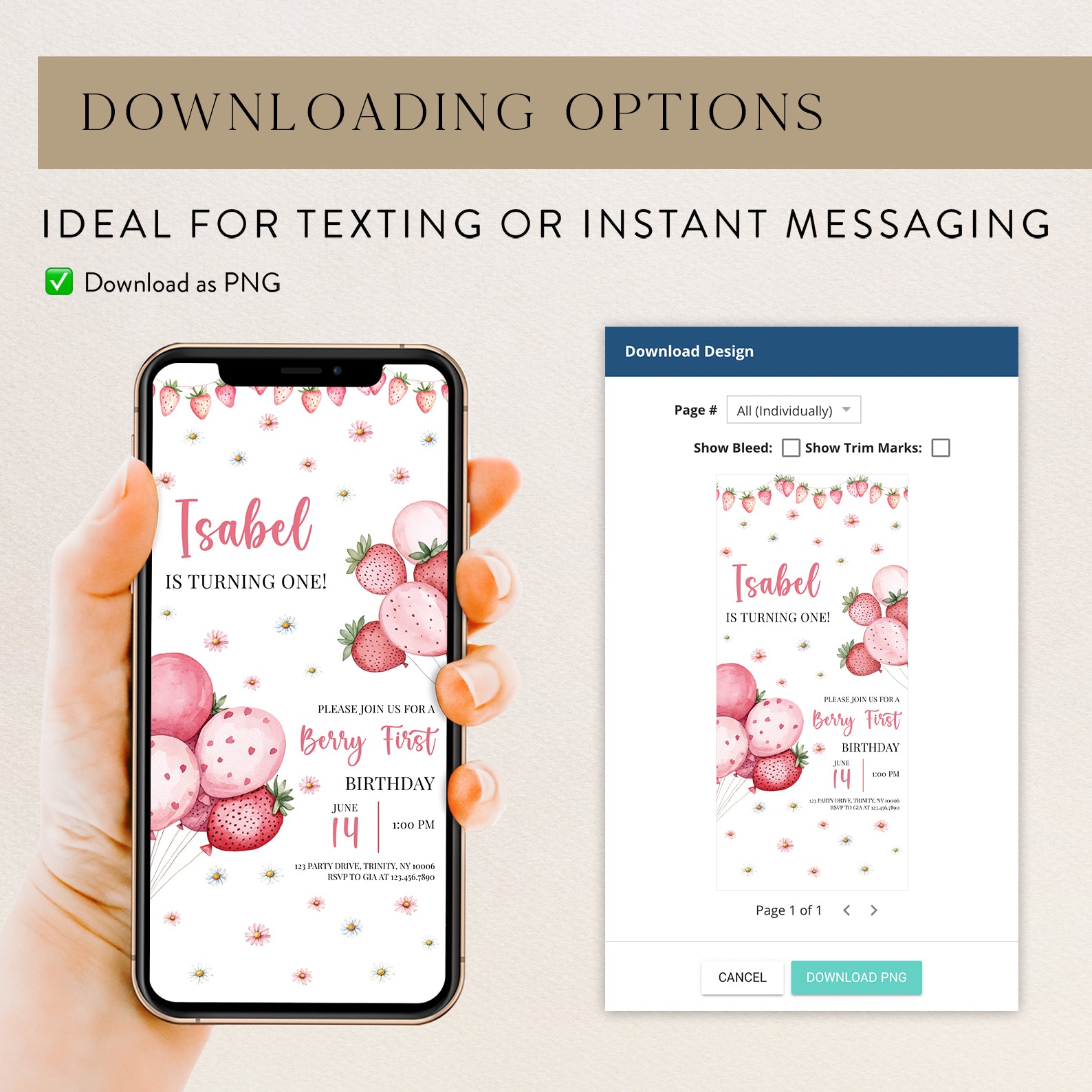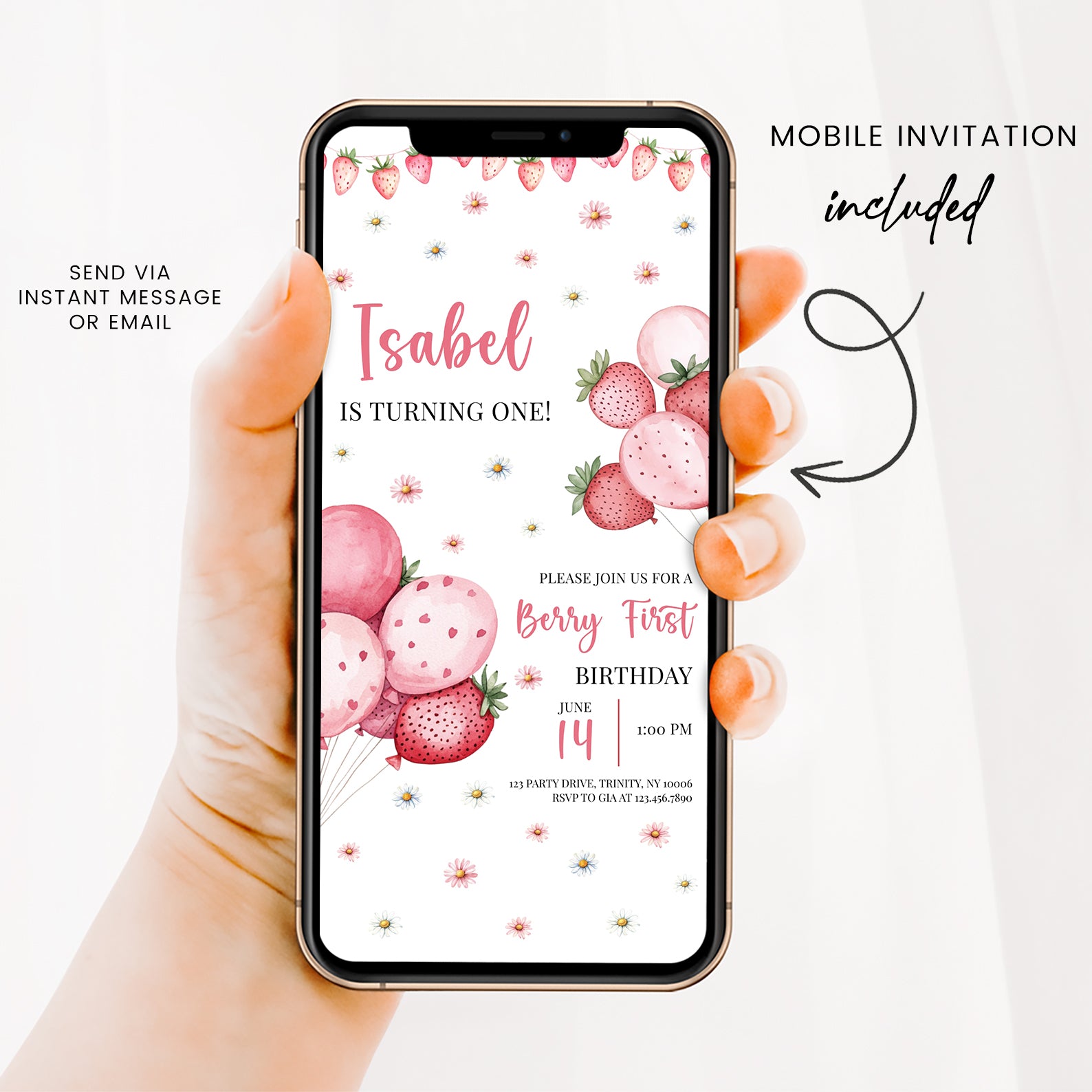 Celebrate your little one's first birthday with our enchanting Summer-themed digital invitation! Adorned with a delightful watercolor strawberry banner at the top, this charming design features playful pink balloons and strawberry-shaped accents, all beautifully framed by falling pink and white daisy flowers. Perfect for setting a joyful tone for your summer celebration, this invitation is not only visually stunning but also easy to share with friends and family. Make your child's special day unforgettable with this whimsical and vibrant invitation that captures the essence of a sunny birthday bash!