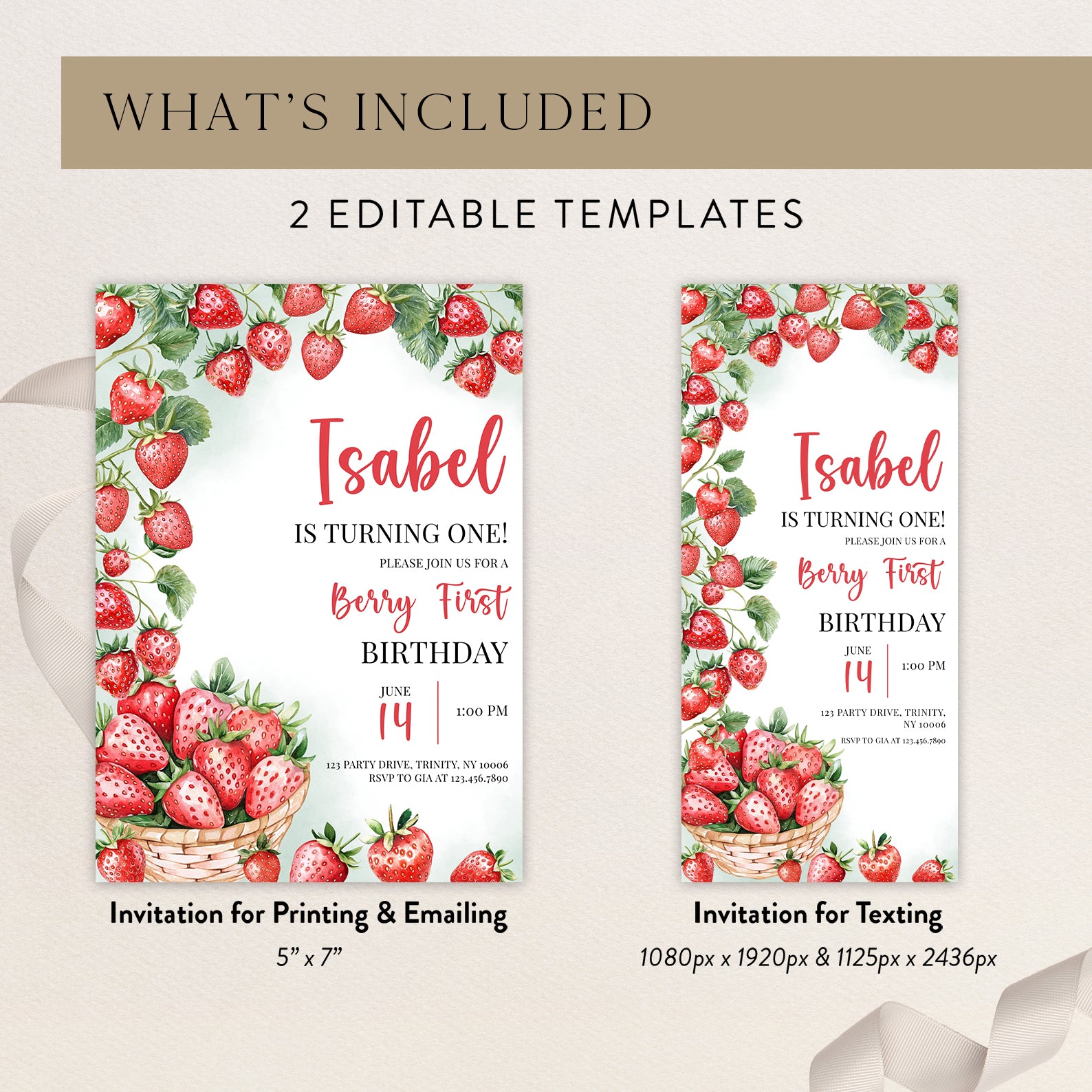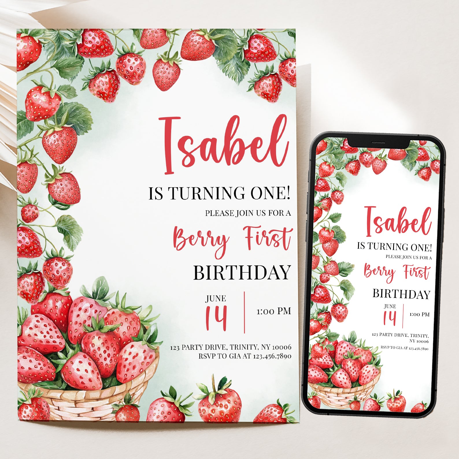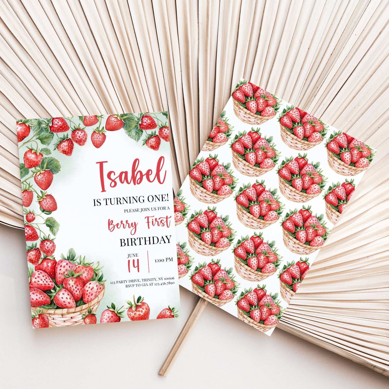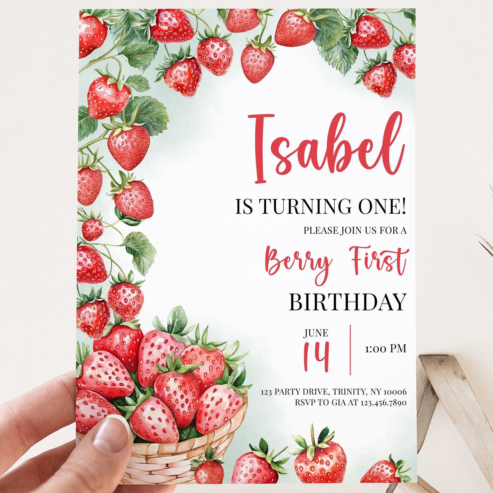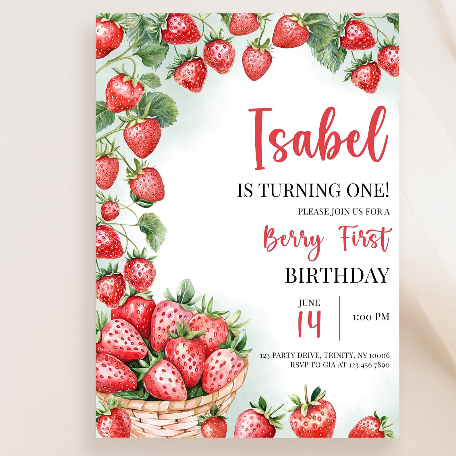 - Purchase this Summer 1st Birthday Invite with Watercolor Strawberry Vine template