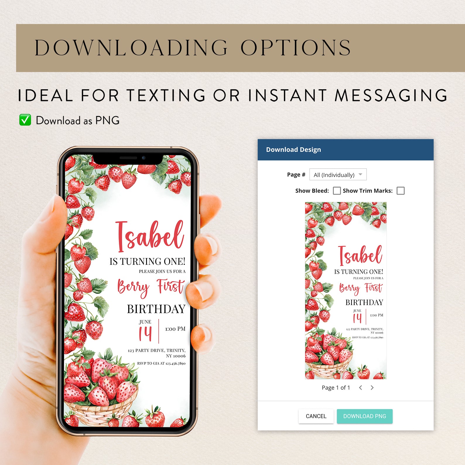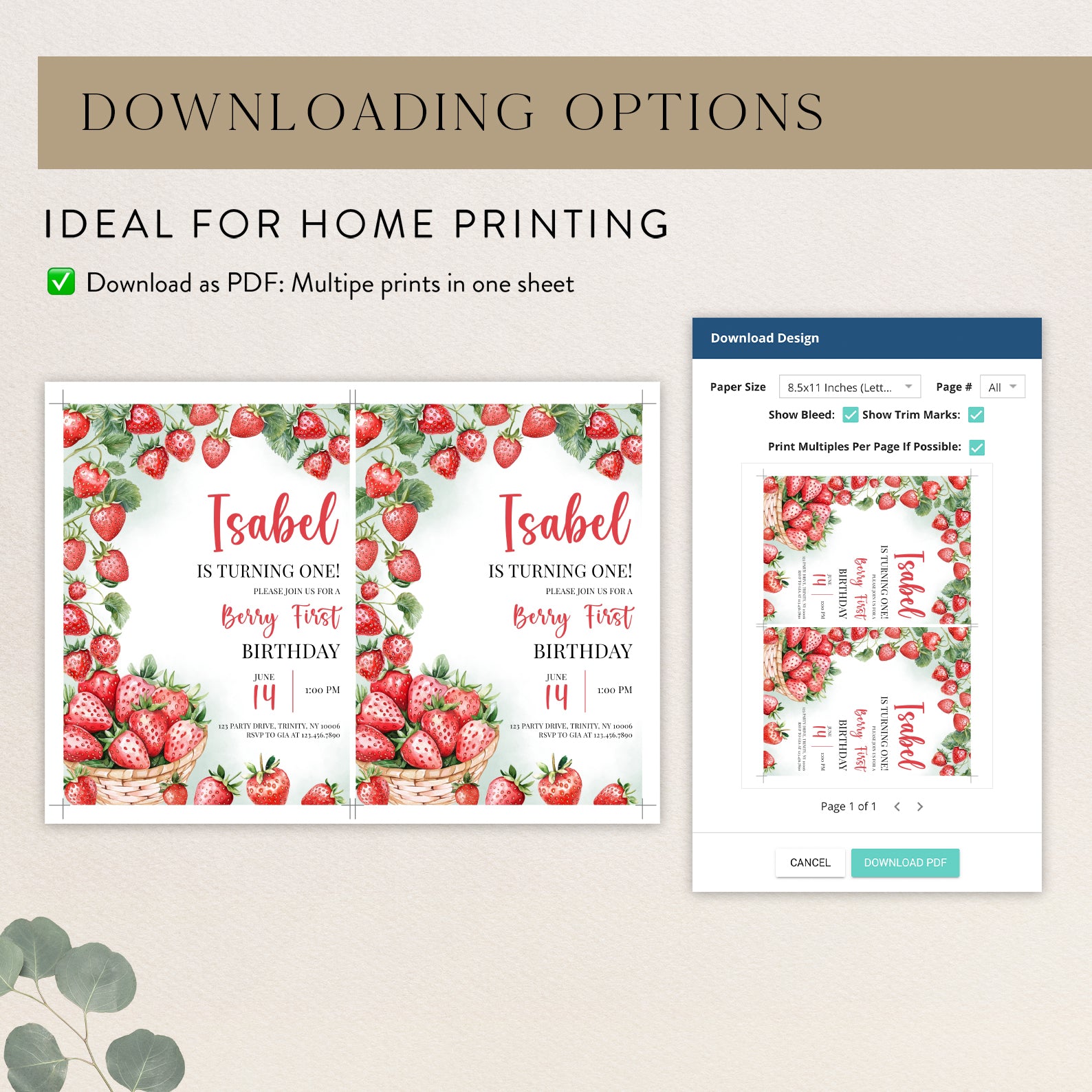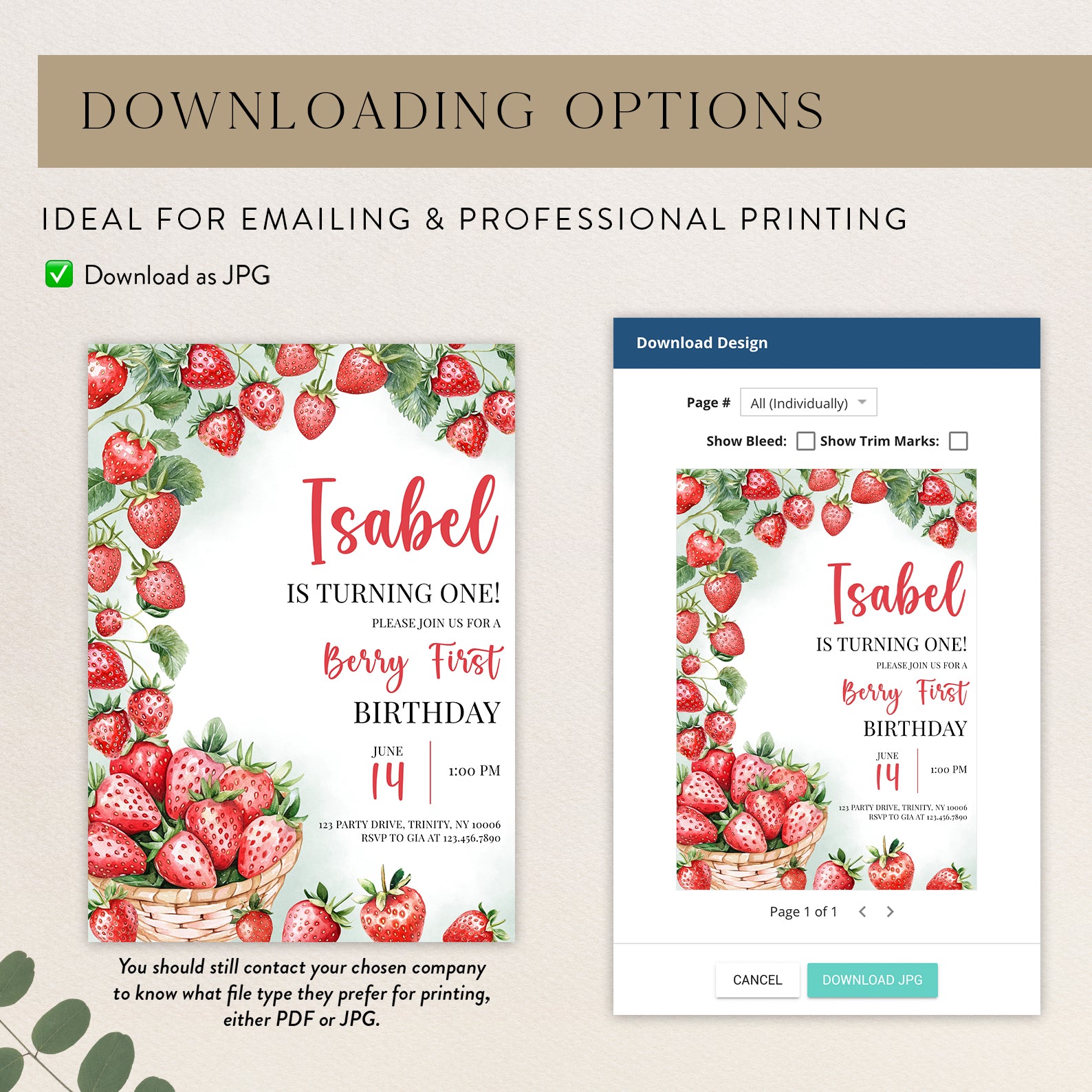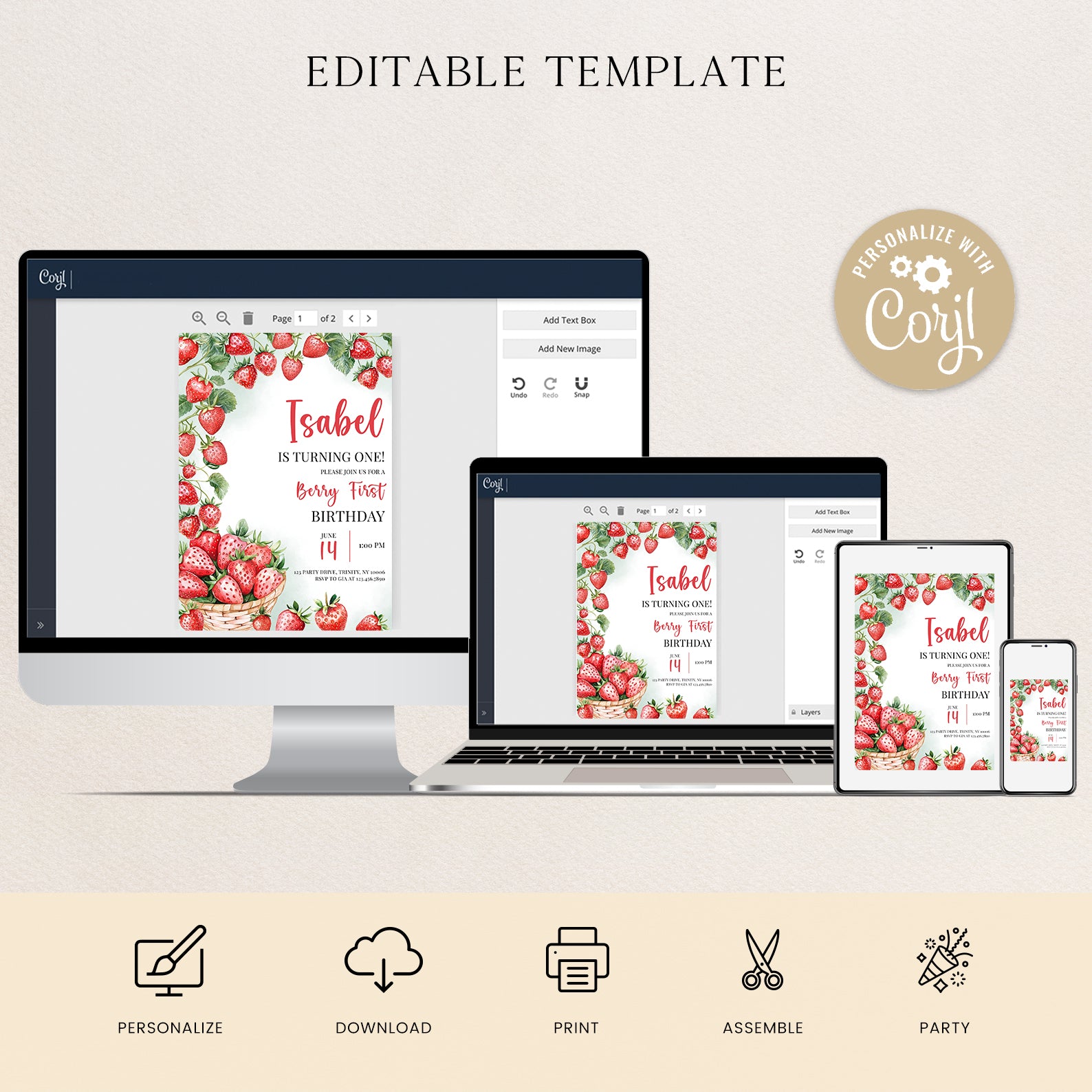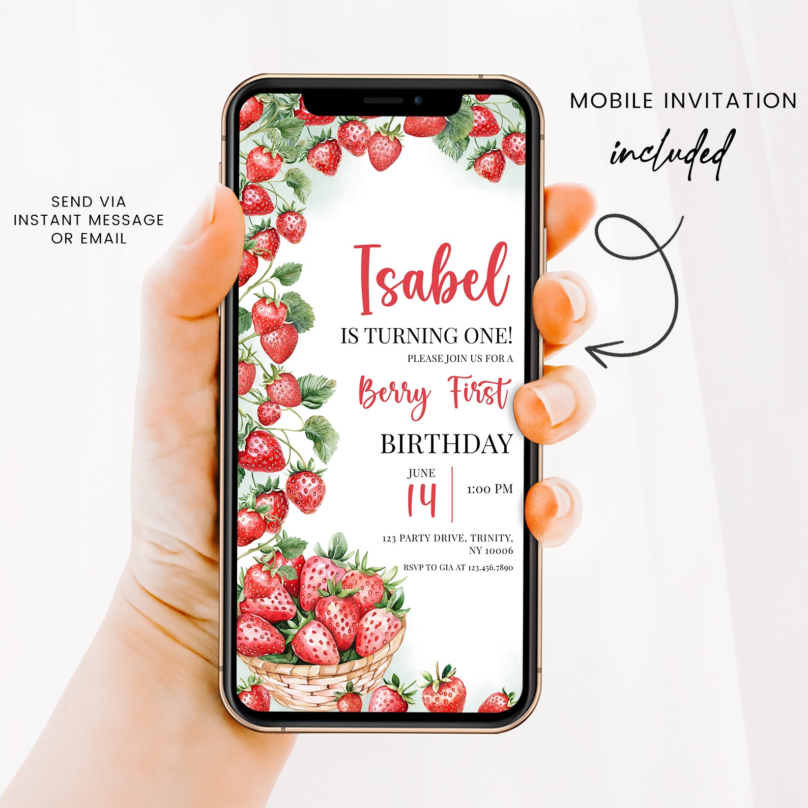 - Purchase this Summer 1st Birthday Invite with Watercolor Strawberry Vine template