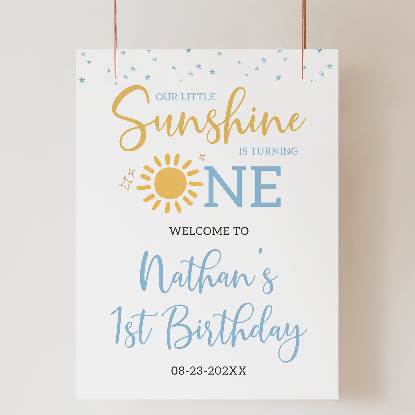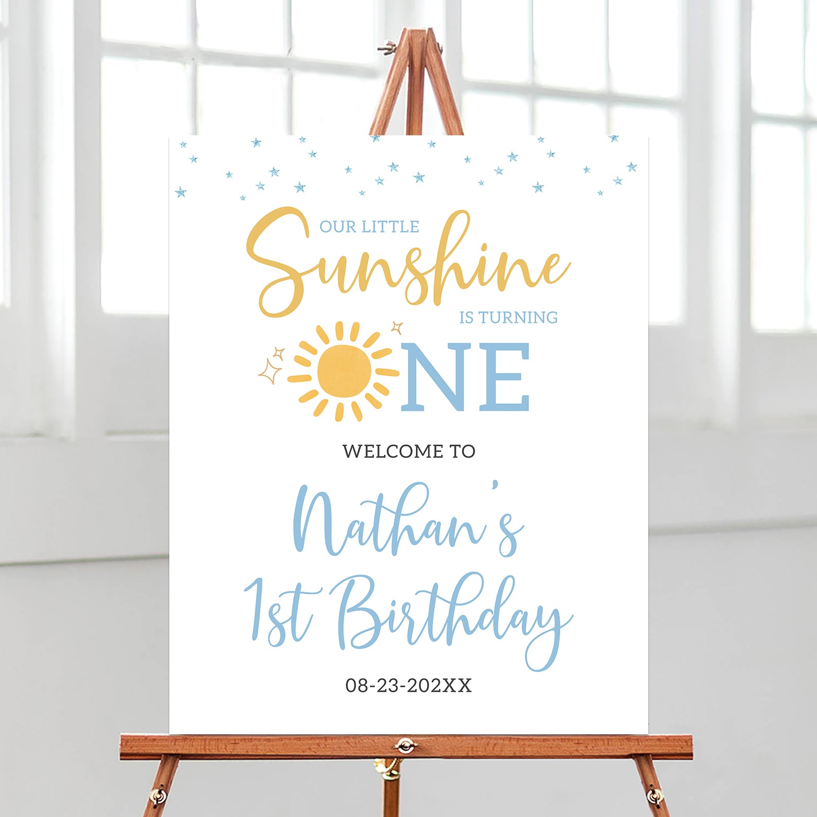 Brighten up your little one's first birthday with this adorable "Our Little Sunshine" welcome sign! Designed in a cheerful blue and yellow theme, it features a playful sun and twinkling blue stars, creating a warm and inviting atmosphere. Perfect for summer celebrations, this sign sets the tone for a joyful day filled with laughter and love. Display it at your party entrance to welcome guests and add a sunny touch to your special event!