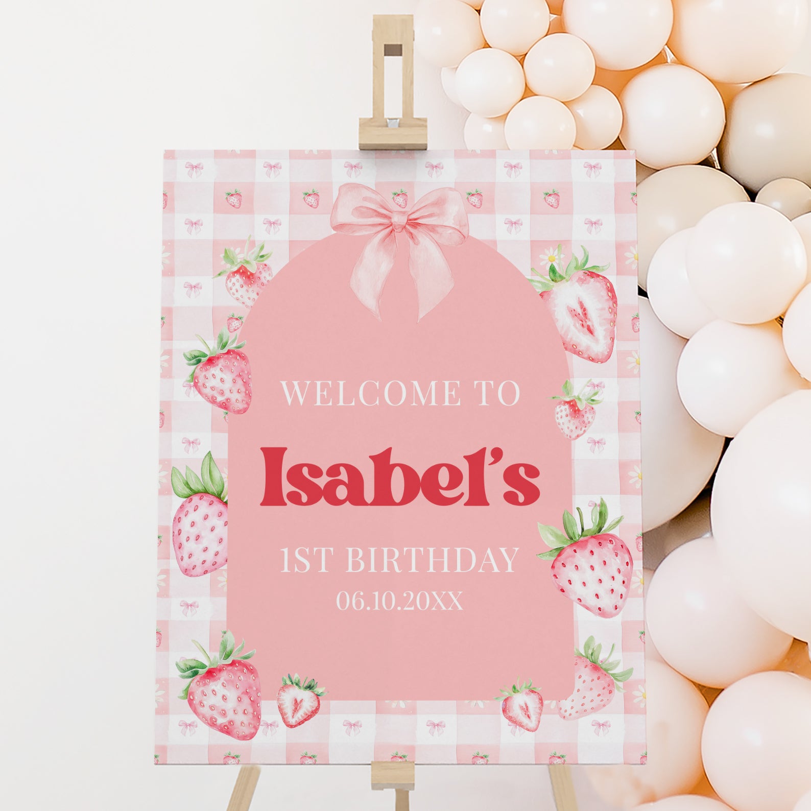 Greet your guests with a sweet and cheerful welcome sign that sets the perfect tone for your little one’s first birthday! This summer-inspired design features a soft pink arch adorned with a pastel pink ribbon, surrounded by fresh watercolor strawberries and a charming pink checkered background. Whimsical daisies add a playful touch, making this sign a delightful focal point for your celebration. Whether displayed at the entrance or near your dessert table, this enchanting welcome sign will make a beautiful and memorable first impression at your child's milestone event!