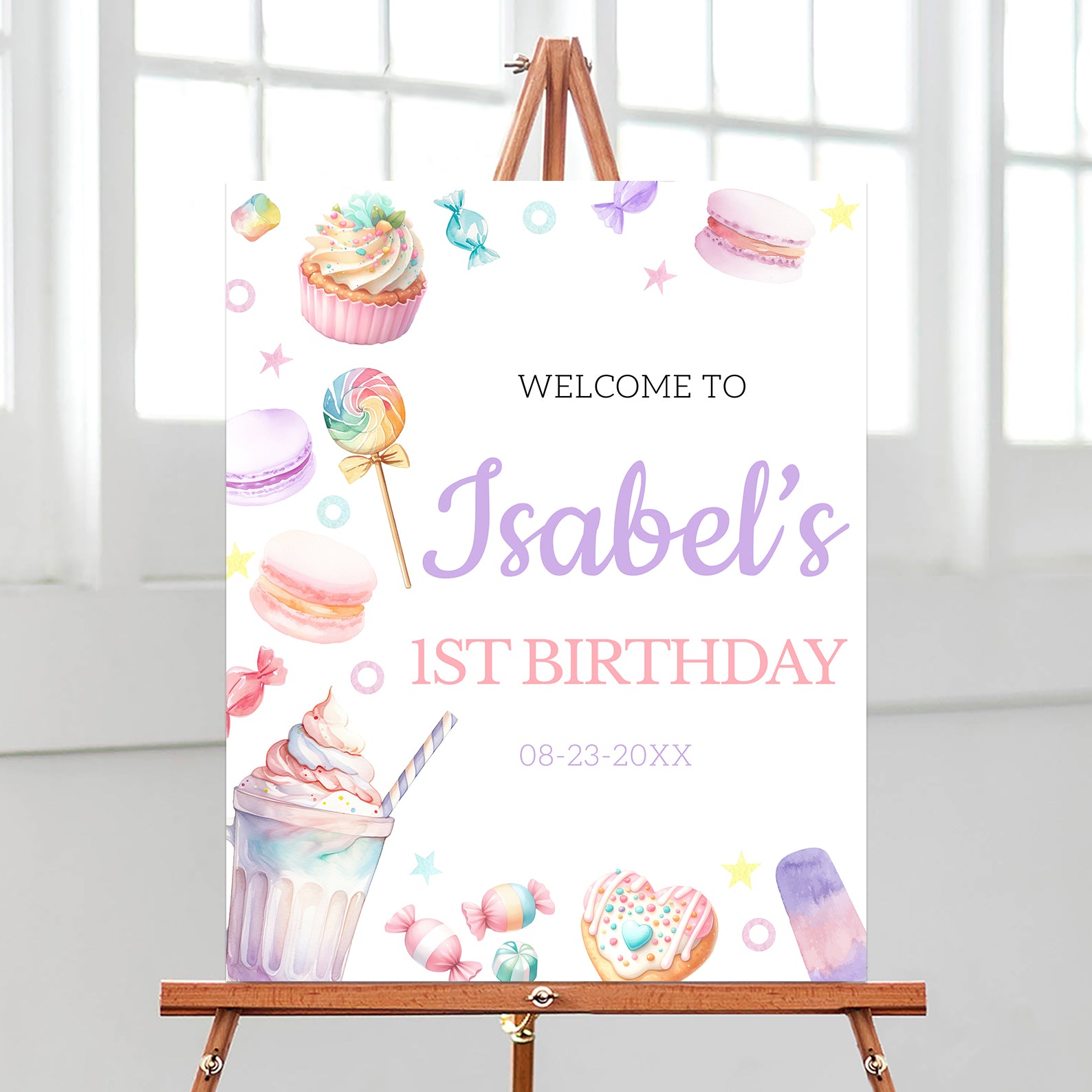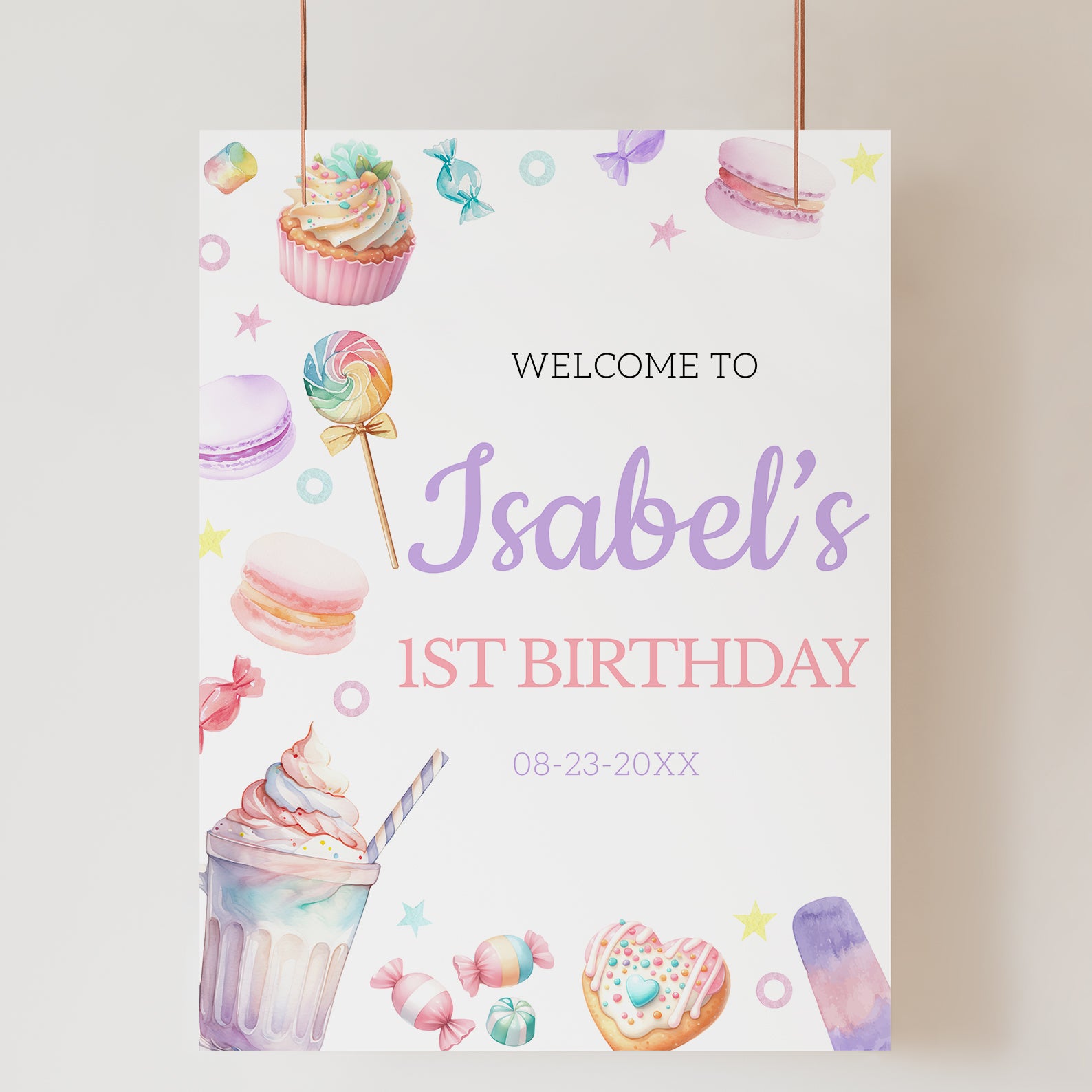 Welcome your guests to a sweet and delightful celebration with this charming birthday welcome sign! Designed with an enchanting array of macarons, candies, cupcakes, milkshakes, and cookies, this sign is the perfect addition to your little one's special day. Whether displayed at the entrance, dessert table, or photo booth area, this whimsical design sets a festive tone and captures the joy of childhood. Easy to customize, this welcome sign will ensure your celebration is unforgettable and full of sweetness from the moment guests arrive!