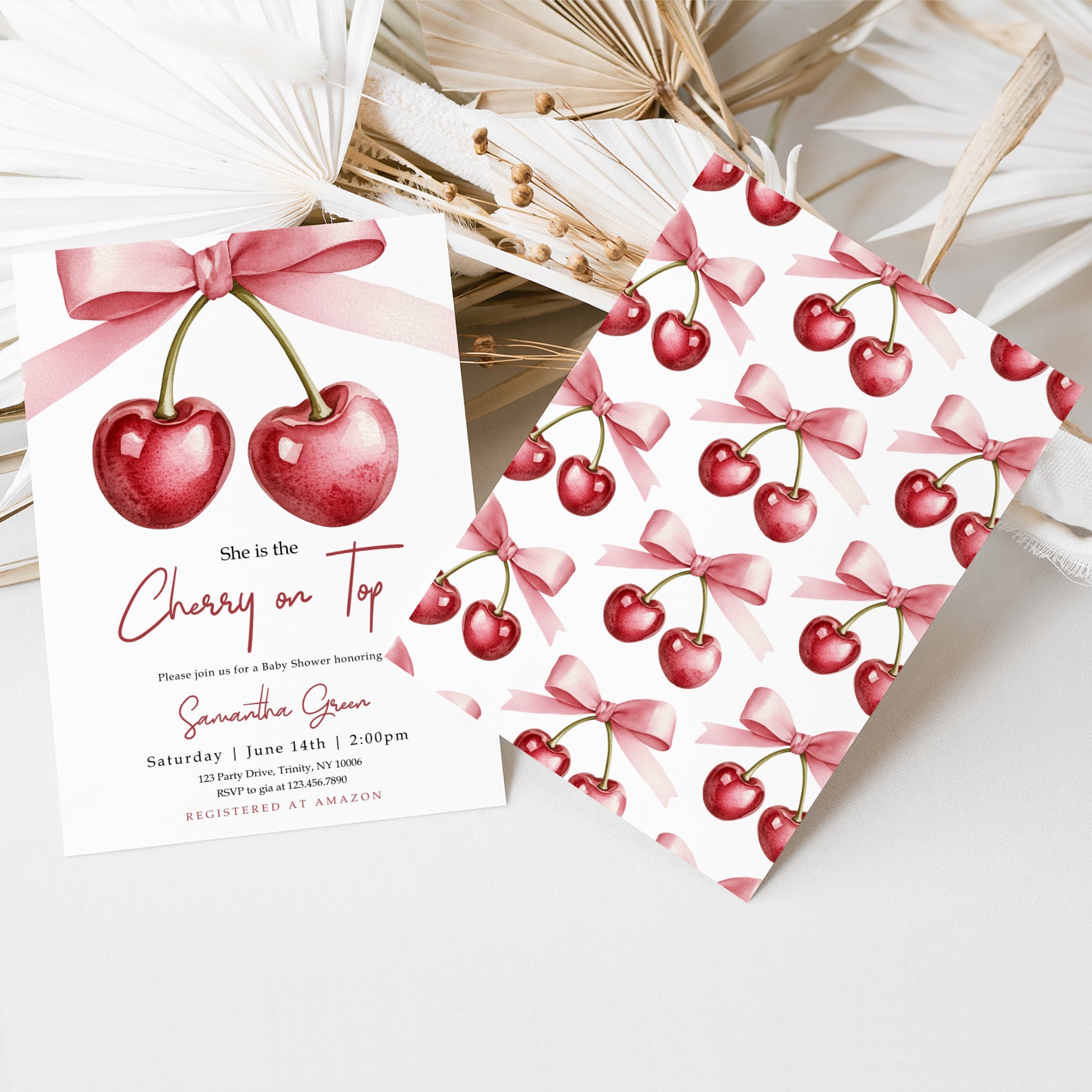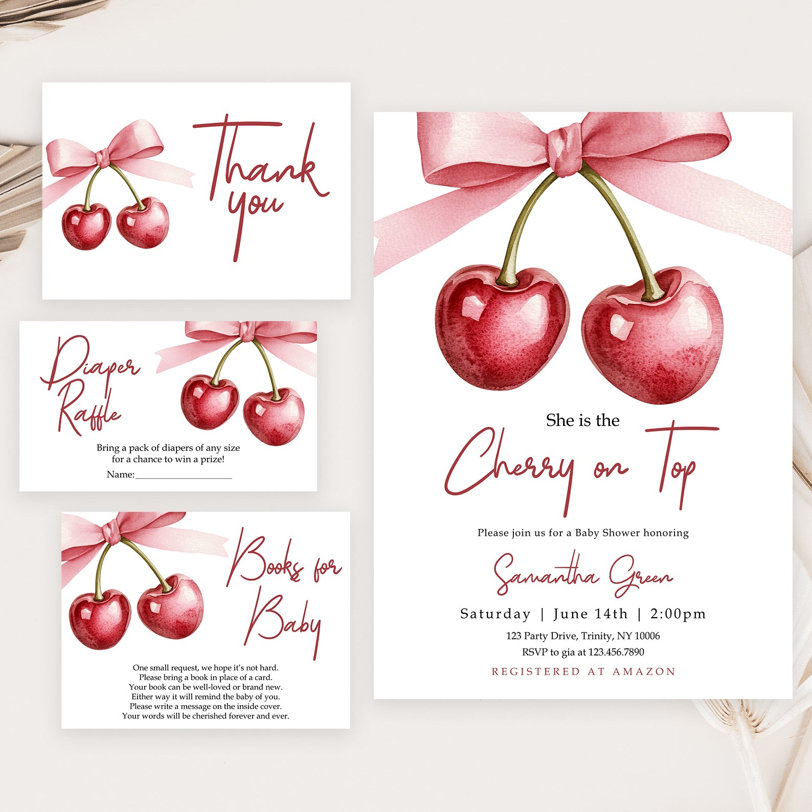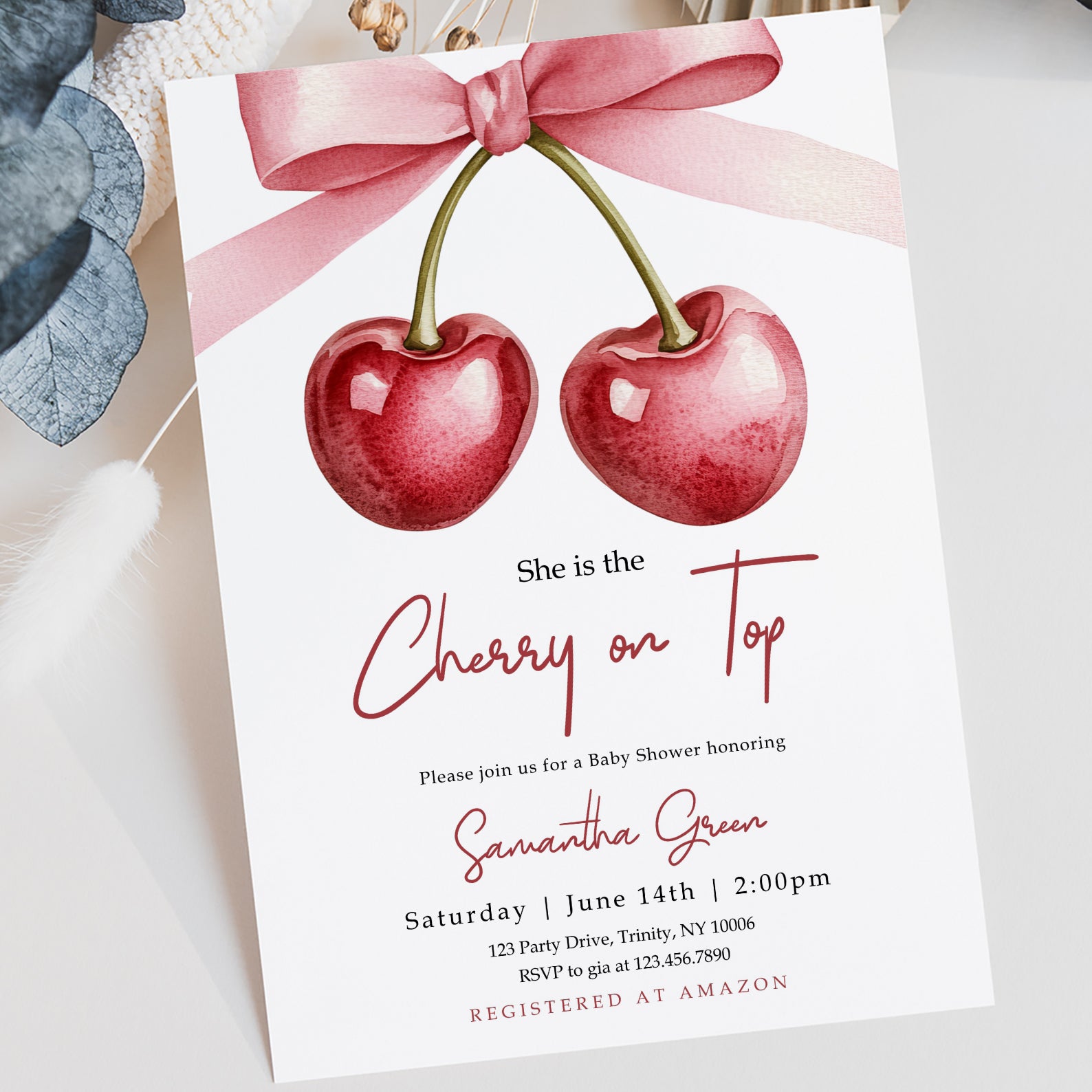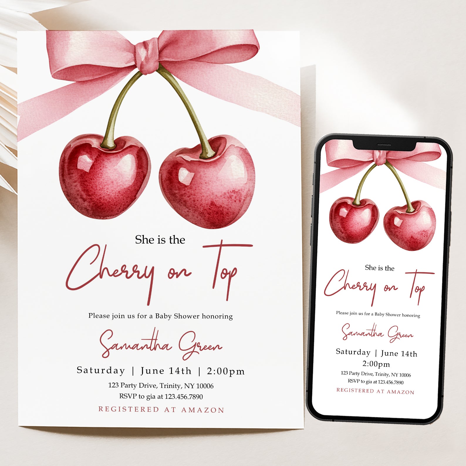 - Purchase this Cherry on Top Baby Shower Digital Invite Bundle with Pink Ribbon template