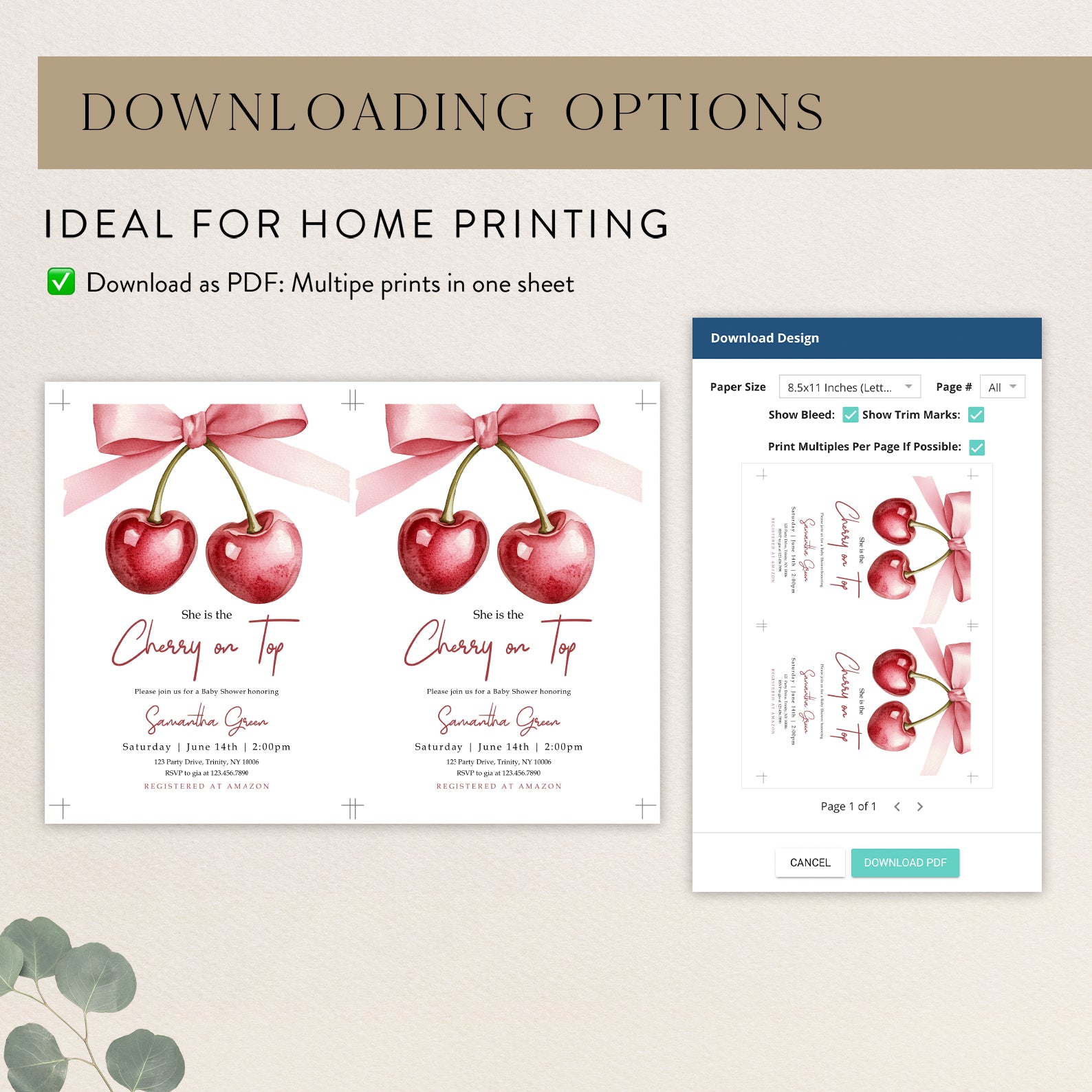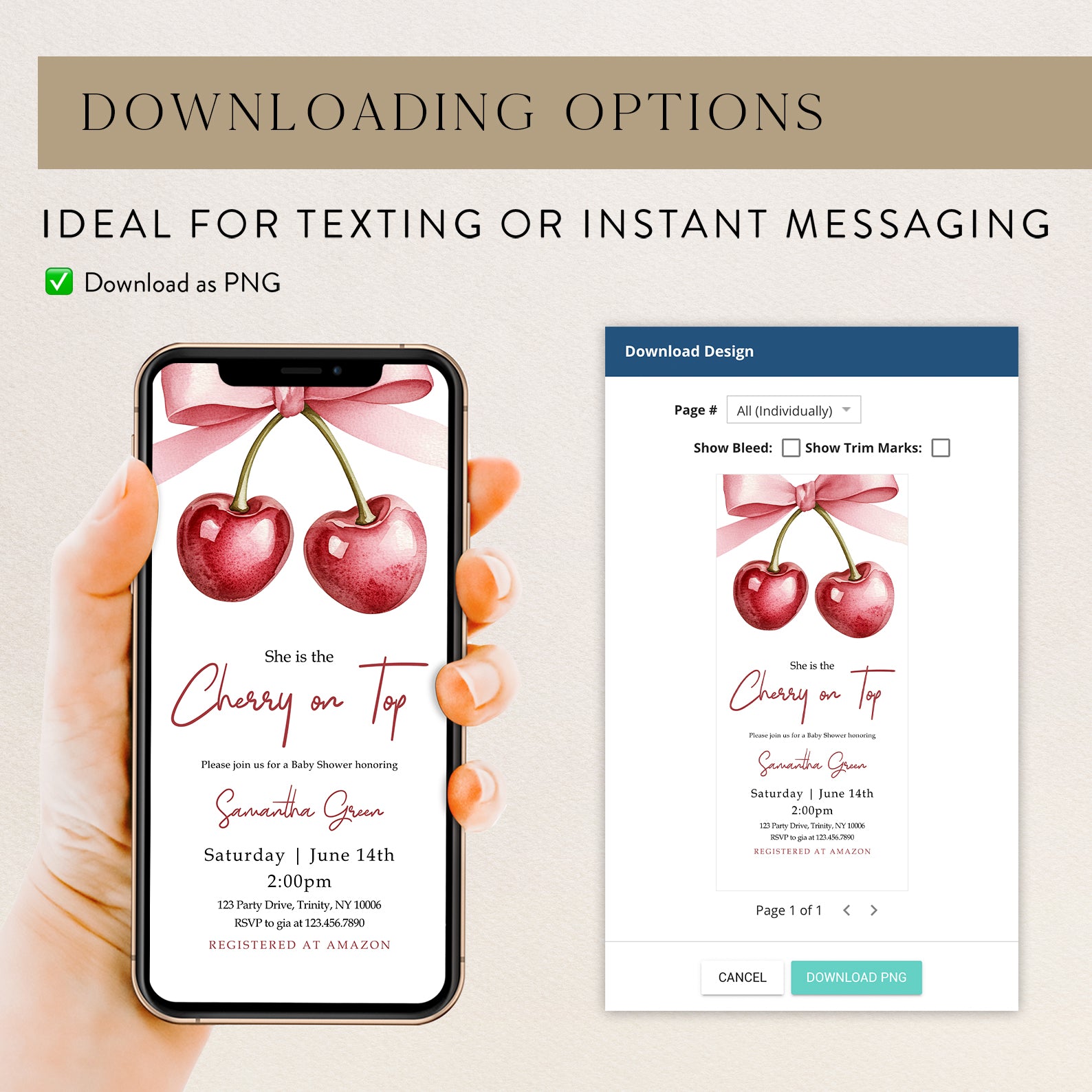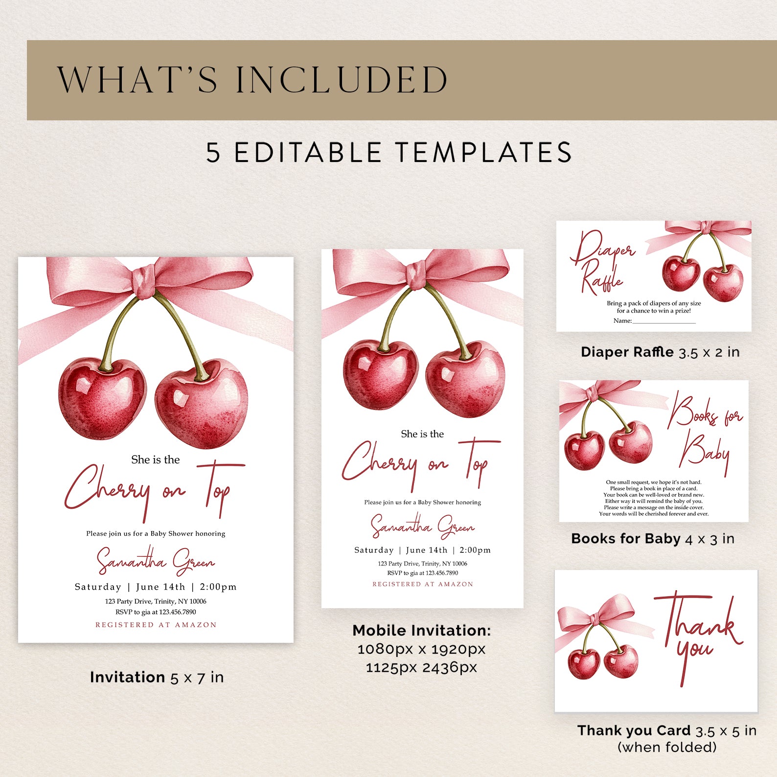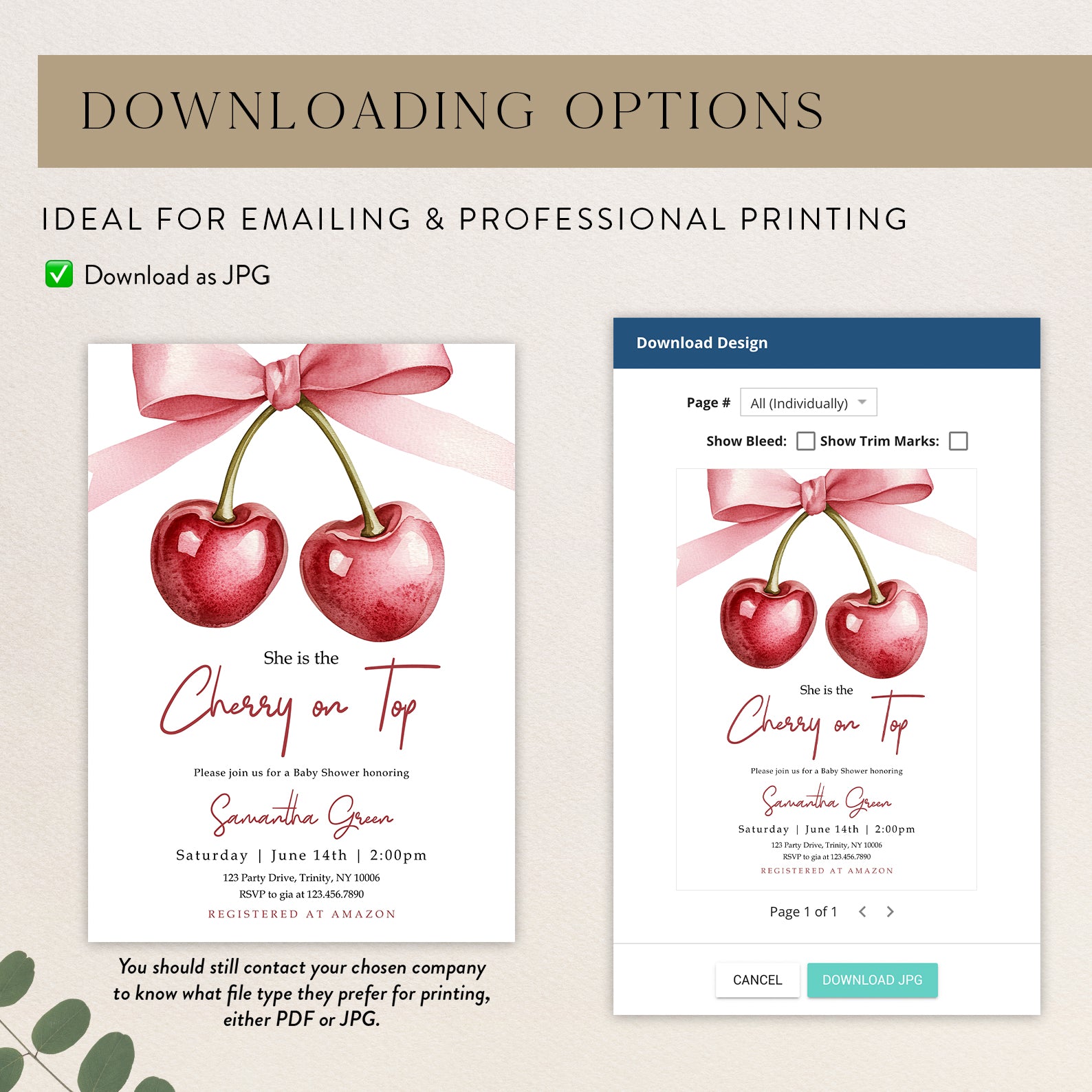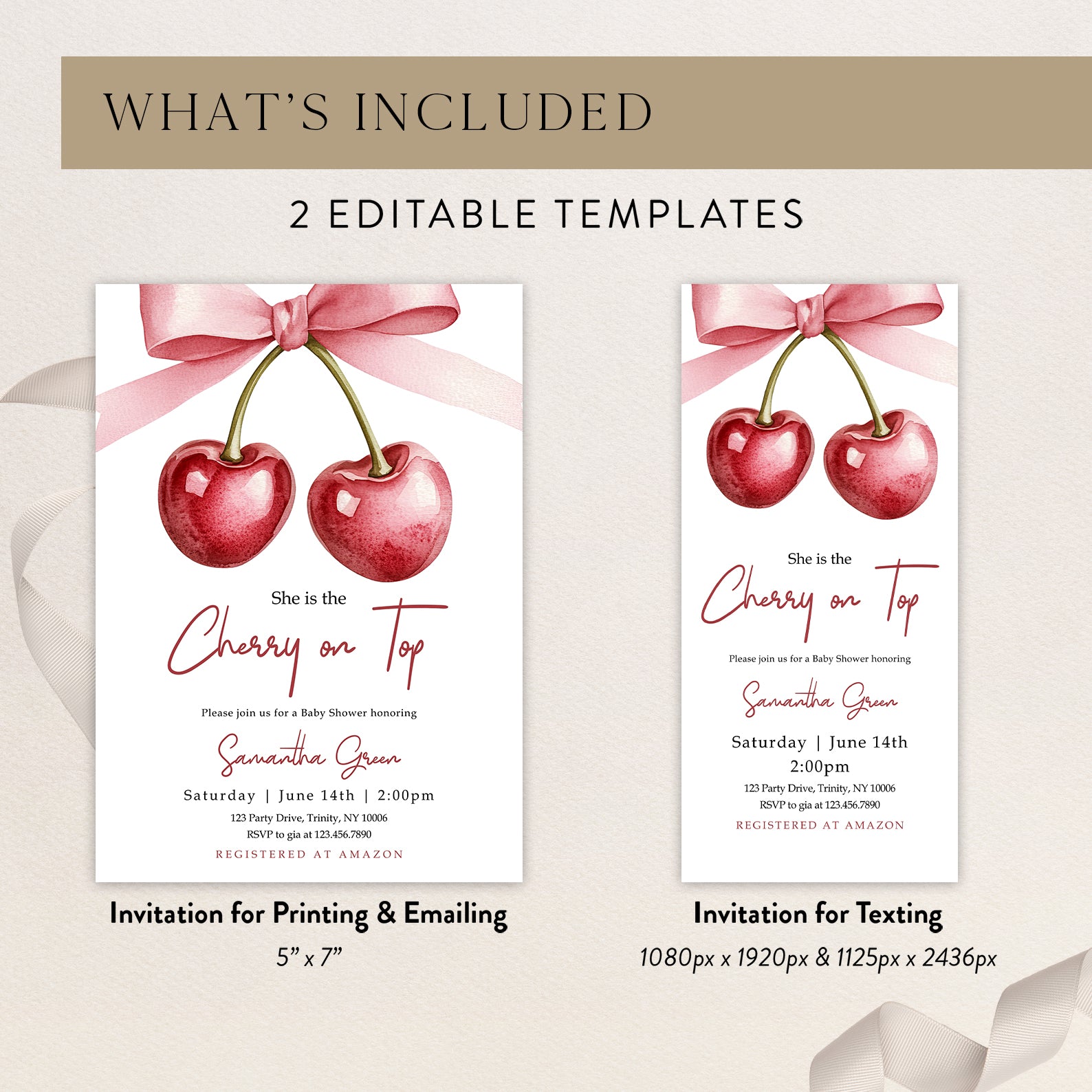 - Purchase this Cherry on Top Baby Shower Digital Invite Bundle with Pink Ribbon template