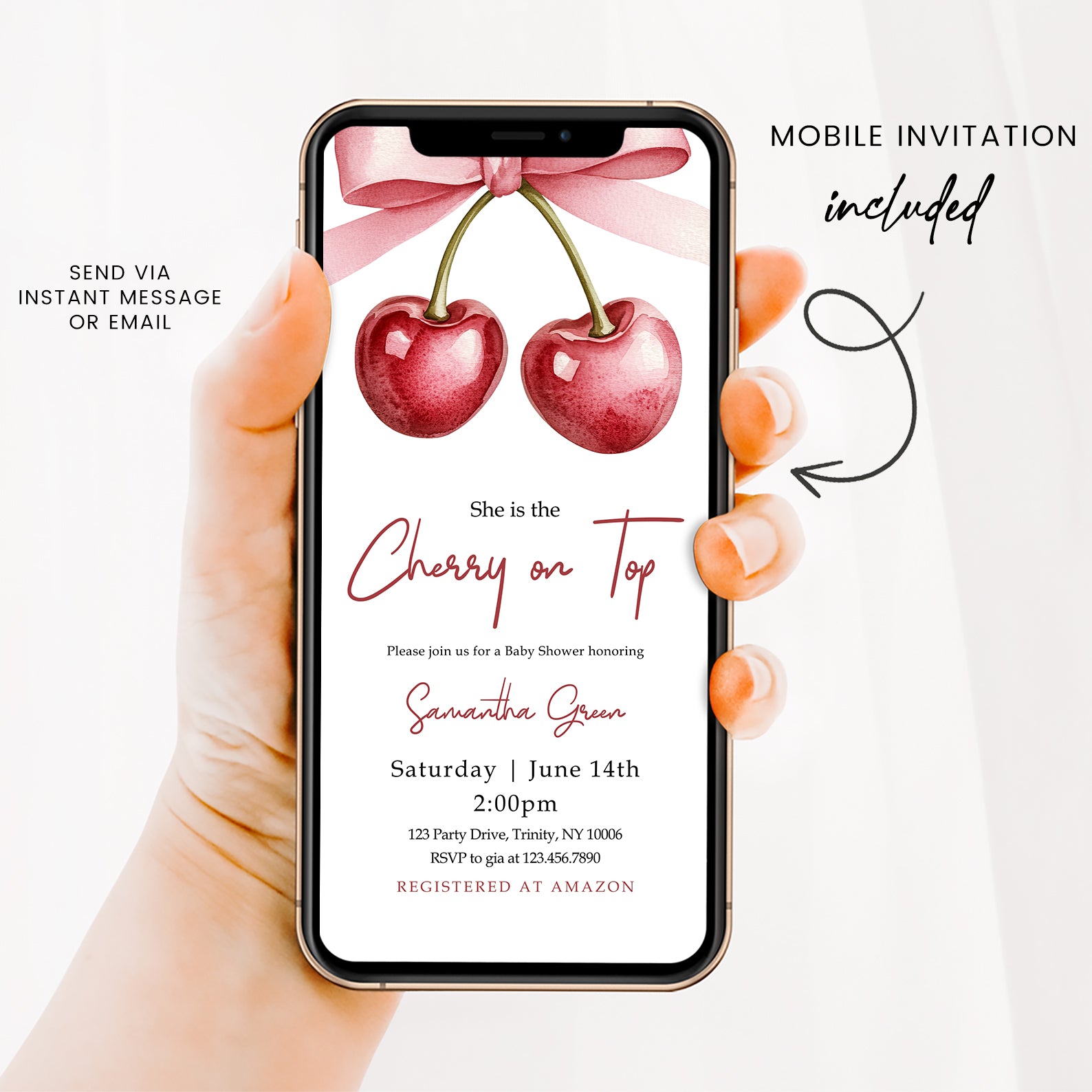 Cherry on Top Baby Shower Digital Invite Bundle with Pink Ribbon