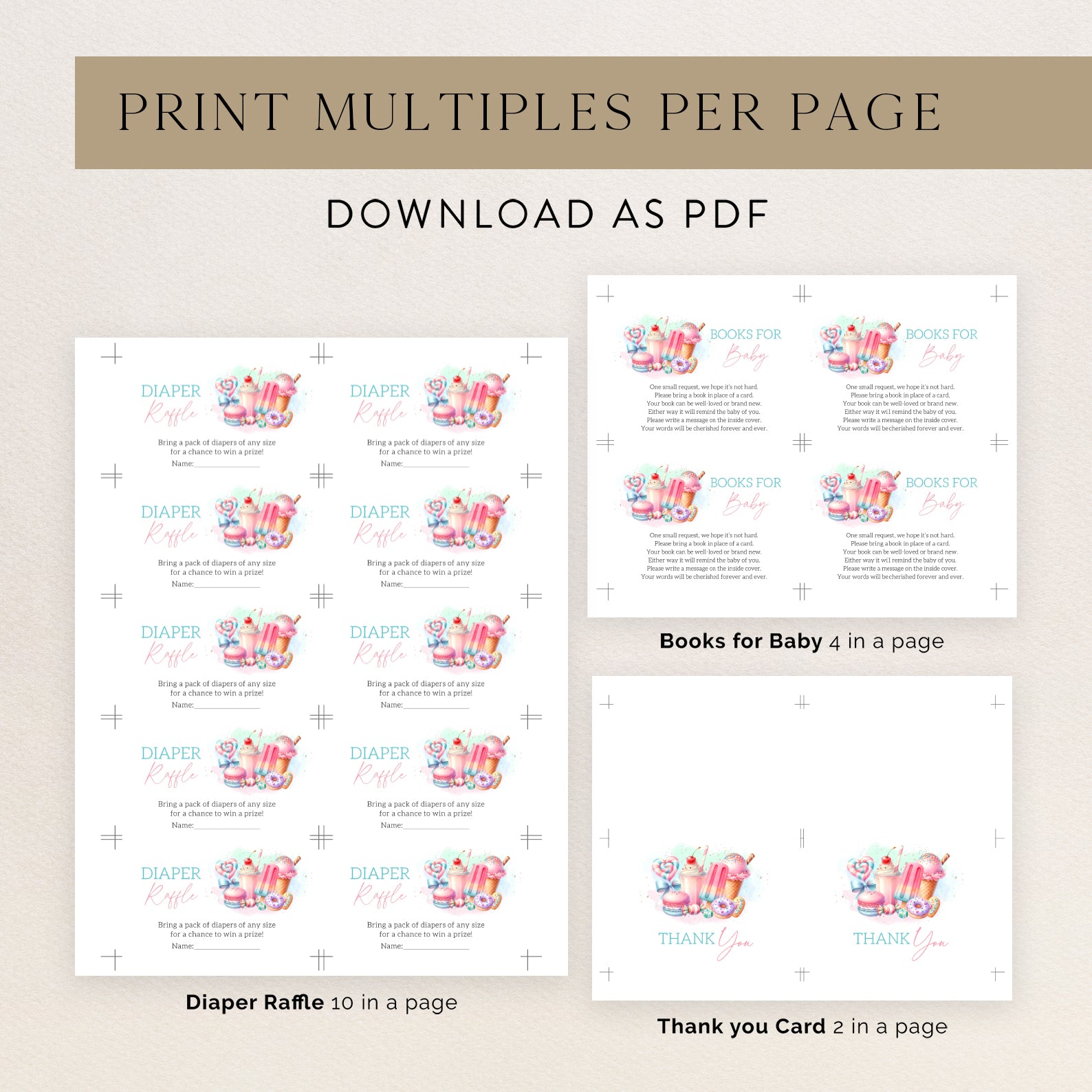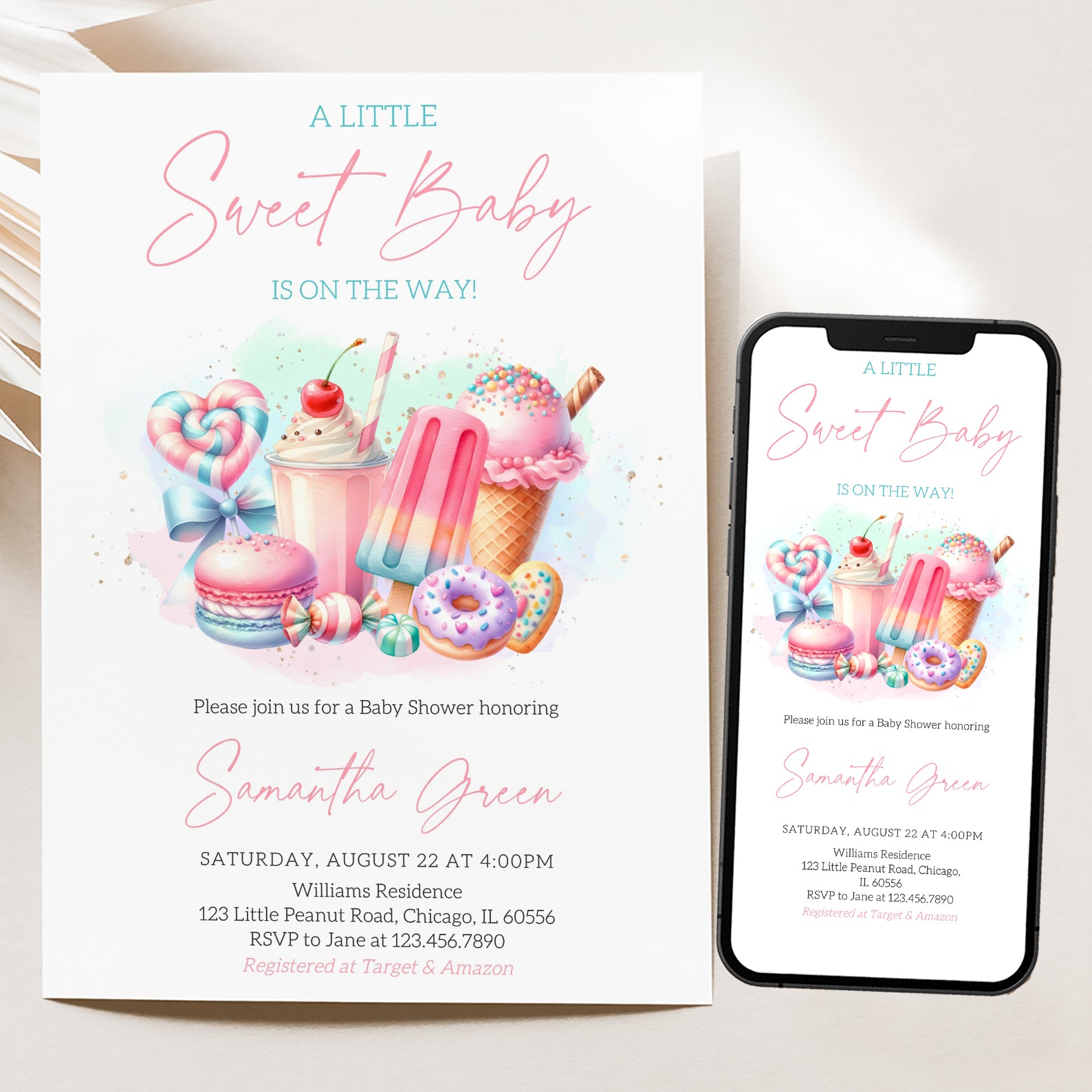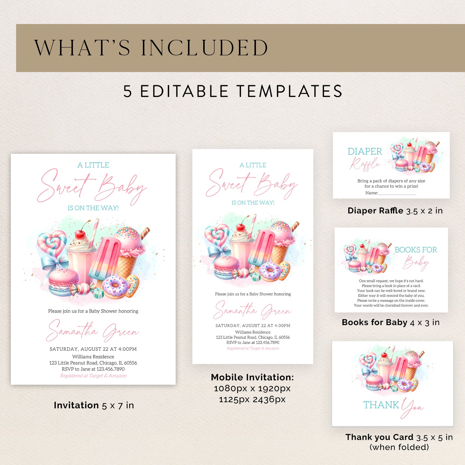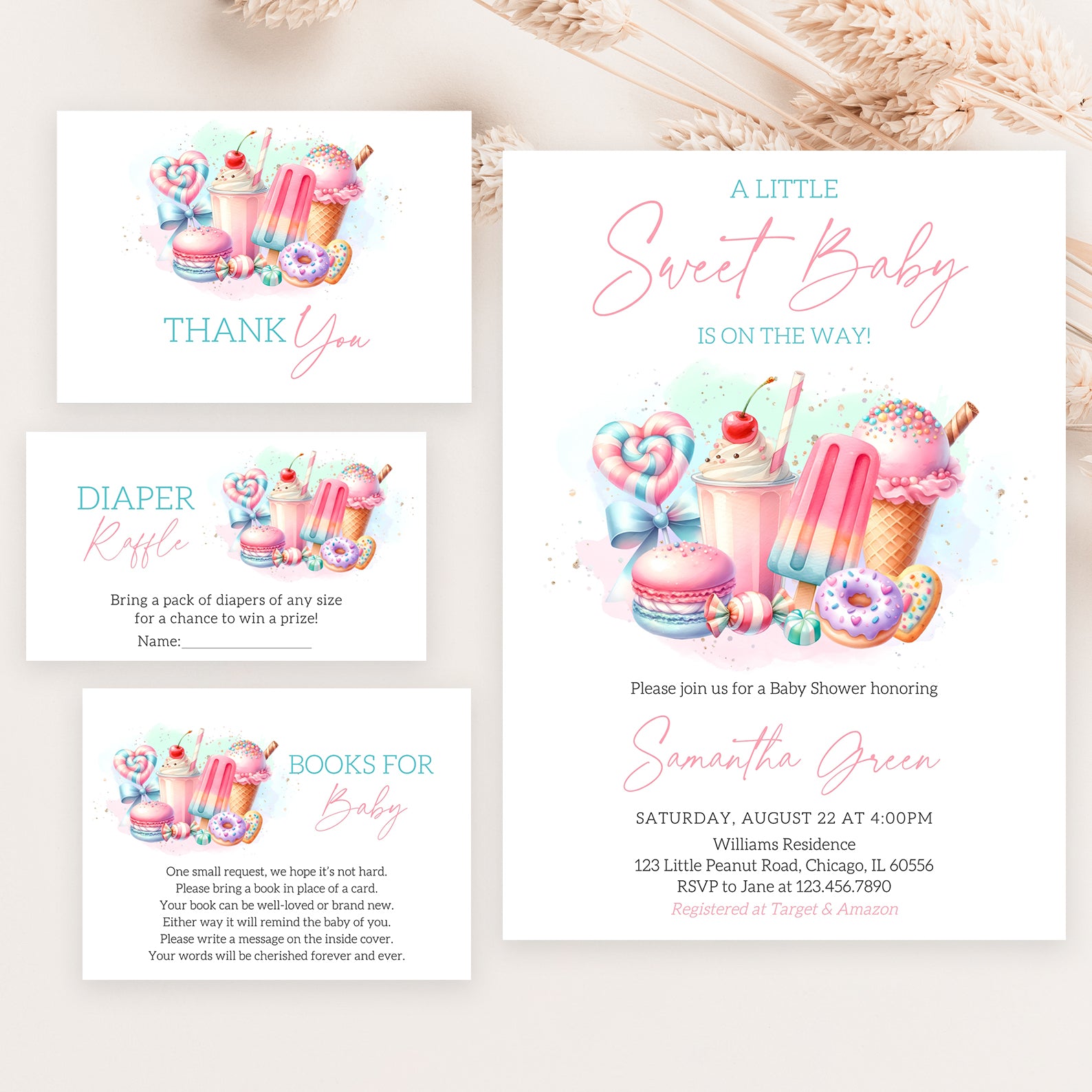 Celebrate your little one with this sweet summer baby shower bundle! Featuring an invitation, mobile invite, diaper raffle, books for baby, and thank you card, each design showcases delightful treats like milkshakes, macarons, and candies with elegant gold accents. Perfect for a fun and memorable celebration!