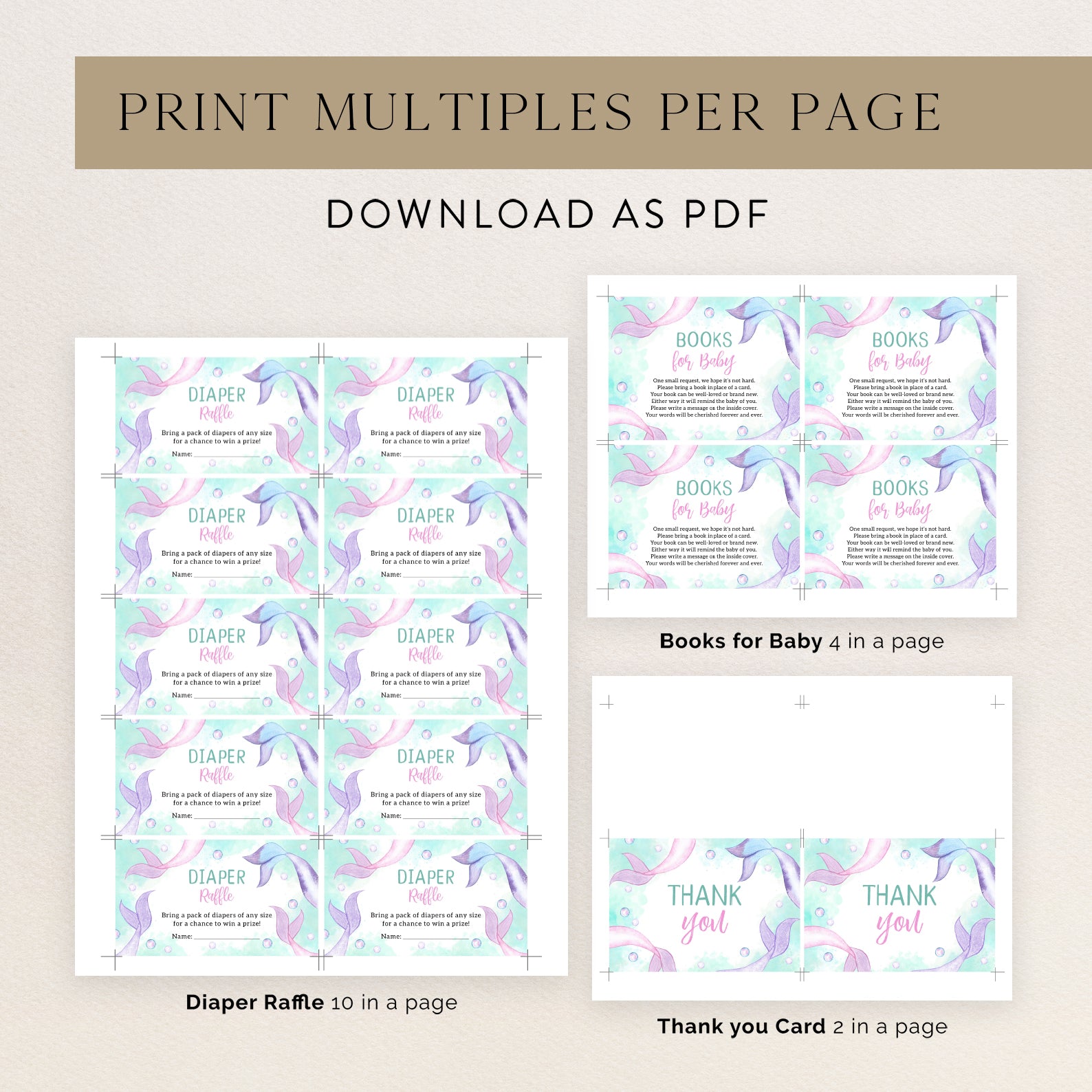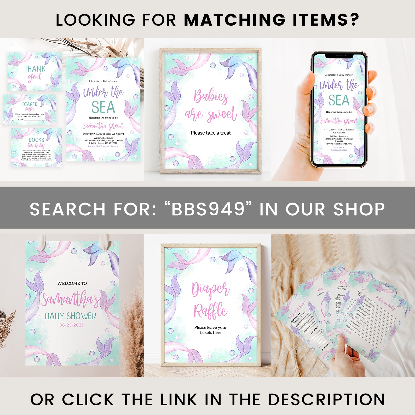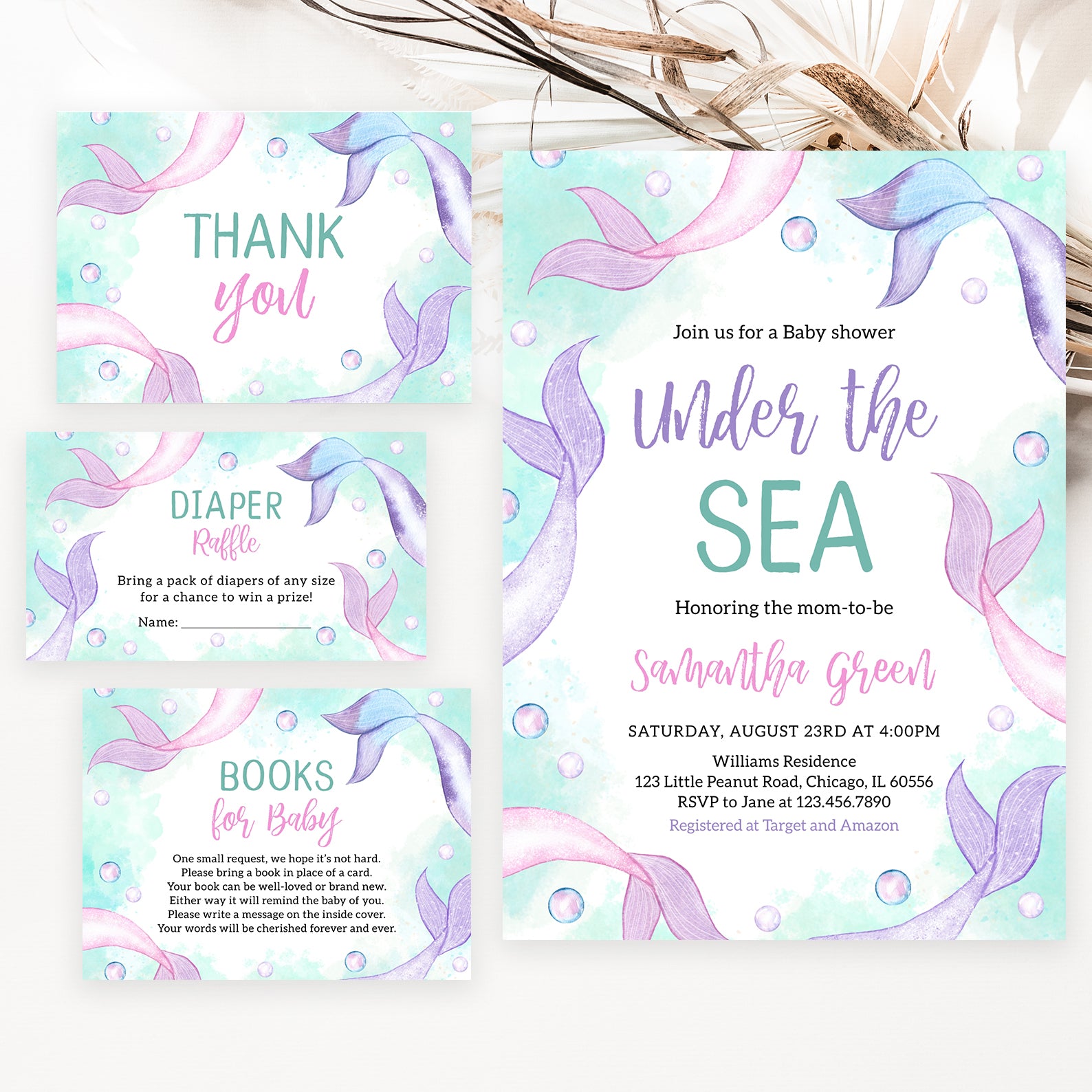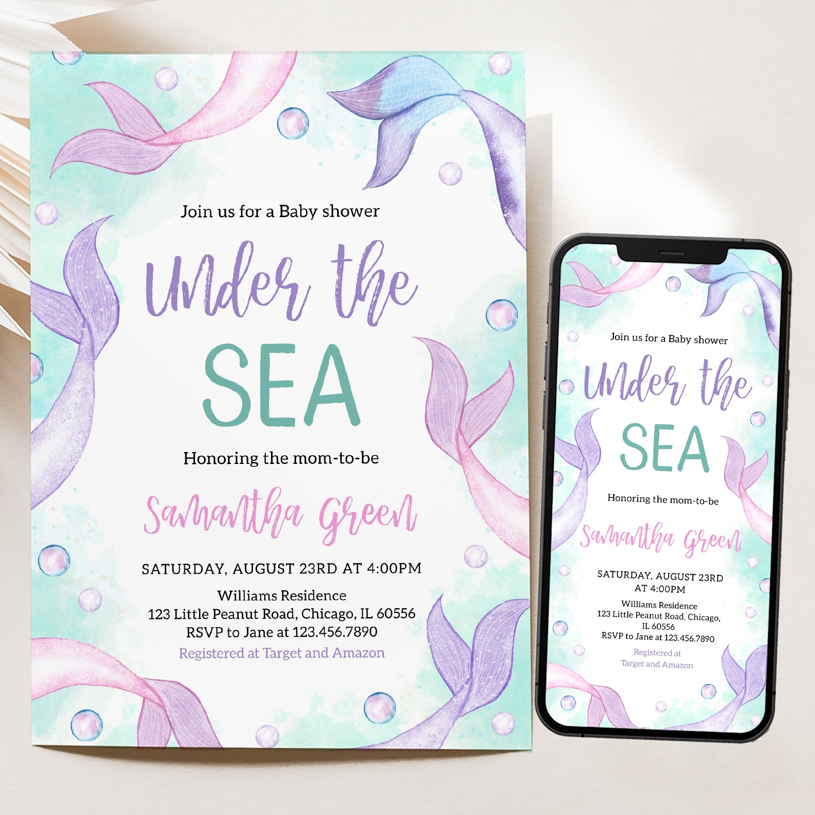 Celebrate your little one's arrival with our enchanting under-the-sea baby shower invitation bundle! Featuring whimsical pink and purple mermaid tails and playful bubbles, this vibrant design sets a joyful tone for your ocean-inspired celebration. Easy to customize and share, it's perfect for creating lasting memories.